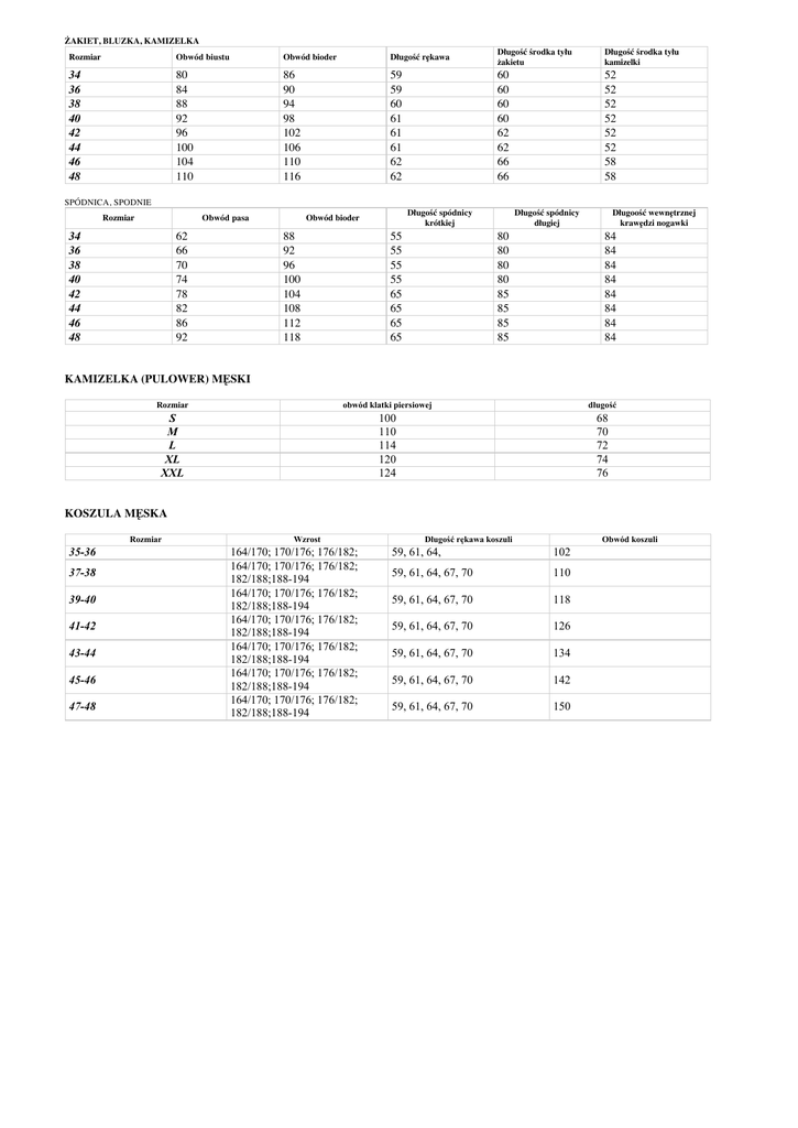 ŻAKIET, BLUZKA, KAMIZELKA Rozmiar Obwód biustu Obwód bioder Długość rękawa Długość środka tyłu żakietu Długość środka tyłu kamizelki 34 36 38 40 42 44 46 48 80 84 88 92 96 100 104 110 86 90 94 98 102 106 110 116 59 59 60 61 61 61 62 62 60 60 60 60 62 62 66 66 52 52 52 52 52 52 58 58 SPÓDNICA, SPODNIE Rozmiar Obwód pasa 34 36 38 40 42 44 46 48 62 66 70 74 78 82 86 92 Długość spódnicy krótkiej Obwód bioder 88 92 96 100 104 108 112 118 55 55 55 55 65 65 65 65 Długość spódnicy długiej 80 80 80 80 85 85 85 85 Długoość wewnętrznej krawędzi nogawki 84 84 84 84 84 84 84 84 KAMIZELKA (PULOWER) MĘSKI Rozmiar obwód klatki piersiowej długość S M L XL XXL 100 110 114 120 124 68 70 72 74 76 KOSZULA MĘSKA Rozmiar 35-36 37-38 39-40 41-42 43-44 45-46 47-48 Wzrost 164/170; 170/176; 176/182; 164/170; 170/176; 176/182; 182/188;188-194 164/170; 170/176; 176/182; 182/188;188-194 164/170; 170/176; 176/182; 182/188;188-194 164/170; 170/176; 176/182; 182/188;188-194 164/170; 170/176; 176/182; 182/188;188-194 164/170; 170/176; 176/182; 182/188;188-194 Długość rękawa koszuli Obwód koszuli 59, 61, 64, 102 59, 61, 64, 67, 70 110 59, 61, 64, 67, 70 118 59, 61, 64, 67, 70 126 59, 61, 64, 67, 70 134 59, 61, 64, 67, 70 142 59, 61, 64, 67, 70 150