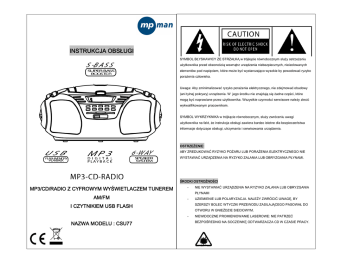INSTRUKCJA OBSŁUGI SYMBOL BŁYSKAWICY ZE STRZAŁKĄ w trójkącie równobocznym służy ostrzeżeniu użytkownika przed obecnością wewnątrz urządzenia niebezpiecznych, nieizolowanych elementów pod napięciem, które może być wystarczająco wysokie by powodować ryzyko porażenia człowieka. Uwaga: Aby zminimalizować ryzyko porażenia elektrycznego, nie zdejmować obudowy (ani tylnej pokrywy) urządzenia. W jego środku nie znajdują się żadne części, które mogą być naprawiane przez użytkownika. Wszystkie czynności serwisowe należy zlecić wykwalifikowanym pracownikom. SYMBOL WYKRZYKNIKA w trójkącie równobocznym, służy zwróceniu uwagi użytkownika na fakt, że instrukcja obsługi zawiera bardzo istotne dla bezpieczeństwa informacje dotyczące obsługi, utrzymania i serwisowania urządzenia. OSTRZEŻENIE: ABY ZREDUKOWAĆ RYZYKO POŻARU LUB PORAŻENIA ELEKTRYCZNEGO NIE WYSTAWIAĆ URZĄDZENIA NA RYZYKO ZALANIA LUB OBRYZGANIA PŁYNAMI. ŚRODKI OSTROŻNOŚCI MP3/CD/RADIO Z CYFROWYM WYŚWIETLACZEM TUNEREM - NIE WYSTAWIAĆ URZĄDZENIA NA RYZYKO ZALANIA LUB OBRYZGANIA PŁYNAMI AM/FM - UZIEMIENIE LUB POLARYZACJA. NALEŻY ZWRÓCIĆ UWAGĘ, BY SZERSZY BOLEC WTYCZKI PRZEWODU ZASILAJĄCEGO PASOWAŁ DO I CZYTNIKIEM USB FLASH OTWORU W GNIEŹDZIE SIECIOWYM. - NAZWA MODELU : CSU77 NIEWIDOCZNE PROMIENIOWANIE LASEROWE: NIE PATRZEĆ BEZPOŚREDNIO NA SOCZEWKĘ ODTWARZACZA CD W CZASIE PRACY. ZASILANIE ZASILANIE BATERYJNE - OTWORZYĆ KLAPKĘ KOMORY BATERII I WŁOŻYĆ 6 BATERII TYPU LR14. NALEŻY ZWRÓCIĆ UWAGĘ NA ICH PRAWIDŁOWE UŁOŻENIE. BŁĘDNA POLARYZACJA SPOWODUJE, ŻE URZĄDZENIE NIE BĘDZIE PRACOWAŁO PRAWIDŁOWO - WAŻNE - W PRZYPADKU UŻYWANIA WYŁĄCZNIE ZASILANIA SIECIOWEGO LUB NIE UŻYWANIA URZĄDZENIA DŁUŻEJ NIŻ PRZEZ 4 TYGODNIE NALEŻY WYJĄĆ BATERIE BY UCHRONIĆ SPRZĘT OD ZNISZCZENIA W WYNIKU EWENTUALNEGO WYCIEKU BATERII ZASILANIE SIECIOWE (WBUDOWANY TRANSFORMATOR I ZASILACZ) - SPRAWDZIĆ CZY NAPIĘCIE URZĄDZENIA ODPOWIADA LOKALNEMU 1. GŁÓWNY GŁOŚNIK (LEWY) 19. GNIAZDO USB NAPIĘCIU SIECIOWEMU 2. PRZYCISK CD 20. ZMNIEJSZANIE GŁOŚNOŚCI - WŁOŻYĆ KOŃCÓWKĘ PRZEWODU ZASILAJĄCEGO DO GNIAZDA Z TYŁU 3. PRZYCISK ODTWARZANIA 21. PRZYCISK WŁĄCZANIA ON/OFF (POWER) URZĄDZENIA 4. PRZYCISK STOP CD 22. PRZYCISK USB - PRZEWÓD JEST SCHOWANY W KOMORZE BATERII 5. GŁOŚNIK GÓRNY (LEWY) 23. PRZYCISK PROG/MEM (PROGRAM. STACJI) - WŁOŻYĆ WTYCZKĘ PRZEWODU ZASILAJĄCEGO DO GNIAZDA 6. PRZEWÓD SIECIOWY I WTYCZKA 24. PRZYCISK +10 RADIO MEM SIECIOWEGO 7. ANTENA TELESKOPOWA 25. PRZYCISK EQ - NACISNĄĆ PRZYCISK WŁĄCZANIA BY WŁĄCZYĆ URZĄDZENIE 8. UCHWYT 26. ZWIĘKSZANIE GŁOŚNOŚCI WAŻNE: W PRZYPADKU WŁĄCZENIA URZĄDZENIA CAŁY WYŚWIETLACZ LCD 9. KLAPKA KOMORY BATERII 27. PRZYCISK WZMOCNIENIA BASÓW BĘDZIE PODŚWIETLONY NA NIEBIESKO. ZNACZY TO ŻE WŁĄCZNIK 10. SŁUCHAWKI(GNIAZDO SŁUCHAWKOWE) 28. PRZYCISK -10 RADIO MEM 11. KLAPKA KIESZENI CD 12. UCHWYT KLAPKI CD 13. GŁOŚNIK GÓRNY (PRAWY) 30. PRZYCISK WYBORU PASMA (RADIO/BAND) 14. CD PRZYCISK “PLAY”(ODTWARZANIE) 31. PRZYCISK STANU UŚPIENIA (SLEEP) 15. CD PRZYCISK “NEXT/UP”(NASTĘPNY) 16. CD PRZYCISK “BACK/DOWN”(POPRZEDNI) 17. WYŚWIETLACZ CYFROWY LCD 18. GŁÓWNY GŁOŚNIK (PRAWY) ZNAJDUJE SIĘ W POZYCJI “ON” 29. FOLDER PRZYCISK FM-MONO/STEREO AUTOMATYCZNE WYŁĄCZANIE /STAN UŚPIENIA - URZĄDZENIE JEST WYPOSAŻONE W FUNKCJĘ TIMERA, KTÓRY MOŻE JE AUTOMATYCZNIE WYŁĄCZYĆ. - W KAŻDYM MOMENCIE PODCZAS DZIAŁANIA URZĄDZENIA (ODTWARZACZ CD LUB RADIO) MOŻNA NACISKAĆ PRZYCISK SLEEP BY WYBRAĆ CZAS, PO KTÓRYM NASTĄPI JEGO AUTOMATYCZNE WYŁĄCZENIE. CZAS UŚPIENIA PO KOLEJNYCH NACIŚNIĘCIACH PRZYCISKU SLEEP 90 MIN->80 MIN ->70 MIN->60 MIN->50 MIN->40 MIN->30 MIN->20 MIN->10 MIN>FUNKCJA WYŁĄCZONA ELEKTRONICZNA REGULACJA GŁOŚNOŚCI - URZĄDZENIE POSIADA ELEKTRONICZNĄ REGULACJĘ GŁOŚNOŚCI STEROWANĄ ZA POMOCĄ PRZYCISKÓW - ABY ZWIĘKSZYĆ LUB ZMNIEJSZYĆ GŁOŚNOŚĆ NACISKAĆ ODPOWIEDNIO NA PRZYCISK ZWIĘKSZANIA (VOL +) LUB ZMNIEJSZANIA (VOL -) GŁOŚNOŚCI. - ZWOLNIĆ PRZYCISK, GDY GŁOŚNOŚĆ OSIĄGNIE WYMAGANY POZIOM - NIEKIEDY, ZWŁASZCZA PODCZAS SŁUCHANIA RADIA MOŻNA USŁYSZEĆ W CZASIE REGULACJI GŁOŚNOŚCI POWTARZAJĄCY SIĘ DŹWIĘK KLIKANIA. TO NORMALNY OBJAW, A DŹWIĘK USTĄPI PO ZAKOŃCZENIU REGULACJI GŁOŚNOŚCI. - POZIOM GŁOŚNOŚCI JEST POKAZYWANY NA WYŚWIETLACZU LCD W 32 STOPNIOWEJ SKALI (0 = NAJCISZEJ, 32 = NAJGŁOŚNIEJ). - WYŚWIETLACZ CYFROWY BĘDZIE POKAZYWAŁ DOKŁADNĄ CZĘSTOTLIWOŚĆ PRZY KAŻDEJ ZMIANIE POZYCJI SKALI. - PO ZNALEZIENIU POŻĄDANEJ CZĘSTOTLIWOŚCI LUB STACJI MOŻNA ZAPISAĆ JĄ W JEDNEJ Z POZYCJI PAMIĘCI (MEMORY). (ZOB. ROZDZIAŁ PAMIĘĆ STACJI RADIOWYCH). AUTOMATYCZNE WYSZUKIWANIE CZĘSTOTLIWOŚCI (TRYB WYSZUKIWANIA) - NACISNĄĆ I PRZYTRZYMAĆ (PRZEZ 2 SEKUNDY) PRZYCISK NEXT/UP LUB BACK/DOWN BY PRZEJŚĆ DO TRYBU WYSZUKIWANIA AUTOMATYCZNEGO CZĘSTOTLIWOŚCI PIERWSZEJ DOSTĘPNEJ STACJI (W GÓRĘ LUB W DÓŁ SKALI) . - WYŚWIETLACZ CYFROWY LCD POKAŻE CZĘSTOTLIWOŚĆ ZNALEZIONEJ STACJI - PO ZNALEZIENIU POŻĄDANEJ CZĘSTOTLIWOŚCI LUB STACJI MOŻNA ZAPISAĆ JĄ W JEDNEJ Z POZYCJI PAMIĘCI (MEMORY). (ZOB. ROZDZIAŁ PAMIĘĆ STACJI RADIOWYCH). PAMIĘĆ STACJI RADIOWYCH (ZAPROGRAMOWANIE STACJI W PAMIĘCI) KOREKCJA DŹWIĘKU - AKTUALNIE ODTWARZANĄ STACJĘ MOŻNA W KAŻDEJ CHWILI ZAPISAĆ NA - POWTARZAĆ NACISKANIE PRZYCISKU EQ BY WYBRAĆ EFEKT JEDNEJ Z POZYCJI PAMIĘCI URZĄDZENIA. DŹWIĘKOWY ODPOWIADAJĄCY TYPOWI SŁUCHANEJ MUZYKI: - JEDNOKROTNIE NACISNĄĆ PRZYCISK “PROG/MEM”. FLAT / CLASSIC / JAZZ / ROCK / POP - NACISKAĆ PRZYCISK “RADIO MEM+” LUB “RADIO MEM-” BY WYBRAĆ POZYCJĘ (*FLAT OZNACZA WYŁĄCZENIE KOREKCJI DŹWIĘKU) W PAMIĘCI. (MOŻNA USTAWIĆ 30 POZYCJI W PAŚMIE FM I 20 W PAŚMIE MW/AM). FUNKCJA WZMOCNIENIA BASÓW - JEDNOKROTNIE NACISNĄĆ PRZYCISK “PROG/MEM” BY ZAPISAĆ STACJĘ NA - WBUDOWANA FUNKCJA “PODBICIA BASÓW”, KTÓRA ZAPEWNIA WYBRANEJ POZYCJI PAMIĘCI. WYJĄTKOWE WZBOGACENIE BRZM