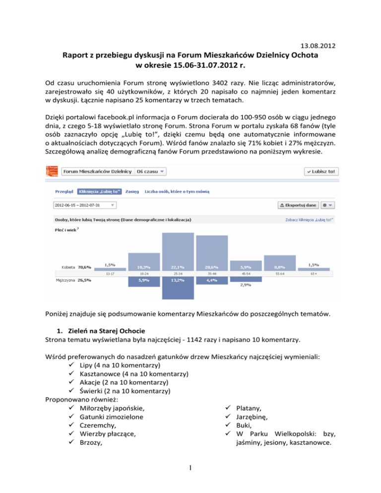 13.08.2012 Raport z przebiegu dyskusji na Forum Mieszkańców Dzielnicy Ochota w okresie 15.06-31.07.2012 r. Od czasu uruchomienia Forum stronę wyświetlono 3402 razy. Nie licząc administratorów, zarejestrowało się 40 użytkowników, z których 20 napisało co najmniej jeden komentarz w dyskusji. Łącznie napisano 25 komentarzy w trzech tematach. Dzięki portalowi facebook.pl informacja o Forum docierała do 100-950 osób w ciągu jednego dnia, z czego 5-18 wyświetlało stronę Forum. Strona Forum w portalu zyskała 68 fanów (tyle osób zaznaczyło opcję „Lubię to!”, dzięki czemu będą one automatycznie informowane o aktualnościach dotyczących Forum). Wśród fanów znalazło się 71% kobiet i 27% mężczyzn. Szczegółową analizę demograficzną fanów Forum przedstawiono na poniższym wykresie. Poniżej znajduje się podsumowanie komentarzy Mieszkańców do poszczególnych tematów. 1. Zieleń na Starej Ochocie Strona tematu wyświetlana była najczęściej - 1142 razy i napisano 10 komentarzy. Wśród preferowanych do nasadzeń gatunków drzew Mieszkańcy najczęściej wymieniali: Lipy (4 na 10 komentarzy) Kasztanowce (4 na 10 komentarzy) Akacje (2 na 10 komentarzy) Świerki (2 na 10 komentarzy) Proponowano również: Platany, Miłorzęby japońskie, Gatunki zimozielone Jarzębinę, Czeremchy, Buki, Wierzby płaczące, W Parku Wielkopolski: bzy, Brzozy, jaśminy, jesiony, kasztanowce. 1 Dodatkowo Mieszkańcy zwrócili uwagę na: historyczne zasady obsadzania roślinności przyulicznej, w tym zachowanie jednego rodzaju drzew dla jednej ulicy, np. ul. Uniwersytecka - lipy, ul. Mianowskiego – klony, ul. Pługa – akacje, ul. Mochnackiego – jarzębiny. Klony srebrzyste przy ul. Mochnackiego – potrzebę ochrony 2 drzew oraz odrostów z pozostałych pni, Potrzebę ochrony roślin przed solą, Konieczność poprawy pielęgnacji zieleni – w tym celu np. kontrola społeczna nad działaniem firm, zajmujących się pielęgnacją zieleni, aby nie dopuszczać do zaniedbywania przez nie obowiązków – wniosek o podanie do publicznej wiadomości danych firm i ich zadań. 2. Zieleń na „małej” Filtrowej Strona tematu wyświetlona została 564 razy i napisano 3 komentarze. Mieszkańcy zwrócili się o: niepodwyższanie krawężników wokół drzew, ochronę miejsc parkingowych dla mieszkańców posesji przy tej części ul. Filtrowej, np. poprzez utworzenie parkometrów lub przydzielenie konkretnych miejsc mieszkańcom, ochronę (nieusuwalnie) głogów. Ponadto: zasygnalizowano potrzebę indywidualnych konsultacji w przypadku planowania poszerzenia lub wydłużenia pasów zieleni przy ulicy, zwracając uwagę na planowane przez Mieszkańców rozbudowy podjazdów do posesji. zwrócono uwagę, że zieleń w tej części ul. Filtrowej jest w dobrym stanie i należy skupić się na odcinku od pl. Narutowicza do ul. Krzyckiego. 3. Propozycje tematów na Forum Strona tematu wyświetlona została 674 razy i napisano najwięcej - 13 komentarzy. Proponowane tematy do dyskusji to: 1. Parkingi 2. Ścieżki rowerowe 3. Bezpieczeństwo na ulicach 4. Place zabaw 5. Torowiska tramwajowe 6. Sieć dostępu do Internetu (hot spoty) 2 1. Parkingi Ogródek przy ul. Zapolskiej, k/Teatru Ochoty) Budowa nadziemnych lub podziemnych parkingów, np. pod boiskami Przeniesienie parkingów z chodników na ulice (równolegle) Konsultacje – w jakich miejscach mogłyby powstać parkingi? Próba włączenia mieszkańców do realiów kosztowych, próba znalezienia alternatywnych rozwiązań Warsztaty z ekspertami 2. Ścieżki rowerowe Potrzeba nowych tras (np. wzdłuż ul. Żwirki i Wigury, od ul. Racławickiej do Pola Mokotowskiego) Konsultacje: dyskusja na Forum i praca na mapie – gdzie najbardziej potrzebne trasy? Ile kilometrów urząd zamierza stworzyć w najbliższych latach i jak mieszkańcy by to rozłożyli? system Veturilo Konsultacje: gdzie ustawić określoną przez Urząd liczbę punktów wypożyczania rowerów? 3. Bezpieczeństwo na ulicach: Chodniki: Estetyka, bezpieczeństwo, dostosowanie do możliwości osób niepełnosprawnych Światła uliczne – ul. Korotyńskiego k/Biedronki Niebezpieczne przejście przy Instytucie Radowym Progi zwalniające – ul. Lelechowska 7 Konsultacje – miejsca niebezpieczne na mapie i wybór, jaki środek zapobiegawczy byłby najlepszy i gdzie najpilniejsza interwencja. Możliwe określenie przez Urząd liczby możliwych do zakupu np. lamp, kamer itp. i prośba do Mieszkańców o ich rozmieszczenie. 4. Place zabaw ul. Wolnej Wszechnicy, ul. Dickensa/Skarżyskiego/Bobrowskiego Konsultacje: gdzie najbardziej potrzebne są place zabaw? Jakie są opinie okolicznych mieszkańców? 5. Torowiska tramwajowe Zielone torowiska wzdłuż ul. Grójeckiej i ul. Filtrowej Konsultacje: które torowiska Mieszkancy chcieliby zamienić na trawiaste, informacje o konsekwencjach: pozytywnych i negatywnych, czat z ZTM o możliwościach. 6. Sieć dostępu do Internetu (hot spoty) Potrzeba inwestycji w obecnych czasach, powszechność konsultacji przez Forum. Konsultacje – podana liczba i prośba o ich rozmieszczenie na mapie. Podanie alternatyw innych inwestycji zamiast w hot spoty i dokonanie wyboru przez Mieszkańców. 3 Podsumowanie i wnioski. Jeśli chodzi o temat dotyczący zieleni na Starej Ochocie, należy zaznaczyć, iż dla znacznej liczby opiniodawców przede wszystkim ważna jest pielęgnacja i jak najdłuższe zachowanie istniejących drzew. Martwi mała liczba komentarzy w wątku dotyczącym zieleni na ul. Filtrowej. Wydaje się, że środki zachęcające Mieszkańców tej ulicy do udziału w dyskusji nie były wystarczające. Najczęściej jako temat na Forum proponowana była kwestia poruszania się po Dzielnicy – niedobór oraz umiejscowienie parkingów, bezpieczeństwo, ścieżki rowerowe. Niemniej każdy z zaproponowanych przez Mieszkańców tematów zostanie rozważony pod względem możliwości realizacji przez Dzielnicę postulatów zebranych pod