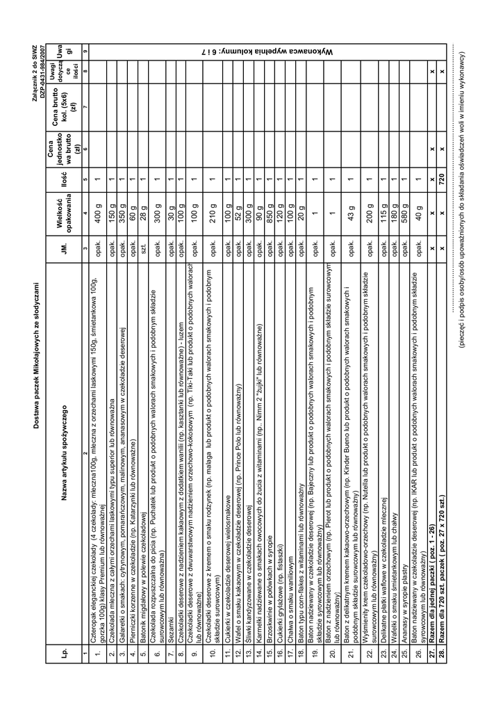 1 1 1 1 1 1 1 1 1 150 g 350 g 60 g 28 g 300 g 30 g 100 g 100 g 210 g opak. opak. opak. opak. opak. 1 40 g x x opak. opak. x x 25. Ananasy w syropie plastry Baton nadziewany w czekoladzie deserowej (np. IKAR lub produkt o podobnych walorach smakowych i podobnym składzie 26. syrowcowym lub równowaŜny) 27. Razem dla jednej paczki ( poz. 1 - 26) 28. Razem dla 720 szt. paczek ( poz. 27 x 720 szt.) x x 6 7 x x 8 9 Cena brutto Uwagi dotyczą Uwa kol. (5x6) ce gi (zł) ilości Załącznik 2 do SIWZ DZP-0431-984/2007 (pieczęć i podpis osoby/osób upowaŜnionych do składania oświadczeń woli w imieniu wykonawcy) ................................................................................................................................................... x 720 1 1 1 115 g 180 g 580 g opak. 1 200 g opak. opak. 1 43 g opak. 24. Wafelki o smaku śmietankowym lub chałwy 1 1 opak. 18. Baton typu corn-flakes z witaminami lub równowaŜny Baton nadziewany w czekoladzie deserowej (np. Bajeczny lub produkt o podobnych walorach smakowych i podobnym 19. składzie syrowcowym lub równowaŜny) Baton z nadzieniem orzechowym (np. Pierot lub produkt o podobnych walorach smakowych i podobnym składzie surowcowym 20. lub równowaŜny) Baton z delikatnym kremem kakaowo-orzechowym (np. Kinder Bueno lub produkt o podobnych walorach smakowych i 21. podobnym składzie surowcowym lub równowaŜny) Wyśmienity krem czekoladowo-orzechowy (np. Nutella lub produkt o podobnych walorach smakowych i podobnym składzie 22. surowcowym lub równowaŜny) 23. Delikatne płatki waflowe w czekoladzie mlecznej opak. opak. 17. Chałwa o smaku waniliowym 1 opak. 16. Cukierki grylaŜowe (np. fistaszki) 1 opak. 15. Brzoskwinie w połówkach w syropie opak. opak. opak. 14. Karmelki nadziewane o smakach owocowych do Ŝucia z witaminami (np.. Nimm 2 "Ŝujki" lub równowaŜne) opak. 13. Śliwki kandyzowane w czekoladzie deserowej 1 1 1 1 1 1 1 1 100 g 52 g 300 g 90 g 850 g 120 g 100 g 20 g opak. 12. Wafel o smaku kakaowym w czekoladzie deserowej (np. Prince Polo lub równowaŜny) szt. opak. opak. opak. 5 1 4 400 g opak. 3 JM. Cena jednostko Wielkość Ilość wa brutto opakowania (zł) 11. Cukierki w czekoladzie deserowej wielosmakowe Batonik migdałowy w polewie czekoladowej Czekolada rozpuszczalna do picia (np. Puchatek lub produkt o podobnych walorach smakowych i podobnym składzie 6. surowcowym lub równowaŜna) 7. Sezamki 8. Czekoladki deserowe z nadzieniem kakaowym z dodatkiem wanilii (np. kasztanki lub równowaŜne) - luzem Czekoladki deserowe z dwuwarstwowym nadzieniem orzechowo-kokosowym (np. Tiki-Taki lub produkt o podobnych walorach 9. lub równowaŜne) Czekoladki deserowe z kremem o smaku rodzynek (np. malaga lub produkt o podobnych walorach smakowych i podobnym 10. składzie surowcowym) Pierniczki korzenne w czekoladzie (np. Katarzynki lub równowaŜne) 4. 5. Galaretki o smakach: cytrynowym, pomarańczowym, malinowym, ananasowym w czekoladzie deserowej 3. 2. 1. 2 1 Czteropak eleganckiej czekolady (4 czekolady: mleczna100g, mleczna z orzechami laskowymi 150g, śmietankowa 100g, gorzka 100g) klasy Premium lub równowaŜnej Czekolada mleczna z całymi orzechami laskowymi typu superior lub równowaŜna Nazwa artykułu spoŜywczego Lp. Dostawa paczek Mikołajowych ze słodyczami Wykonawca wypełnia kolumny: 6 i 7 ......................................................... Dostawa paczek Mikołajowych ze słodyczami Załącznik 2 do SIWZ DZP-0431-984/2007