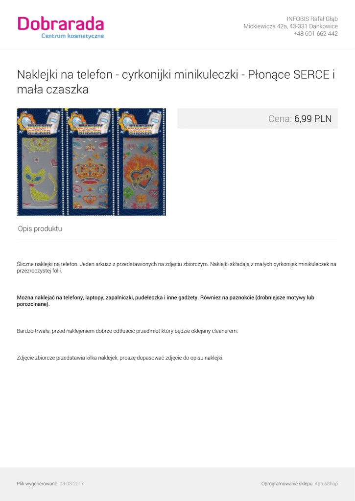 INFOBIS Rafał Głąb Mickiewicza 42a, 43-331 Dankowice +48 601 662 442 Naklejki na telefon - cyrkonijki minikuleczki - Płonące SERCE i mała czaszka Cena: 6,99 PLN Opis produktu Śliczne naklejki na telefon. Jeden arkusz z przedstawionych na zdjęciu zbiorczym. Naklejki składają z małych cyrkonijek minikuleczek na przezroczystej folii. Mozna naklejać na telefony, laptopy, zapalniczki, pudełeczka i inne gadżety. Równiez na paznokcie (drobniejsze motywy lub porozcinane). Bardzo trwałe, przed naklejeniem dobrze odtłuścić przedmiot który będzie oklejany cleanerem. Zdjęcie zbiorcze przedstawia kilka naklejek, proszę dopasować zdjęcie do opisu naklejki. Plik wygenerowano: 03-03-2017 Oprogramowanie sklepu: AptusShop INFOBIS Rafał Głąb Mickiewicza 42a, 43-331 Dankowice +48 601 662 442 Galeria Plik wygenerowano: 03-03-2017 Powered by TCPDF (www.tcpdf.org) Oprogramowanie sklepu: AptusShop
