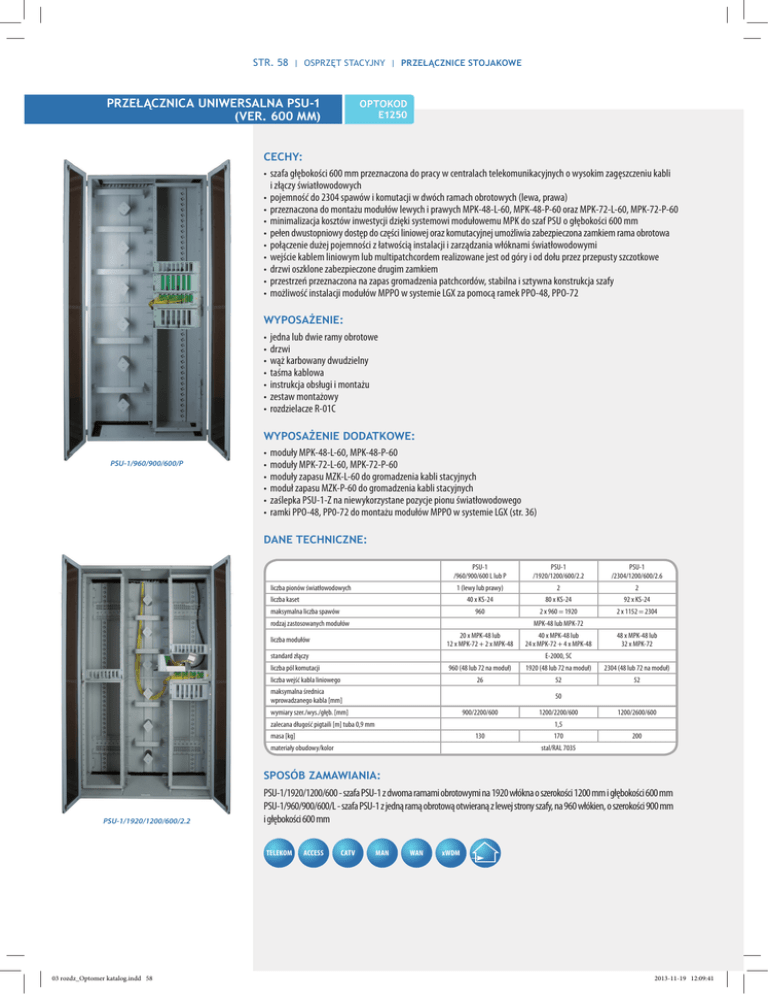 STR. 58 | OSPRZĘT STACYJNY | PRZEŁĄCZNICE STOJAKOWE PRZEŁĄCZNICA UNIWERSALNA PSU-1 (ver. 600 mm) OPTOKOD E1250 CECHY: • szafa głębokości 600 mm przeznaczona do pracy w centralach telekomunikacyjnych o wysokim zagęszczeniu kabli i złączy światłowodowych • pojemność do 2304 spawów i komutacji w dwóch ramach obrotowych (lewa, prawa) • przeznaczona do montażu modułów lewych i prawych MPK-48-L-60, MPK-48-P-60 oraz MPK-72-L-60, MPK-72-P-60 • minimalizacja kosztów inwestycji dzięki systemowi modułowemu MPK do szaf PSU o głębokości 600 mm • pełen dwustopniowy dostęp do części liniowej oraz komutacyjnej umożliwia zabezpieczona zamkiem rama obrotowa • połączenie dużej pojemności z łatwością instalacji i zarządzania włóknami światłowodowymi • wejście kablem liniowym lub multipatchcordem realizowane jest od góry i od dołu przez przepusty szczotkowe • drzwi oszklone zabezpieczone drugim zamkiem • przestrzeń przeznaczona na zapas gromadzenia patchcordów, stabilna i sztywna konstrukcja szafy • możliwość instalacji modułów MPPO w systemie LGX za pomocą ramek PPO-48, PPO-72 WYPOSAŻENIE: • jedna lub dwie ramy obrotowe • drzwi • wąż karbowany dwudzielny • taśma kablowa • instrukcja obsługi i montażu • zestaw montażowy • rozdzielacze R-01C PSU-1/960/900/600/P WYPOSAŻENIE DODATKOWE: • moduły MPK-48-L-60, MPK-48-P-60 • moduły MPK-72-L-60, MPK-72-P-60 • moduły zapasu MZK-L-60 do gromadzenia kabli stacyjnych • moduł zapasu MZK-P-60 do gromadzenia kabli stacyjnych • zaślepka PSU-1-Z na niewykorzystane pozycje pionu światłowodowego • ramki PPO-48, PP0-72 do montażu modułów MPPO w systemie LGX (str. 36) DANE TECHNICZNE: PSU-1 /960/900/600 L lub P liczba pionów światłowodowych PSU-1 /1920/1200/600/2.2 PSU-1 /2304/1200/600/2.6 1 (lewy lub prawy) 2 2 40 x KS-24 80 x KS-24 92 x KS-24 2 x 960 = 1920 2 x 1152 = 2304 liczba kaset maksymalna liczba spawów 960 rodzaj zastosowanych modułów MPK-48 lub MPK-72 liczba modułów 20 x MPK-48 lub 12 x MPK-72 + 2 x MPK-48 40 x MPK-48 lub 24 x MPK-72 + 4 x MPK-48 960 (48 lub 72 na moduł) 1920 (48 lub 72 na moduł) 2304 (48 lub 72 na moduł) 26 52 52 standard złączy 48 x MPK-48 lub 32 x MPK-72 E-2000, SC liczba pól komutacji liczba wejść kabla liniowego maksymalna średnica wprowadzanego kabla [mm] 50 wymiary szer./wys./głęb. [mm] 900/2200/600 zalecana długość pigtaili [m] tuba 0,9 mm 1200/2200/600 1200/2600/600 1,5 masa [kg] 130 materiały obudowy/kolor 170 200 stal/RAL 7035 SPOSÓB ZAMAWIANIA: PSU-1/1920/1200/600/2.2 PSU-1/1920/1200/600 - szafa PSU-1 z dwoma ramami obrotowymi na 1920 włókna o szerokości 1200 mm i głębokości 600 mm PSU-1/960/900/600/L - szafa PSU-1 z jedną ramą obrotową otwieraną z lewej strony szafy, na 960 włókien, o szerokości 900 mm i głębokości 600 mm TELEKOM 03 rozdz_Optomer katalog.indd 58 ACCESS CATV MAN WAN xWDM 2013-11-19 12:09:41