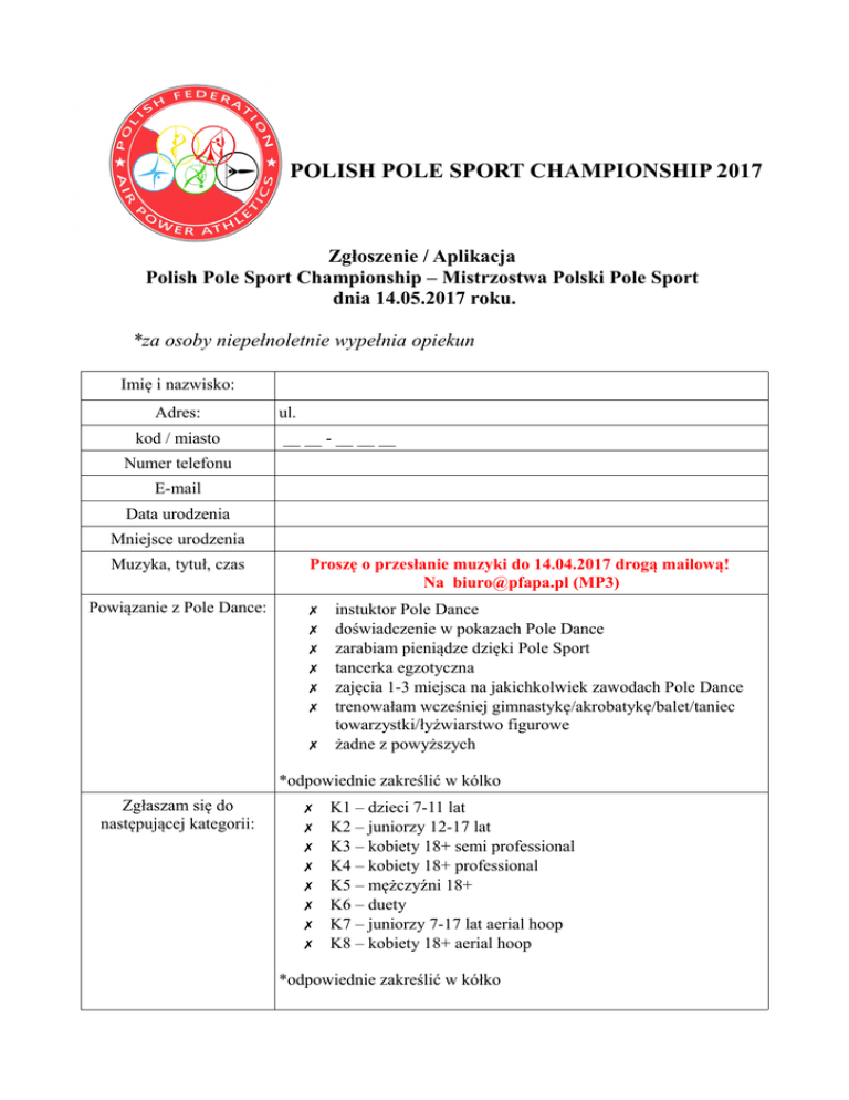 POLISH POLE SPORT CHAMPIONSHIP 2017 Zgłoszenie / Aplikacja Polish Pole Sport Championship – Mistrzostwa Polski Pole Sport dnia 14.05.2017 roku. *za osoby niepełnoletnie wypełnia opiekun Imię i nazwisko: Adres: kod / miasto ul. __ __ - __ __ __ Numer telefonu E-mail Data urodzenia Mniejsce urodzenia Muzyka, tytuł, czas Powiązanie z Pole Dance: Proszę o przesłanie muzyki do 14.04.2017 drogą mailową! Na [email protected] (MP3) ✗ ✗ ✗ ✗ ✗ ✗ ✗ instuktor Pole Dance doświadczenie w pokazach Pole Dance zarabiam pieniądze dzięki Pole Sport tancerka egzotyczna zajęcia 1-3 miejsca na jakichkolwiek zawodach Pole Dance trenowałam wcześniej gimnastykę/akrobatykę/balet/taniec towarzystki/łyżwiarstwo figurowe żadne z powyższych *odpowiednie zakreślić w kólko Zgłaszam się do następującej kategorii: ✗ ✗ ✗ ✗ ✗ ✗ ✗ ✗ K1 – dzieci 7-11 lat K2 – juniorzy 12-17 lat K3 – kobiety 18+ semi professional K4 – kobiety 18+ professional K5 – mężczyźni 18+ K6 – duety K7 – juniorzy 7-17 lat aerial hoop K8 – kobiety 18+ aerial hoop *odpowiednie zakreślić w kółko Imię i nazwisko partnera z duetu: (*dotyczy tylko duetów) Napisz kilka słów o sobie (hobby, marzenie) i opisz czym dla Ciebie jest Pole Sport. *Dotyczy osób niepełnoletnich Imię i nazwisko opiekuna: Numer dowodu osobistego: Oświadczam, że zapoznałem/am się z Regulaminem Konkursu i akceptuję wszystkie zawarte w nim warunki. ✗ Oświadczam, że przysługują mi nieograniczone autorskie prawa, a układ konkursowy jest mojego autorstwa i nie narusza praw autorskich innych osób. ✗ Na mocy niniejszego oświadczenia z chwilą przesłania filmu zgłoszeniowego wyrażam zgodę na przetwarzanie moich danych osobowych przez Polish Fedaration Air Power Athletics oraz przedstawicieli mediów dla potrzeb związanych z Zawodami, zgodnie z Ustawą o Ochronie Danych Osobowych (Dz. U. 1997 nr 133 poz. 883). ✗ ____________________________ miejscowość i data _____________________________ podpis