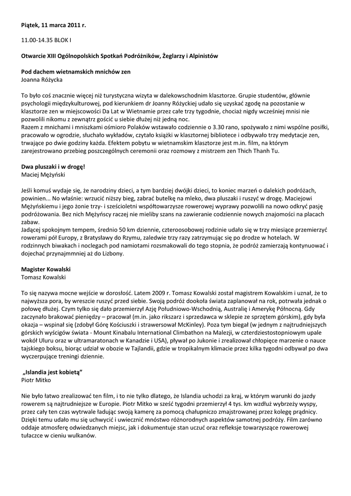Piątek, 11 marca 2011 r. 11.00-14.35 BLOK I Otwarcie XIII Ogólnopolskich Spotkań Podróżników, Żeglarzy i Alpinistów Pod dachem wietnamskich mnichów zen Joanna Różycka To było coś znacznie więcej niż turystyczna wizyta w dalekowschodnim klasztorze. Grupie studentów, głównie psychologii międzykulturowej, pod kierunkiem dr Joanny Różyckiej udało się uzyskać zgodę na pozostanie w klasztorze zen w miejscowości Da Lat w Wietnamie przez całe trzy tygodnie, chociaż nigdy wcześniej mnisi nie pozwolili nikomu z zewnątrz gościć u siebie dłużej niż jedną noc. Razem z mnichami i mniszkami ośmioro Polaków wstawało codziennie o 3.30 rano, spożywało z nimi wspólne posiłki, pracowało w ogrodzie, słuchało wykładów, czytało książki w klasztornej bibliotece i odbywało trzy medytacje zen, trwające po dwie godziny każda. Efektem pobytu w wietnamskim klasztorze jest m.in. film, na którym zarejestrowano przebieg poszczególnych ceremonii oraz rozmowy z mistrzem zen Thich Thanh Tu. Dwa pluszaki i w drogę! Maciej Mężyński Jeśli komuś wydaje się, że narodziny dzieci, a tym bardziej dwójki dzieci, to koniec marzeń o dalekich podróżach, powinien... No właśnie: wrzucić niższy bieg, zabrać butelkę na mleko, dwa pluszaki i ruszyć w drogę. Maciejowi Mężyńskiemu i jego żonie trzy- i sześcioletni współtowarzysze rowerowej wyprawy pozwolili na nowo odkryć pasję podróżowania. Bez nich Mężyńscy raczej nie mieliby szans na zawieranie codziennie nowych znajomości na placach zabaw. Jadącej spokojnym tempem, średnio 50 km dziennie, czteroosobowej rodzinie udało się w trzy miesiące przemierzyć rowerami pół Europy, z Bratysławy do Rzymu, zaledwie trzy razy zatrzymując się po drodze w hotelach. W rodzinnych biwakach i noclegach pod namiotami rozsmakowali do tego stopnia, że podróż zamierzają kontynuować i dojechać przynajmmniej aż do Lizbony. Magister Kowalski Tomasz Kowalski To się nazywa mocne wejście w dorosłość. Latem 2009 r. Tomasz Kowalski został magistrem Kowalskim i uznał, że to najwyższa pora, by wreszcie ruszyć przed siebie. Swoją podróż dookoła świata zaplanował na rok, potrwała jednak o połowę dłużej. Czym tylko się dało przemierzył Azję Południowo-Wschodnią, Australię i Amerykę Północną. Gdy zaczynało brakować pieniędzy – pracował (m.in. jako rikszarz i sprzedawca w sklepie ze sprzętem górskim), gdy była okazja – wspinał się (zdobył Górę Kościuszki i strawersował McKinley). Poza tym biegał (w jednym z najtrudniejszych górskich wyścigów świata - Mount Kinabalu International Climbathon na Malezji, w czterdziestostopniowym upale wokół Uluru oraz w ultramaratonach w Kanadzie i USA), pływał po Jukonie i zrealizował chłopięce marzenie o nauce tajskiego boksu, biorąc udział w obozie w Tajlandii, gdzie w tropikalnym klimacie przez kilka tygodni odbywał po dwa wyczerpujące treningi dziennie. „Islandia jest kobietą” Piotr Mitko Nie było łatwo zrealizować ten film, i to nie tylko dlatego, że Islandia uchodzi za kraj, w którym warunki do jazdy rowerem są najtrudniejsze w Europie. Piotr Mitko w sześć tygodni przemierzył 4 tys. km wzdłuż wybrzeży wyspy, przez cały ten czas wytrwale ładując swoją kamerę za pomocą chałupniczo zmajstrowanej przez kolegę prądnicy. Dzięki temu udało mu się uchwycić i uwiecznić mnóstwo różnorodnych aspektów samotnej podróży. Film zarówno oddaje atmosferę odwiedzanych miejsc, jak i dokumentuje stan uczuć oraz refleksje towarzyszące rowerowej tułaczce w cieniu wulkanów. Pasja odkrywcy, czyli co sądzą Majowie o roku 2012 Jan Gać - gość specjalny Kolosów Podróż w głąb dusznego, gorącego i wiecznie zielonego lasu tropikalnego, w którym znaleźć można zdumiewające pomniki starożytnej architektury i całe miasta zaszyte w ostępach dżungli. Lecz to mało. Prawdziwym wyzwaniem jest poszukiwanie rozwiązań najbardziej fascynujących tajemnic. Z czego wynikał nieprzerwany cykl wzlotów i upadków w cywilizacji Majów? Czy miała z nim coś wspólnego specjalna rachuba czasu, jaką się posługiwali? I dlaczego powinno nas to szczególnie interesować już za rok? By odpowiedzieć na te i inne pytania, Jan Gać wielokrotnie odwiedził Amerykę Środkową i śladami kultur prekolumbijskich przemierzał dzisiejszy Meksyk, Belize, Honduras i Gwatemalę. Jan Gać - podróżnik, historyk i fotograf, autor wielu artykułów, książek (m.in. „W ojczyźnie Majów” oraz „Meksyk”) i przewodników (najbardziej cenione to te po Bliskim Wschodzie i Ziemi Świętej) od lat ze szczególną pasją zgłębia związki między historią a współczesnością rdzennych mieszkańców Ameryki. 14.05-14.35 PRZERWA 14.35-18.00 BLOK II Suerte gringos na Panamericanie Rafał Benedyczak Motocykliści, których spotykali na swojej trasie, zwykle reagowali uśmiechem politowania, widząc, na czym jadą Elżbieta, Gosia i Rafał. Trzy chińskie motory o pojemności 150 CC. A właściwie El Pájaro (Ptak), Bandida (Bandyta) i Tranquilo (Spokojny), bo oni zżyli się z nimi do tego stopnia, że nadali im nawet imiona. I oczywiście nie zamieniliby ich na nic. Kupione na początku 2010 r. w Santiago de Chile pomogły im przez prawie dziewięć miesięcy niespiesznie włóczyć się po Ameryce Południowej i Środkowej. Trasa podróży to wiodła Autostradą Panamerykańską (słynną Panamericaną), to odbijała z niej w rozmaite ciekawe miejsca. Troje motocyklistów najpierw udało się na południe i dotarło do położonej na końcu świata Ushuai (taki napis, „Fin del Mundo”, wita wjeżdżających do tego miasta). Tam zmienili kierunek o 180 stopni i jadąc przez Argentynę, Chile, Boliwię, Peru, Ekwador, Kolumbię, Panamę, Kostarykę, Nikaraguę, Honduras i Salwador zatrzymali się dopiero w Gwatemali po przejechaniu ponad 30 tys. km. Rok na Madagaskarze Dominik Włoch W wieku 27 lat spełnił swo