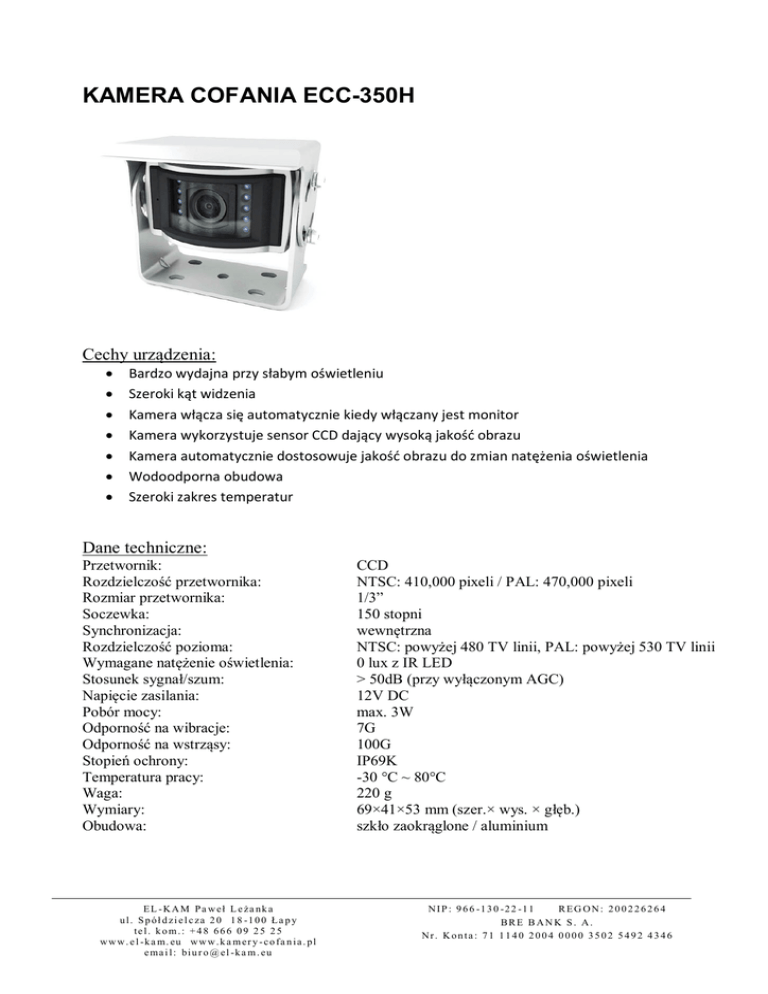 KAMERA COFANIA ECC-350H Cechy urządzenia: Bardzo wydajna przy słabym oświetleniu Szeroki kąt widzenia Kamera włącza się automatycznie kiedy włączany jest monitor Kamera wykorzystuje sensor CCD dający wysoką jakość obrazu Kamera automatycznie dostosowuje jakość obrazu do zmian natężenia oświetlenia Wodoodporna obudowa Szeroki zakres temperatur Dane techniczne: Przetwornik: Rozdzielczość przetwornika: Rozmiar przetwornika: Soczewka: Synchronizacja: Rozdzielczość pozioma: Wymagane natężenie oświetlenia: Stosunek sygnał/szum: Napięcie zasilania: Pobór mocy: Odporność na wibracje: Odporność na wstrząsy: Stopień ochrony: Temperatura pracy: Waga: Wymiary: Obudowa: EL -KAM Pa weł L eża nk a u l . S p ó ł d z i e l c z a 2 0 1 8 -1 0 0 Ł a p y tel. kom.: +48 666 09 25 25 w w w . e l -k a m. e u w w w . k a m e r y - c o fa n i a . p l e ma i l : b i u r o @ e l -k a m . e u CCD NTSC: 410,000 pixeli / PAL: 470,000 pixeli 1/3” 150 stopni wewnętrzna NTSC: powyżej 480 TV linii, PAL: powyżej 530 TV linii 0 lux z IR LED > 50dB (przy wyłączonym AGC) 12V DC max. 3W 7G 100G IP69K -30 °C ~ 80°C 220 g 69×41×53 mm (szer.× wys. × głęb.) szkło zaokrąglone / aluminium N I P : 9 6 6 -1 3 0 -2 2 -1 1 REG ON: 200226264 BRE BANK S. A. Nr. Konta: 71 1140 2004 0000 3502 5492 4346