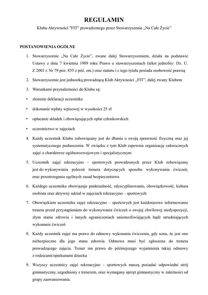 REGULAMIN Klubu Aktywności "FIT" prowadzonego przez Stowarzyszenie „Na Całe Życie” POSTANOWIENIA OGÓLNE 1. Stowarzyszenie „Na Całe Życie”, zwane dalej Stowarzyszeniem, działa na podstawie Ustawy z dnia 7 kwietnia 1989 roku Prawo o stowarzyszeniach (tekst jednolity: Dz. U. Z 2001 r. Nr 79 poz. 855 z póź. zm.) oraz statutu i z tego tytułu posiada osobowość prawną 2. Stowarzyszenie jest jednostką prowadzącą Klub Aktywności „FIT”, dalej zwany Klubem 3. Warunkami przynależności do Klubu są: • złożenie deklaracji uczestnika • dokonanie wpłaty wpisowej w wysokości 25 zł • opłacanie składek i obowiązujących opłat członkowskich • uczestnictwo w zajęciach 4. Każdy uczestnik Klubu zobowiązany jest do dbania o swoją sprawność fizyczną oraz jej systematycznego podnoszenia. W związku z tym Klub zapewnia organizację całorocznych zajęć o charakterze ogólnorozwojowym i specjalistycznym 5. Uczestnik zajęć rekreacyjno – sportowych prowadzonych przez Klub zobowiązany jest do wykonywania poleceń trenera dotyczących sposobu wykonywania ćwiczeń, oraz przestrzegania ogólnych zasad bezpieczeństwa 6. Każdego uczestnika obowiązuje punktualność, zdyscyplinowanie, obowiązkowość, kultura osobista oraz aktywny udział w zajęciach rekreacyjno – sportowych 7. Obowiązkiem uczestnika zajęć rekreacyjno – sportowych jest każdorazowe informowanie trenera przed przystąpieniem do wykonywania ćwiczeń o swojej chwilowej niedyspozycji, złym stanie zdrowia i innych ograniczeniach uniemożliwiających bądź utrudniających wykonanie ćwiczeń 8. Każdy uczestnik zajęć ma prawo do odmowy wykonania ćwiczenia, gdy uzna, że jest ono niebezpieczne dla jego stanu zdrowia. Odmowa musi być zgłoszona do trenera prowadzącego zajęcia. Trener ma prawo do późniejszego wyjaśnienia takiej odmowy z rodzicami/opiekunami dziecka 9. Wszyscy uczestnicy zajęć rekreacyjno – sportowych muszą posiadać odpowiedni strój gimnastyczny, uzgodniony z trenerem, oraz wymagany sprzęt gimnastyczny w zależności od grupy zaawansowania. 10. Na sali treningowej podczas ćwiczeń obowiązuje bezwzględnie konieczność zmiany obuwia 11. Uczestnicy zajęć rekreacyjno – sportowych zobowiązani są dbać o sprzęt sportowy OPŁATY I UBEZPIECZENIE 1. Chłopcy/dziewczynki uczestniczące w zajęciach muszą obowiązkowo posiadać ubezpieczenie NNW. Ubezpieczenie może być wykupione w Klubie (w ramach ubezpieczenia organizacji), bądź indywidualnie. Brak ubezpieczenia uniemożliwia aktywne uczestnictwo w zajęciach 2. Na obowiązkowe opłaty składają się opłaty za zajęcia i składki członkowskie 3. Opłaty należy regulować najpóźniej do 10-go każdego miesiąca na konto bankowe Stowarzyszenia 4. Opłata za składkę członkowską składana jest comiesięcznie, przez cały rok (także w okresie wakacyjnym) 5. W przypadku choroby dziecka powodującej jego nieobecność powyżej 2 tygodni konieczne jest zgłoszenie tego faktu do klubu (mail: [email protected]). Tylko takie zgłoszenie nieobecności pozwoli na zwolnienie z naliczania opłat wg wcześniejszej deklaracji uczestnictwa w zajęciach Klubu 6. Brak wniesienia opłaty do końca danego miesiąca skutkować będzie niedopuszczeniem dziecka do dalszych zajęć. Brak całkowitego uregulowania zaległych opłat w ciągu kolejnych 4 tygodni powoduje skreślenie dziecka z listy uczestników Klubu ORGANIZACJA ZAJĘĆ 1. Dzieci przypisane są do odpowiednich grup i trenerów. Grupy te mają jednoznacznie określone miejsce i terminy zajęć 2. Nie ma możliwości samodzielnej zmiany grupy, dni treningu ani trenera bez wcześniejszej zgody Zarządu Stowarzyszenia „Na Całe Życie” 3. W przypadku nieobecności dziecka w zajęciach na zajęciach jego grupy, Klub nie przewiduje możliwości odbycia ćwiczeń w ramach zajęć innej grupy, lub w innych terminach. Pojedyncza nieobecność dziecka na zajęciach nie zwalnia od opłat 4. Rodzice nie mogą przebywać w pomieszczeniu gdzie są prowadzone zajęcia, z wyłączeniem procesu naboru oraz zgłoszonych przez Zarząd Stowarzyszenia „dni otwartych” USTALENIA KOŃCOWE 1. Poza niniejszym regulaminem, Zarząd Stowarzyszenia zastrzega prawo do zdefiniowania innych regulaminów 2. Uczestnicy zajęć rekreacyjno – sportowych zobowiązani są do przestrzegania niniejszego, oraz pozostałych regulaminów obowiązujących w Klubie 3. Zarząd Stowarzyszenia zastrzega sobie prawo do własnej interpretacji zapisów powyższego Regulaminu. W kwestiach spornych decyzja Zarządu jest decyzją obowiązującą. 4. Następstwem nie przestrzegania w/w punktów są: • niedopuszczenie przez Trenera Prowadzącego do zajęć, • upomnienie słowne, • powiadomienie rodziców/opiekunów, • prace społeczne, • wykluczenie z grona uczestników Regulamin zatwierdzony przez Zarząd Stowarzyszenia „Na Całe Życie”, dnia 03.11.2016 r
