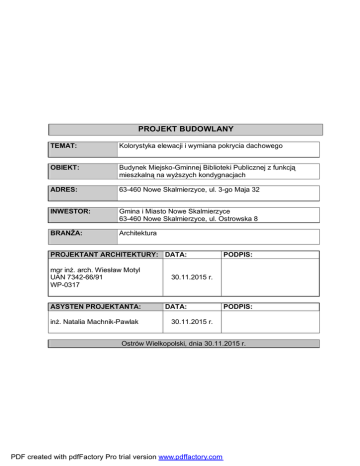 PROJEKT BUDOWLANY TEMAT: Kolorystyka elewacji i wymiana pokrycia dachowego OBIEKT: Budynek Miejsko-Gminnej Biblioteki Publicznej z funkcją mieszkalną na wyższych kondygnacjach ADRES: 63-460 Nowe Skalmierzyce, ul. 3-go Maja 32 INWESTOR: Gmina i Miasto Nowe Skalmierzyce 63-460 Nowe Skalmierzyce, ul. Ostrowska 8 BRANŻA: Architektura PROJEKTANT ARCHITEKTURY: DATA: mgr inż. arch. Wiesław Motyl UAN 7342-66/91 WP-0317 ASYSTEN PROJEKTANTA: inż. Natalia Machnik-Pawlak PODPIS: 30.11.2015 r. DATA: PODPIS: 30.11.2015 r. Ostrów Wielkopolski, dnia 30.11.2015 r. PDF created with pdfFactory Pro trial version www.pdffactory.com Kolorystyka elewacji i wymiana pokrycia dachowego 63-460 Nowe Skalmierzyce, ul. 3-go Maja 32 Inwestor: Gmina i Miasto Nowe Skalmierzyce 63-460 Nowe Skalmierzyce, ul. Ostrowska 8 2. ZAWARTOŚĆ OPRACOWANIA 1. Strona tytułowa 2. Zawartość opracowania 3. Opis techniczny 4. Część graficzna: Nazwa rysunku: • Plan sytuacyjny • Elewacja południowa • Elewacja północna • Elewacja wschodnia • Elewacja zachodnia • Szczegół tympanonu i kartusza • Szczegół sztukaterii • Szczegół sztukaterii • Szczegół sztukaterii • Szczegół sztukaterii • Szczegół sztukaterii • Szczegół balustrady balkonowej 5. Dokumentacja zdjęciowa Pracownia Architektoniczna „ARCUS” mgr inż. arch. Wiesław Motyl 63-400 Ostrów Wlkp., ul. Krotoszyńska 18 tel. 62 592 42 00, fax. 62 592 42 01 e-mail: [email protected] PDF created with pdfFactory Pro trial version www.pdffactory.com skala 1:500 1:100 1:100 1:100 1:100 1:25 1:10 1:10 1:10 1:10 1:10 1:20 Nr rys. P1 A1 A2 A3 A4 A5 A6 A7 A8 A9 A10 A11 2 Kolorystyka elewacji i wymiana pokrycia dachowego 63-460 Nowe Skalmierzyce, ul. 3-go Maja 32 Inwestor: Gmina i Miasto Nowe Skalmierzyce 63-460 Nowe Skalmierzyce, ul. Ostrowska 8 3. OPIS TECHNICZNY 3.1.DANE OGÓLNE 3.1.1.Obiekt: Miejsko-Gminna Biblioteka Publiczna. Budynek na wyższych kondygnacjach pełni funkcję mieszkalną. 3.1.2.Adres: 63-460 Nowe Skalmierzyce, ul. 3-go Maja 32 3.1.3.Inwestor: Gmina i Miasto Nowe Skalmierzyce 63-460 Nowe Skalmierzyce, ul. Ostrowska 8 3.1.4.Własność terenu: Gmina i Miasto Nowe Skalmierzyce 63-460 Nowe Skalmierzyce, ul. Ostrowska 8 3.1.5.Jednostka projektująca: Pracownia Architektoniczna „Arcus” mgr inż. arch. Wiesław Motyl 63-400 Ostrów Wlkp., ul. Krotoszyńska 18 3.1.6.Wykonawca: Wyłoniony zostanie przez Inwestora w drodze przetargu. 3.1.7.Podstawa opracowania: - zlecenie - mapa sytuacyjno-wysokościowa w skali 1:500 - inwentaryzacja budowlana - dokumentacja zdjęciowa 3.2.CHARAKTERYSTYCZNE PARAMETRY TECHNICZNE 3.2.1.Wysokość, szerokość i długość budynku: - szerokość elewacji fontowej: - długość elewacji bocznej: - wysokość do okapu: - wysokość do kalenicy: 16,36 m 12,14 m 7,97 m ok. 15,93 m 3.2.2.Dane techniczne dotyczące dachu: - dach wielospadowy, kąt nachylenia dachu: ok.45° - pokrycie dachu: dachówka ceramiczna karpiówka płaska układana w koronkę Pracownia Architektoniczna „ARCUS” mgr inż. arch. Wiesław Motyl 63-400 Ostrów Wlkp., ul. Krotoszyńska 18 tel. 62 592 42 00, fax. 62 592 42 01 e-mail: [email protected] PDF created with pdfFactory Pro trial version www.pdffactory.com 3 Kolorystyka elewacji i wymiana pokrycia dachowego 63-460 Nowe Skalmierzyce, ul. 3-go Maja 32 Inwestor: Gmina i Miasto Nowe Skalmierzyce 63-460 Nowe Skalmierzyce, ul. Ostrowska 8 3.2.3.Liczba kondygnacji: Istniejący budynek zaliczany jest do obiektów czterokondygnacyjnych, średniowysokich. Budynek jest podpiwniczony oraz posiada strych. 3.3.CZĘŚĆ SZCZEGÓŁOWA 3.3.1.Przedmiot i zakres opracowania: Przedmiotem niniejszego opracowania jest wykonanie projektu kolorystyki elewacji budynku zlokalizowanego w Nowych Skalmierzycach przy ul. 3-go Maja 32. 3.3.2.Lokalizacja: Istniejący budynek zlokalizowany jest w centralnej części działki inwestorskiej w centrum Nowych Skalmierzyc przy ul. 3-go Maja 32. 3.3.3.Rozwiązania architektoniczno-funkcjonalne i sposób dostosowania obiektu do krajobrazu i otaczającej zabudowy, historyczne przeznaczenie obiektu: Zewnętrzne gabaryty budynku nie zmieniają się, wymagana jest jedynie renowacja tynków zewnętrznych, odtworzenie detalu architektonicznego, wymiana opierzeń, parapetów, rynien i rur spustowych oraz dachu. Budynek posiada zdobienia wyłącznie w elewacji frontowej w postaci pilastrów i zwieńczenia centralnej części tympanonem. Elewacji frontowa oflankowana jest pilastrami na pełnej wysokości. Pozostałe elewacje nie posiadają żadnych zdobień. Okna i drzwi posiadają cechy wymiany w latach 80 i 90 XX w. Okna i drzwi na tym etapie remontu pozostawia się bez zmian. 3.4.OPIS BUDOWLANY 3.4.1.Prace naprawcze tynków: Wszystkie odparzone tynki należy odkuć. Ściany po dokładnym oczyszczeniu i zagruntowaniu otynkować tynkiem cementowo-wapiennym. Wierzchnią warstwę wykonać tynkiem szlachetnym, cienkowarstwowym typu „baranek” o uziarnieniu 0,5 mm. 3.4.2. Kolorystyka elewacji: Wg opisów na rysunkach. Zastosowano farby firmy Keim Avantgarde. Należy stosować farby silikatowe, zmywalne z gwarancją utrzymania koloru. Można stosować inne farby o takich samych cechach fizycznych i chemicznych. Uwaga: Wewnętrzne powierzchnie węgarków okiennych oraz nadproży malować w kolorze głównej elewacji. Boczne powierzchnie pilastrów malować w kolorze głównym pilastrów. 3.4.3.Rynny, rury spustowe, opierzenia, parapety. Elementy te należy wykonać jako nowe. Stosować blachę tytan-cynk. gr. 0,55mm w Pracownia Architektoniczna „ARCUS” mgr inż. arch. Wiesław Motyl 63-400 Ostrów Wlkp., ul. Krotoszyńska 18 tel. 62 592 42 00, fax. 62 592 42 01 e-mail: [email protected] PDF created with pdfFactory Pro trial version www.pdffactory.com 4 Kolorystyka elewacji i wymiana pokrycia dachowego 63-460 Nowe Skalmierzyce, ul. 3-go Maja 32 Inwestor: Gmina i Miasto Nowe Skalmierzyce 63-460 Nowe Skalmierzyce, ul. Ostrowska 8 kolorze szarym (naturalnym). 3.4.4.Izol