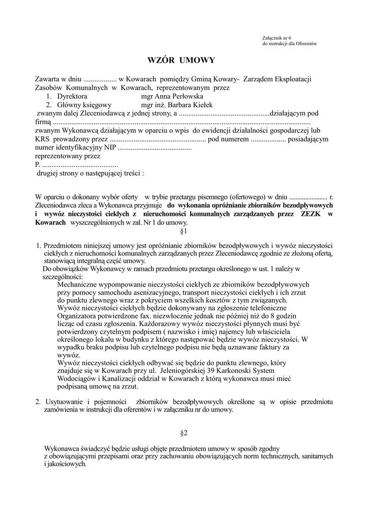 Załącznik nr 6 do instrukcji dla Oferentów WZÓR UMOWY Zawarta w dniu .................. w Kowarach pomiędzy Gminą Kowary- Zarządem Eksploatacji Zasobów Komunalnych w Kowarach, reprezentowanym przez 1. Dyrektora mgr Anna Perłowska 2. Główny księgowy mgr inż. Barbara Kiełek zwanym dalej Zleceniodawcą z jednej strony, a .................................................działającym pod firmą ........................................................................................................................................... zwanym Wykonawcą działającym w oparciu o wpis do ewidencji działalności gospodarczej lub KRS prowadzony przez .................................................... pod numerem ................... posiadającym numer identyfikacyjny NIP ........................................ reprezentowany przez P. ......................................... drugiej strony o następującej treści : W oparciu o dokonany wybór oferty w trybie przetargu pisemnego (ofertowego) w dniu ........................ r. Zleceniodawca zleca a Wykonawca przyjmuje do wykonania opróżnianie zbiorników bezodpływowych i wywóz nieczystości ciekłych z nieruchomości komunalnych zarządzanych przez ZEZK w Kowarach wyszczególnionych w zał. Nr 1 do umowy. §1 1. Przedmiotem niniejszej umowy jest opróżnianie zbiorników bezodpływowych i wywóz nieczystości ciekłych z nieruchomości komunalnych zarządzanych przez Zleceniodawcę zgodnie ze złożoną ofertą, stanowiącą integralną część umowy. Do obowiązków Wykonawcy w ramach przedmiotu przetargu określonego w ust. 1 należy w szczególności: Mechaniczne wypompowanie nieczystości ciekłych ze zbiorników bezodpływowych przy pomocy samochodu asenizacyjnego, transport nieczystości ciekłych i ich zrzut do punktu zlewnego wraz z pokryciem wszelkich kosztów z tym związanych. Wywóz nieczystości ciekłych będzie dokonywany na zgłoszenie telefoniczne Organizatora potwierdzone fax. niezwłocznie jednak nie później niż do 8 godzin licząc od czasu zgłoszenia. Każdorazowy wywóz nieczystości płynnych musi być potwierdzony czytelnym podpisem ( nazwisko i imię) najemcy lub właściciela określonego lokalu w budynku z którego następować będzie wywóz nieczystości. W wypadku braku podpisu lub czytelnego podpisu nie będą uznawane faktury za wywóz. Wywóz nieczystości ciekłych odbywać się będzie do punktu zlewnego, który znajduje się w Kowarach przy ul. Jeleniogórskiej 39 Karkonoski System Wodociągów i Kanalizacji oddział w Kowarach z którą wykonawca musi mieć podpisaną umowę na zrzut. 2. Usytuowanie i pojemności zbiorników bezodpływowych określone są w opisie przedmiotu zamówienia w instrukcji dla oferentów i w załączniku nr do umowy. §2 Wykonawca świadczyć będzie usługi objęte przedmiotem umowy w sposób zgodny z obowiązującymi przepisami oraz przy zachowaniu obowiązujących norm technicznych, sanitarnych i jakościowych. §3 1. Strony ustalają, że Zleceniodawcy przysługuje prawo kontrolowania sposobu wykonania przedmiotu umowy, przy czym z każdej podjętej czynności będzie on sporządzał protokół. 2. Protokół czynności powinien zawierać następujące informacje: - datę i miejsce przeprowadzenia czynności, - opis wykonanych czynności i ich wynik, uwagi i zalecenia, pieczęć oraz imienny podpis, 3.W czynnościach kontroli ma prawo uczestniczenia przedstawiciel Wykonawcy. §4 1. Cena usuwania nieczystości ciekłych za 1 m3 wynosi .......... zł brutto. 2. Wartość wynagrodzenia za przedmiot umowy określona w ust. l będzie ustalana miesięcznie po wykonaniu usługi w oparciu o dane z załącznika do umowy i stawkę jak w ust 1 3. Stawki określona w ust. 1 zawiera wszelkie koszty niezbędne do wykonania przedmiotu przetargu (w oparciu o otrzymany w instrukcji dla oferentów opis przedmiotu przetargu). 4. Cena wywozu 1m3 nieczystości płynnych jest stała i nie ulegnie zmianie w okresie trwania umowy. §5 1. Strony ustalają, iż zapłata za wykonane usługi Zleceniodawca dokonywał będzie w okresach miesięcznych. 2. Zapłata za wykonane usługi Zleceniodawca będzie dokonywał na podstawie faktury VAT w ciągu 21 dni od jej otrzymania. 3. Podstawą zapłaty wynagrodzenia jest złożenie faktury potwierdzonej merytorycznie przez Zleceniodawcę 4. Zapłata faktury VAT będzie dokonywana przez Zleceniodawcę przelewem na rachunek bankowy określony w fakturze. 5. Za termin zapłaty uznaje się datę, w której Zleceniodawca polecił swojemu bankowi przelać na konto Wykonawcy wartość faktury. §6 W razie nieterminowej zapłaty faktury, Wykonawca naliczy, a Zleceniodawca zapłaci ustawowe odsetki. §7 Zleceniodawca oświadcza, że jest podatnikiem podatku VAT §8 1. Termin rozpoczęcia realizacji przedmiotu umowy strony ustalają na dzień 02.04.2012r. 2. Termin zakończenia realizacji przedmiotu umowy strony ustalają na dzień 30.06.2013 r. §9 Wykonawca zapłaci Zleceniodawcy karę umowną: 1. Za odstąpienie od umowy przez Zleceniodawcę z przyczyn za które ponosi odpowiedzialność Wykonawca, w wysokości 2000,00 zł. 2. W przypadku stwierdzenia przez Zleceniodawcę nie wykonania bądź nienależytego wykonania usługi (np. nie terminowego) Zleceniodawca ma prawo: a) naliczyć karę umowną - w wysokości 200,00 zł. za każdy dzień zwłoki b) zlecić innej firmie zastępcze wykonanie usługi, a kosztami obciążyć Wykonawcę c) rozwiązać umowę z Wykonawcą w trybie natychmiastowym, bez zachowania okresu wypowiedzenia Zastosowanie jednej z kar określonej w ppkt a-c nie wyklucza zastosowanie pozostałych wymienionych w pkt. 2 §10 1. Zleceniodawcy przysługuje prawo do odstąpienia od umowy, jeżeli: 1) zostanie ogłoszona upadłość lub rozwiązanie firmy Wykonawcy, 2) zostanie wydany nakaz zajęcia majątku Wykonawcy, 3) Wykonawca nie rozpoczął świadczenia usług bez uzasadnionych przyczyn w okresie 1 tygodnia od podpisania niniejsze