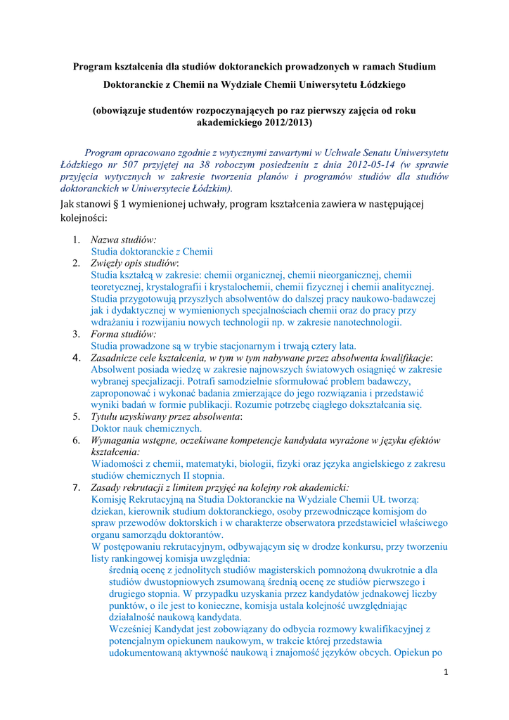 Program kształcenia dla studiów doktoranckich prowadzonych w ramach Studium Doktoranckie z Chemii na Wydziale Chemii Uniwersytetu Łódzkiego (obowiązuje studentów rozpoczynających po raz pierwszy zajęcia od roku akademickiego 2012/2013) Program opracowano zgodnie z wytycznymi zawartymi w Uchwale Senatu Uniwersytetu Łódzkiego nr 507 przyjętej na 38 roboczym posiedzeniu z dnia 2012-05-14 (w sprawie przyjęcia wytycznych w zakresie tworzenia planów i programów studiów dla studiów doktoranckich w Uniwersytecie Łódzkim). Jak stanowi § 1 wymienionej uchwały, program kształcenia zawiera w następującej kolejności: 1. Nazwa studiów: Studia doktoranckie z Chemii 2. Zwięzły opis studiów: Studia kształcą w zakresie: chemii organicznej, chemii nieorganicznej, chemii teoretycznej, krystalografii i krystalochemii, chemii fizycznej i chemii analitycznej. Studia przygotowują przyszłych absolwentów do dalszej pracy naukowo-badawczej jak i dydaktycznej w wymienionych specjalnościach chemii oraz do pracy przy wdraŜaniu i rozwijaniu nowych technologii np. w zakresie nanotechnologii. 3. Forma studiów: Studia prowadzone są w trybie stacjonarnym i trwają cztery lata. 4. Zasadnicze cele kształcenia, w tym w tym nabywane przez absolwenta kwalifikacje: Absolwent posiada wiedzę w zakresie najnowszych światowych osiągnięć w zakresie wybranej specjalizacji. Potrafi samodzielnie sformułować problem badawczy, zaproponować i wykonać badania zmierzające do jego rozwiązania i przedstawić wyniki badań w formie publikacji. Rozumie potrzebę ciągłego dokształcania się. 5. Tytułu uzyskiwany przez absolwenta: Doktor nauk chemicznych. 6. Wymagania wstępne, oczekiwane kompetencje kandydata wyraŜone w języku efektów kształcenia: Wiadomości z chemii, matematyki, biologii, fizyki oraz języka angielskiego z zakresu studiów chemicznych II stopnia. 7. Zasady rekrutacji z limitem przyjęć na kolejny rok akademicki: Komisję Rekrutacyjną na Studia Doktoranckie na Wydziale Chemii UŁ tworzą: dziekan, kierownik studium doktoranckiego, osoby przewodniczące komisjom do spraw przewodów doktorskich i w charakterze obserwatora przedstawiciel właściwego organu samorządu doktorantów. W postępowaniu rekrutacyjnym, odbywającym się w drodze konkursu, przy tworzeniu listy rankingowej komisja uwzględnia: średnią ocenę z jednolitych studiów magisterskich pomnoŜoną dwukrotnie a dla studiów dwustopniowych zsumowaną średnią ocenę ze studiów pierwszego i drugiego stopnia. W przypadku uzyskania przez kandydatów jednakowej liczby punktów, o ile jest to konieczne, komisja ustala kolejność uwzględniając działalność naukową kandydata. Wcześniej Kandydat jest zobowiązany do odbycia rozmowy kwalifikacyjnej z potencjalnym opiekunem naukowym, w trakcie której przedstawia udokumentowaną aktywność naukową i znajomość języków obcych. Opiekun po 1 8. 9. rozmowie wyraŜa pisemną zgodę na podjęcie się opieki nad kandydatem i podaje roboczy temat przyszłej pracy doktorskiej. Dziedziny i dyscypliny naukowe, do których odnoszą się efekty kształcenia: nauki chemiczne, chemia. Efekty kształcenia Efekty kształcenia są zgodne z opisanymi dla obszaru nauk ścisłych, studia III stopnia zestawionymi w Projekcie Ministerstwa Nauki i Szkolnictwa WyŜszego „Krajowe Ramy Kwalifikacji w szkolnictwie wyŜszym jako narzędzie poprawy jakości kształcenia” Priorytet IV PO KL, Działanie 4.1. Poddziałanie 4.1.3., AUTONOMIA PROGRAMOWA UCZELNI, Ramy kwalifikacji dla szkolnictwa wyŜszego, Tabela 3. • WIEDZA 16SD3A_W01 posiada poszerzoną wiedzę w zakresie najwaŜniejszych koncepcji, zasad i teorii, a takŜe ich historycznego rozwoju i znaczenia dla postępu nauk ścisłych / przyrodniczych, poznania świata i rozwoju. 16SD3A_W02 posiada wiedzę w zakresie najnowszych światowych osiągnięć w zakresie wybranej specjalizacji. 16SD3A_W03 zna metodologię dziedziny w stopniu pozwalającym na samodzielne planowanie drogi rozwiązania problemów badawczych. 16SD3A_W04 ma umiejętność wykorzystania zaawansowanego aparatu matematycznego i metod oraz narzędzi informatycznych w zakresie niezbędnym dla ilościowego opisu, zrozumienia oraz modelowania problemów badawczych. 16SD3A_W05 posiada znajomość i umiejętność stosowania waŜnych dla jego specjalności pakietów oprogramowania oraz korzystania z dostępnych baz danych jako narzędzia w pracy badawczej. 16SD3A_W06 posługuje się dwoma językami obcymi, przy czym znają język angielski w stopniu umoŜliwiającym aktywne porozumiewanie się z partnerami. 16SD3A_W07 zna zasady bezpieczeństwa i higieny pracy w stopniu pozwalającym na samodzielną organizację własnej i zespołowej pracy w pracowni naukowej. 16SD3A_W08 ma wiedzę dotyczącą uwarunkowań prawnych, zwyczajowych i etycznych związanych z działalnością naukową. 2 • UMIEJĘTNOŚCI 16SD3A_U01 potrafi samodzielnie sformułować problem badawczy, zaproponować i wykonać badania zmierzające do jego rozwiązania. 16SD3A_U02 potrafi w sposób krytyczny odnieść własne wyniki do wyników innych badaczy, ocenić ich znaczenie i jakość, wskazać drogi optymalizacji programu badawczego. 16SD3A_U03 potrafi samodzielnie przedstawić wyniki badań w formie publikacji w specjalistycznym czasopiśmie naukowym, oraz przygotować dysertację stanowiącą całościowe przedstawienie aktualnego stanu światowej wiedzy w tematyce bliskiej rozprawie doktorskiej, opis i uzasadnienie podjęcia problemu badawczego, przyjętą metodologię, uzyskane wyniki oraz ich krytyczną analizę w nawiązaniu do własnego warsztatu badawczego i osiągnięć innych grup badawczych na świecie. • KOMPETENCJE PERSONALNE I SPOŁECZNE 16SD3A_K01 rozumie potrzebę ciągłego dokształcania się i odczuwa taką potrzebę, jako niezbędny warunek twórczego uczestnictwa w rozwoju uprawianej dziedziny. 10. Związek studiów z misją uczelni i jej strategią rozwoju oraz ze st