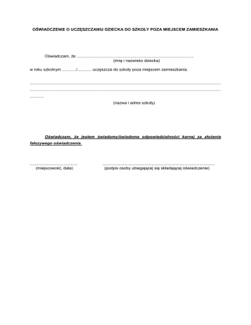 OŚWIADCZENIE O UCZĘSZCZANIU DZIECKA DO SZKOŁY POZA MIEJSCEM ZAMIESZKANIA Oświadczam, że .................................................................................................... (imię i nazwisko dziecka) w roku szkolnym ............/............ uczęszcza do szkoły poza miejscem zamieszkania. ................................................................................................................................................................... ................................................................................................................................................................... ............ (nazwa i adres szkoły) Oświadczam, że jestem świadomy/świadoma odpowiedzialności karnej za złożenie fałszywego oświadczenia. ......................................... (miejscowość, data) ................................................................................................ (podpis osoby ubiegającej się składającej oświadczenie)