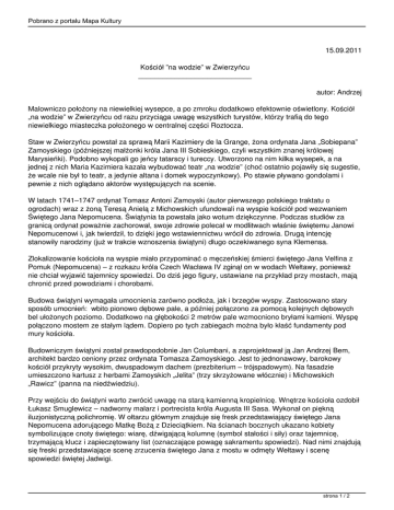 Pobrano z portalu Mapa Kultury 15.09.2011 Kościół ”na wodzie” w Zwierzyńcu ____________________________ autor: Andrzej Malowniczo położony na niewielkiej wysepce, a po zmroku dodatkowo efektownie oświetlony. Kościół „na wodzie” w Zwierzyńcu od razu przyciąga uwagę wszystkich turystów, którzy trafią do tego niewielkiego miasteczka położonego w centralnej części Roztocza. Staw w Zwierzyńcu powstał za sprawą Marii Kazimiery de la Grange, żona ordynata Jana „Sobiepana” Zamoyskiego (późniejszej małżonki króla Jana III Sobieskiego, czyli wszystkim znanej królowej Marysieńki). Podobno wykopali go jeńcy tatarscy i tureccy. Utworzono na nim kilka wysepek, a na jednej z nich Maria Kazimiera kazała wybudować teatr „na wodzie” (choć ostatnio pojawiły się sugestie, że wcale nie był to teatr, a jedynie altana i domek wypoczynkowy). Po stawie pływano gondolami i pewnie z nich oglądano aktorów występujących na scenie. W latach 1741–1747 ordynat Tomasz Antoni Zamoyski (autor pierwszego polskiego traktatu o ogrodach) wraz z żoną Teresą Anielą z Michowskich ufundowali na wyspie kościół pod wezwaniem Świętego Jana Nepomucena. Świątynia ta powstała jako wotum dziękczynne. Podczas studiów za granicą ordynat poważnie zachorował, swoje zdrowie polecał w modlitwach właśnie świętemu Janowi Nepomucenowi i, jak twierdził, to dzięki jego wstawiennictwu wrócił do zdrowia. Drugą intencję stanowiły narodziny (już w trakcie wznoszenia świątyni) długo oczekiwanego syna Klemensa. Zlokalizowanie kościoła na wyspie miało przypominać o męczeńskiej śmierci świętego Jana Velfina z Pomuk (Nepomucena) – z rozkazu króla Czech Wacława IV zginął on w wodach Wełtawy, ponieważ nie chciał wyjawić tajemnicy spowiedzi. Do dziś jego figury, ustawiane na przykład przy mostach, mają chronić przed powodziami i chorobami. Budowa świątyni wymagała umocnienia zarówno podłoża, jak i brzegów wyspy. Zastosowano stary sposób umocnień: wbito pionowo dębowe pale, a później połączono za pomocą kolejnych dębowych bel ułożonych poziomo. Dodatkowo na głębokości 2 metrów pale wzmocniono bryłami kamieni. Wyspę połączono mostem ze stałym lądem. Dopiero po tych zabiegach można było kłaść fundamenty pod mury kościoła. Budowniczym świątyni został prawdopodobnie Jan Columbani, a zaprojektował ją Jan Andrzej Bem, architekt bardzo ceniony przez ordynata Tomasza Zamoyskiego. Jest to jednonawowy, barokowy kościół przykryty wysokim, dwuspadowym dachem (prezbiterium – trójspadowym). Na fasadzie umieszczono kartusz z herbami Zamoyskich „Jelita” (trzy skrzyżowane włócznie) i Michowskich „Rawicz” (panna na niedźwiedziu). Przy wejściu do świątyni warto zwrócić uwagę na starą kamienną kropielnicę. Wnętrze kościoła ozdobił Łukasz Smuglewicz – nadworny malarz i portrecista króla Augusta III Sasa. Wykonał on piękną iluzjonistyczną polichromię. W ołtarzu głównym znajduje się fresk przedstawiający świętego Jana Nepomucena adorującego Matkę Bożą z Dzieciątkiem. Na ścianach bocznych ukazano kobiety symbolizujące cnoty świętego: wiarę, dźwigającą kolumnę (symbol stałości i siły) oraz tajemnicę, trzymającą klucz i zapieczętowany list (oznaczające powagę sakramentu spowiedzi). Nad nimi znajdują się freski przedstawiające scenę zrzucenia świętego Jana z mostu w odmęty Wełtawy i scenę spowiedzi świętej Jadwigi. strona 1 / 2 Pobrano z portalu Mapa Kultury Warto także zwrócić uwagę na organy, wykonane w 1905 roku przez firmę Biernackiego, oraz oryginalne elementy wyposażenia: bogato zdobione rokokowe ławki i konfesjonał. Obok kościoła stoi drewniana dzwonnica. Każdego roku 21 maja, podczas odpustu ku czci świętego Jana Nepomucena, wokół kościoła na wodzie odbywa się widowiskowa procesja na łodziach. Bardzo efektownie i malowniczo świątynia wygląda również po zmierzchu, gdy jest podświetlona. strona 2 / 2