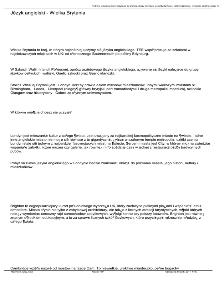 Podró¿e jêzykowe, kursy jêzykowe za granic±, obozy jêzykowe, wyjazdy jêzykowe, kolonie jêzykowe, wycieczki szkolne, obozy m³ Jêzyk angielski - Wielka Brytania Wielka Brytania to kraj, w którym najchêtniej uczymy siê jêzyka angielskiego. TEE wspó³pracuje ze szkolami w najciekawszych miejscach w UK: od s³onecznego Bournemouth po piêkny Edynburg. W Szkocji, Walii i Irlandii Pó³nocnej, oprócz urzêdowego jêzyka angielskiego, u¿ywane s± jêzyki nale¿±ce do grupy jêzyków celtyckich: walijski, Gaelic szkocki oraz Gaelic irlandzki. Stolic± Wielkiej Brytanii jest Londyn, licz±cy prawie osiem milionów mieszkañców. Innymi wiêkszymi miastami s± Birmingham, Leeds, Liverpool (niegdy¶ g³ówny brytyjski port transatlantycki i druga metropolia imperium), szkockie Glasgow oraz historyczny Oxford ze s³ynnym uniwersytetem. W którym mie¶cie chcesz sie uczyæ? Londyn jest mieszank± kultur z ca³ego ¶wiata. Jest uwa¿any za najbardziej kosmopolityczne miasto na ¶wiecie. ¯adne inne angielskie miasto nie mo¿e siê równaæ z t± gigantyczn±, ¿yj±c± w szalonym tempie metropoli±, dziêki czemu Londyn staje siê jednym z najbardziej fascynuj±cych miast na ¶wiecie. Sercem miasta jest City, w którym mo¿na zwiedziæ wspania³e zabytki, liczne muzea czy galerie, jak równie¿ mi³o spêdziæ czas w jednej z restauracji b±d¼ tradycyjnych pubów. Pobyt na kursie jêzyka angielskiego w Londynie bêdzie znakomit± okazj± do poznania miasta, jego historii, kultury i mieszkañców. Brighton to najpopularniejszy kurort po³udniowego wybrze¿a UK, który zachwyca piêknymi pla¿ami i wspania³± letni± atmosfer±. Miasto s³ynie nie tylko z zabytkowej architektury, ale tak¿e z licznych atrakcji turystycznych, w¶ród których nale¿y wymieniæ: coroczny rajd samochodów zabytkowych, wy¶cigi konne czy pokazy latawców. Brighton jest równie¿ znanym o¶rodkiem edukacyjnym, a to za spraw± licznych szkó³ jêzykowych, które przyci±gaj± rokrocznie m³odzie¿ z ca³ego ¶wiata. Cambridge wziê³o nazwê od mostów na rzece Cam. To niewielkie, urokliwe miasteczko, pe³ne bogactw http://www.kursy.tee.pl Kreator PDF Utworzono 3 March, 2017, 11:13 Podró¿e jêzykowe, kursy jêzykowe za granic±, obozy jêzykowe, wyjazdy jêzykowe, kolonie jêzykowe, wycieczki szkolne, obozy m³ ¶redniowiecznej architektury. W Cambridge znajduje siê jeden z najs³ynniejszych i najstarszych uniwersytetów ¶wiata. Charakterystyczne sklepiki usytuowane wzd³u¿ rzeki i liczne bazary to prawdziwy raj dla kolekcjonerów, a zadbane parki i zielone trawniki podkre¶laj± urok tego miasta. W obraz miasta wpisa³y sie te¿ rowery, najlepszy ¶rodek przemieszczania siê po mie¶cie. Mo¿na wybraæ siê na wycieczkê ³ódk± po rzece, z tej perspektywy mo¿na zobaczyc ca³y campus uniwersytecki. http://www.kursy.tee.pl Kreator PDF Utworzono 3 March, 2017, 11:13