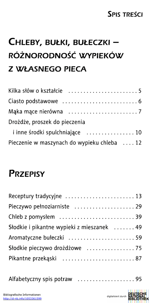 SPIS TREŚCI CHLEBY, BUŁKI, BUŁECZKI RÓŻNORODNOŚĆ WYPIEKÓW Z WŁASNEGO PIECA Kilka s ł ó w o k s z t a ł c i e 5 Ciasto podstawowe 6 Mąka mące nierówna 7 Drożdże, proszek do pieczenia i inne środki spulchniające Pieczenie w maszynach do wypieku chleba 10 . . . . 12 PRZEPISY Receptury tradycyjne 13 Pieczywo pełnoziarniste 29 Chleb z pomysłem 39 Słodkie i pikantne wypieki z mieszanek 49 Aromatyczne bułeczki 59 Słodkie pieczywo drożdżowe 75 Pikantne przekąski 87 Alfabetyczny spis potraw 95 http://d-nb.info/1053361599