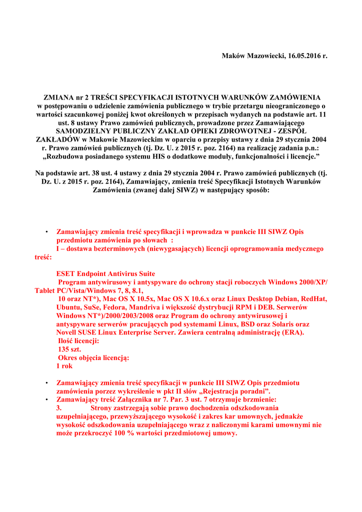 Maków Mazowiecki, 16.05.2016 r. ZMIANA nr 2 TREŚCI SPECYFIKACJI ISTOTNYCH WARUNKÓW ZAMÓWIENIA w postępowaniu o udzielenie zamówienia publicznego w trybie przetargu nieograniczonego o wartości szacunkowej poniżej kwot określonych w przepisach wydanych na podstawie art. 11 ust. 8 ustawy Prawo zamówień publicznych, prowadzone przez Zamawiającego SAMODZIELNY PUBLICZNY ZAKŁAD OPIEKI ZDROWOTNEJ - ZESPÓŁ ZAKŁADÓW w Makowie Mazowieckim w oparciu o przepisy ustawy z dnia 29 stycznia 2004 r. Prawo zamówień publicznych (tj. Dz. U. z 2015 r. poz. 2164) na realizację zadania p.n.: „Rozbudowa posiadanego systemu HIS o dodatkowe moduły, funkcjonalności i licencje.” Na podstawie art. 38 ust. 4 ustawy z dnia 29 stycznia 2004 r. Prawo zamówień publicznych (tj. Dz. U. z 2015 r. poz. 2164), Zamawiający, zmienia treść Specyfikacji Istotnych Warunków Zamówienia (zwanej dalej SIWZ) w następujący sposób: • Zamawiający zmienia treść specyfikacji i wprowadza w punkcie III SIWZ Opis przedmiotu zamówienia po słowach : I – dostawa bezterminowych (niewygasających) licencji oprogramowania medycznego treść: ESET Endpoint Antivirus Suite Program antywirusowy i antyspyware do ochrony stacji roboczych Windows 2000/XP/ Tablet PC/Vista/Windows 7, 8, 8.1, 10 oraz NT*), Mac OS X 10.5x, Mac OS X 10.6.x oraz Linux Desktop Debian, RedHat, Ubuntu, SuSe, Fedora, Mandriva i większość dystrybucji RPM i DEB. Serwerów Windows NT*)/2000/2003/2008 oraz Program do ochrony antywirusowej i antyspyware serwerów pracujących pod systemami Linux, BSD oraz Solaris oraz Novell SUSE Linux Enterprise Server. Zawiera centralną administrację (ERA). Ilość licencji: 135 szt. Okres objęcia licencją: 1 rok • • Zamawiąjący zmienia treść specyfikacji w punkcie III SIWZ Opis przedmiotu zamówienia porzez wykreślenie w pkt II słów „Rejestracja poradni”. Zamawiający treść Załącznika nr 7. Par. 3 ust. 7 otrzymuje brzmienie: 3. Strony zastrzegają sobie prawo dochodzenia odszkodowania uzupełniającego, przewyższającego wysokość i zakres kar umownych, jednakże wysokość odszkodowania uzupełniającego wraz z naliczonymi karami umownymi nie może przekroczyć 100 % wartości przedmiotowej umowy.
