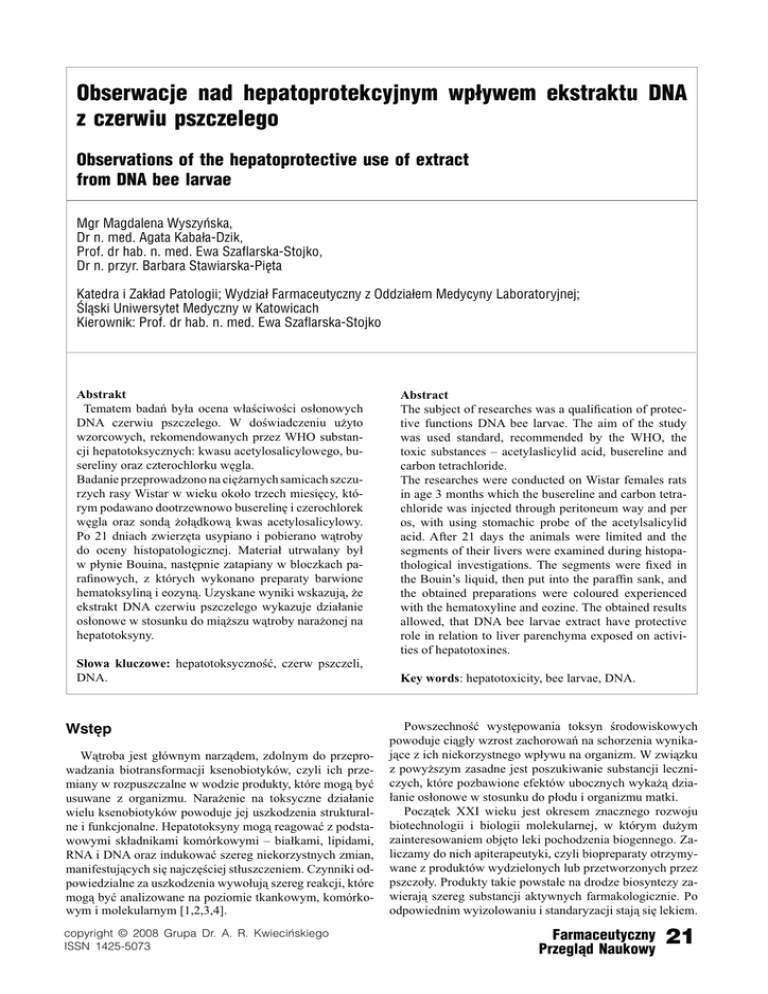 /BSERWACJE NAD HEPATOPROTEKCYJNYM WPYWEM EKSTRAKTU $.! ZCZERWIUPSZCZELEGO /BSERVATIONSOFTHEHEPATOPROTECTIVEUSEOFEXTRACT FROM$.!BEELARVAE -GR-AGDALENA7YSZYÊSKA $RNMED!GATA+ABAA$ZIK 0ROFDRHABNMED%WA3ZAFLARSKA3TOJKO $RNPRZYR"ARBARA3TAWIARSKA0IÃTA +ATEDRAI:AKAD0ATOLOGII7YDZIA&ARMACEUTYCZNYZ/DDZIAEM-EDYCYNY,ABORATORYJNEJ gLSKI5NIWERSYTET-EDYCZNYW+ATOWICACH +IEROWNIK0ROFDRHABNMED%WA3ZAFLARSKA3TOJKO Abstrakt Tematem badań była ocena właściwości osłonowych DNA czerwiu pszczelego. W doświadczeniu użyto wzorcowych, rekomendowanych przez WHO substancji hepatotoksycznych: kwasu acetylosalicylowego, busereliny oraz czterochlorku węgla. Badanie przeprowadzono na ciężarnych samicach szczurzych rasy Wistar w wieku około trzech miesięcy, którym podawano dootrzewnowo buserelinę i czerochlorek węgla oraz sondą żołądkową kwas acetylosalicylowy. Po 21 dniach zwierzęta usypiano i pobierano wątroby do oceny histopatologicznej. Materiał utrwalany był w płynie Bouina, następnie zatapiany w bloczkach parafinowych, z których wykonano preparaty barwione hematoksyliną i eozyną. Uzyskane wyniki wskazują, że ekstrakt DNA czerwiu pszczelego wykazuje działanie osłonowe w stosunku do miąższu wątroby narażonej na hepatotoksyny. Słowa kluczowe: hepatotoksyczność, czerw pszczeli, DNA. ' Ö Wątroba jest głównym narządem, zdolnym do przeprowadzania biotransformacji ksenobiotyków, czyli ich przemiany w rozpuszczalne w wodzie produkty, które mogą być usuwane z organizmu. Narażenie na toksyczne działanie wielu ksenobiotyków powoduje jej uszkodzenia strukturalne i funkcjonalne. Hepatotoksyny mogą reagować z podstawowymi składnikami komórkowymi – białkami, lipidami, RNA i DNA oraz indukować szereg niekorzystnych zmian, manifestujących się najczęściej stłuszczeniem. Czynniki odpowiedzialne za uszkodzenia wywołują szereg reakcji, które mogą być analizowane na poziomie tkankowym, komórkowym i molekularnym [1,2,3,4]. COPYRIGHT'RUPA$R!2+WIECIÊSKIEGO )33. Abstract The subject of researches was a qualification of protective functions DNA bee larvae. The aim of the study was used standard, recommended by the WHO, the toxic substances – acetylaslicylid acid, busereline and carbon tetrachloride. The researches were conducted on Wistar females rats in age 3 months which the busereline and carbon tetrachloride was injected through peritoneum way and per os, with using stomachic probe of the acetylsalicylid acid. After 21 days the animals were limited and the segments of their livers were examined during histopathological investigations. The segments were fixed in the Bouin’s liquid, then put into the paraffin sank, and the obtained preparations were coloured experienced with the hematoxyline and eozine. The obtained results allowed, that DNA bee larvae extract have protective role in relation to liver parenchyma exposed on activities of hepatotoxines. Key words: hepatotoxicity, bee larvae, DNA. Powszechność występowania toksyn środowiskowych powoduje ciągły wzrost zachorowań na schorzenia wynikające z ich niekorzystnego wpływu na organizm. W związku z powyższym zasadne jest poszukiwanie substancji leczniczych, które pozbawione efektów ubocznych wykażą działanie osłonowe w stosunku do płodu i organizmu matki. Początek XXI wieku jest okresem znacznego rozwoju biotechnologii i biologii molekularnej, w którym dużym zainteresowaniem objęto leki pochodzenia biogennego. Zaliczamy do nich apiterapeutyki, czyli biopreparaty otrzymywane z produktów wydzielonych lub przetworzonych przez pszczoły. Produkty takie powstałe na drodze biosyntezy zawierają szereg substancji aktywnych farmakologicznie. Po odpowiednim wyizolowaniu i standaryzacji stają się lekiem. &ARMACEUTYCZNY 0RZEGLD.AUKOWY `¤°°U Produkty pszczele dzięki zawartości związków pochodzenia roślinnego i zwierzęcego wykazują dużą aktywność biologiczną w stosunku do organizmu człowieka. Mają udokumentowane działanie przeciwdrobnoustrojowe, regeneracyjne, znieczulające oraz detoksykacyjne. Wykazują także zdolność stymulowania metabolizmu komórkowego i układowego oraz układu immunologicznego. Oprócz wartości odżywczych wykazują działanie biotyczne w stosunku do organizmu człowieka. Podane właściwości wynikają chemicznego ich składu chemicznego [5]. Analiza właściwości ekstraktów z czerwiu pszczelego jest nowym kierunkiem badań w apiterapii zasługującym na szczególną uwagę, z racji możliwości zastosowania w nowoczesnej terapii z wykorzystaniem DNA opartej na związkach blokujących białka, które uczestniczą w rozwoju różnorodnych zmian patologicznych. Hepatotoksyny i embriotoksyny działają na różnym poziomie, w tym molekularnym, stąd zasadnym jest próba osłonowego zastosowania DNA larw pszczół, jako czynnika niwelującego lub znoszącego nieporządane działanie toksyn, w tym niektórych leków [6]. Celem pracy była ocena osłonowego działania DNA w stosunku do miąższu wątroby narażonego na działanie substancji hepatotoksycznych. - Rl-tluR |J¬ Eksperyment przeprowadzono w Centrum Medycyny Doświadczalnej Śląskiego Uniwersytetu Medycznego po uprzednim uzyskaniu zgody Uczelnianej Komisji Etyki ds. Doświadczeń na Zwierzętach. Badania prowadzone były w Katedrze i Zakładzie Patologii Wydziału Farmaceutycznego z Oddziałem Medycyny Laboratoryjnej Śląskiego Uniwersytetu Medycznego. Materiał doświadczalny stanowiło 100 ciężarnych samic szczurów szczepu Wistar. Dobór zwierząt determinowany był ich dojrzałością płciową i fizyczną oraz przydatnością do rozrodu hodowlanego. Szczury o wadze 170g ± 20g osiągały wiek około 80-100 dni. Ciężarne samice podzielono na trzy podstawowe grupy – kontrolną K oraz dwie grupy badane: A i B. 1. Grupa kontrolna K – składała się z 40 samic i wydzielono w niej cztery podgrupy po 10 samic: K1 – ciężarne samice, którym przebieg ciąży nie był zakłócany; K2 –