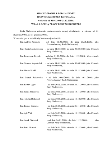 SPRAWOZDANIE Z DZIAŁALNOŚCI RADY NADZORCZEJ KOFOLA S.A. w okresie od 01.01.2008- 31.12.2008r. WRAZ Z OCENĄ PRACY RADY NADZORCZEJ Rada Nadzorcza dokonała podsumowania swojej działalności w okresie od 01 stycznia 2008 r. do 31 grudnia 2008 r. W okresie tym w skład Rady Nadzorczej wchodzili: Pan Andrzej Jesionek -od dnia 01.01.2008r. do dnia 30.05.2008r. jako Przewodniczący Rady Nadzorczej, Pani Beata Martynowska - od dnia 01.01.2008r. do dnia 30.05.2008r jako Członek Rady Nadzorczej, Pan Raimondo Eggink -od dnia 01.01.2008r. do dnia 11.12.2008r. jako członek Rady Nadzorczej, Pan Tomasz Krysztofiak - od dnia 01.01.2008r. do dnia 30.05.2008r jako Członek Rady Nadzorczej, Pan Marek Rocki - od dnia 01.01.2008r. do dnia 26.11.2008r jako Członek Rady Nadzorczej, Pan Marek Jutkiewicz - od dnia 30.05.2008r. do dnia 10.11.2008r. jako Przewodniczący Rady Nadzorczej, Pan Robert Ogór - od dnia 30.05.2008r. do dnia 26.11.2008r. jako Członek Rady Nadzorczej, Pan Jacek Zbikowski - od dnia 30.05.2008r. do dnia 14.11.2008r. jako Członek Rady Nadzorczej, Pan Martin Dokoupil - od dnia 30.05.2008r. do dnia 11.12.2008r. jako Członek Rady Nadzorczej, Pan Kostas Samaras - od dnia 30.05.2008r. do dnia 26.11.2008r. jako Członek Rady Nadzorczej, Pan Ajit Virk - od dnia 30.05.2008r. do dnia 11.12.2008r. jako Członek Rady Nadzorczej, Pan Jacek Woźniak - od dnia 26.11.2008r. do dnia 11.12.2008r. Członek Rady Nadzorczej, Pan Ivan Jakubek - od dnia 26.11.2008r. do dnia 11.12.2008r. jako Członek Rady Nadzorczej, jako Pan Dariusz Prończuk - od dnia 26.11.2008r. do dnia 11.12.2008r. jako Członek Rady Nadzorczej, Pan Ireneusz Stolarski - od dnia 26.11.2008r. do dnia 11.12.2008r. jako Przewodniczący Rady Nadzorczej W okresie sprawozdawczym Rada Nadzorcza odbyła posiedzenia w dniach : - 04 marca, ( wznowione po przerwie w dniu 13 marca ) - 03 kwietnia, - 03 lipca, - 07 października, Rada Nadzorcza uchwaliła łącznie 20 uchwał, z czego 6 (sześć) uchwał zostało podjętych w głosowaniu pisemnym. W głosowaniu pisemnym podjęto uchwały o numerach: 12/2008 - w sprawie rozwiązania umowy o pracę i zmiany umowy o zakazie konkurencji zawartych z członkiem Zarządu Dariuszem Wojdyga, 13/2008 - w sprawie udzielenia zgody na zbycie 404 akcji imiennych spółki Rabat Pomorze S.A. oraz objęcia 929.200 akcji zwykłych na okaziciela Przedsiębiorstwa Produkcyjno-Handlowego BOMI S.A., 14/2008 - w sprawie opinii dotyczącej spraw będących przedmiotem uchwał NWZA zwołanego na dzień 16 września 2008roku, 15/2008 - w sprawie sprawozdania finansowego KOFOLA SPV Sp. z o.o. za rok obrotowy 2007, 16/2008 - w sprawie oceny skonsolidowanego sprawozdania finansowego grupy kapitałowej KOFOLA-HOOP za rok obrotowy 2007, 20/2008 - w sprawie opinii spraw będących przedmiotem uchwał NWZA zwołanego na dzień 26 listopada 2008. Podejmowanie uchwał przez Radę Nadzorczą w trybie pisemnym jest zgodne z postanowieniami § 18 ust. 6 Statutu Spółki. Pozostałe uchwały zostały podjęte na posiedzeniach Rady Nadzorczej, które odbywały się w siedzibie Spółki, a w dniu 07.10.2008r. w Ostravie - siedziba KOFOLA A.S. ( zgodnie z § 18 ust. 4 Statutu Spółki). Rada Nadzorcza na posiedzeniach zajmowała się głównie bieżącymi sprawami Spółki.: Uchwałą nr 1/2008 Rada Nadzorcza wyraziła zgodę na dokonanie przez Spółkę poręczeń zobowiązań wynikających z umów kredytowych, w których HOOP Polska Sp. z o.o. wejdzie w miejsce HOOP S.A. w związku z wniesieniem przedsiębiorstwa HOOP S.A. do spółki HOOP Polska Sp. z o.o. W uchwale nr 2/2008 Rada Nadzorcza wyraziła swoją opinię dotyczącą spraw mających być przedmiotem NWZA zwołanego na dzień 31 marca 2008 roku. W uchwale nr 3/2008 Rada Nadzorcza wyraziła zgodę na prowadzenie przez członka Zarządu Pana Janisa Samarasa działalności konkurencyjnej polegającej na pełnieniu funkcji członka zarządu w spółkach konkurencyjnych wobec HOOP S.A. Uchwałą nr 4/2008 Rada Nadzorcza uchwaliła swój regulamin. W uchwale nr 5/2008 Rada Nadzorcza oceniła sprawozdanie Zarządu z działalności Spółki oraz sprawozdanie finansowe Spółki za rok obrotowy 2007. W uchwale nr 6/2008 Rada Nadzorcza zaopiniowała sprawy będące przedmiotem uchwał NWZA zwołanego na dzień 23 lipca 2008 roku. W uchwale nr 7/2008 Rada Nadzorcza zaopiniowała wniosek zarządu dotyczący przeznaczenia zysku odnotowanego przez Spółkę w roku obrotowym 2007. W uchwale nr 8/2008 Rada Nadzorcza przedstawiła swoją ocenę sytuacji Spółki w roku 2007. W uchwale nr 9/2008 Rada Nadzorcza przyjęła sprawozdanie ze swojej działalności w roku 2007. Uchwałą nr 10/2008 Rada Nadzorcza powołała komitety: audytu i wynagrodzeń. Uchwałą nr 11/2008 Rada Nadzorcza wyznaczyła dwóch swoich członków do zawarcia w imieniu Spółki umowy o pracę z członkiem Zarządu. Uchwałą nr 17/2008 Rada Nadzorcza wyraziła zgodę na wydzierżawienie zakładu produkcyjnego Kofola Sp. z o.o. w Kutnie. Uchwałą nr 18/2008 Rada Nadzorcza ustaliła tekst jednolity Statutu Spółki. W uchwale nr 19/2008 Rada Nadzorcza wyraziła zgodę na zmianę umowy spółki HOOP Polska Sp. z o.o. Rada Nadzorcza stwierdza, że w roku 2008 utrzymywała efektywny nadzór nad działalnością Spółki, a jej współpraca z Zarządem układała się prawidłowo. Przestrzegane były „Dobre Praktyki Rad Nadzorczych”. Powołano Komitet audytu i komitet wynagrodzeń. W skład komitetu audytu wchodzili : Marek Jutkiewicz, Raimondo Eggink, Robert Ogór, Marek Rocki. W skład komitetu wynagrodzeń wchodzili: Marek Jutkiewicz, Ajit Virk, Martin Dokoupil, Raimondo Eggink. Posiedzenia komitet audytu odbywały się w terminach 14 sierpnia , 31 października, 13 listopada. Oceniając sytuację Spółki w roku 2008 Rada Nadzorcza stwierdza, że proces połączenia poprzez tzw. odwrotne przejęcie Spółki przez KOFOLA SPV Sp. z o.o. został pomyślnie zakończony. Rejestracja połączenia została dokonana przez są