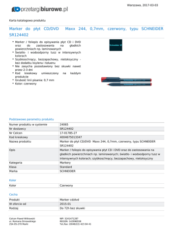 Warszawa, 2017-03-03 Karta katalogowa produktu Marker do płyt CD/DVD Maxx 244, 0,7mm, czerwony, typu SCHNEIDER SR124402 Marker / foliopis do opisywania płyt CD i DVD oraz do zastosowania na gładkich powierzchniach np. laminowanych Światło- i wodoodporny tusz w intensywnych kolorach Szybkoschnący, bezzapachowy, nietoksyczny bez dodatku ksylenu i toluenu Nie zasycha pozostawiony bez skuwki nawet przez 2-3 dni Kod kreskowy umieszczony na każdym produkcie Grubość linii pisania: 0,7 mm Kolor: czerwony Podstawowe parametry produktu Numer produktu w systemie 24065 Nr dostawcy SR124402 Nr Celcen 17-01785-27 Kod kreskowy 4004675013347 Nazwa produktu Marker do płyt CD/DVD Maxx 244, 0,7mm, czerwony, typu SCHNEIDER SR124402 Opis Marker / foliopis do opisywania płyt CD i DVD oraz do zastosowania na gładkich powierzchniach np. laminowanych; światło- i wodoodporny tusz w intensywnych kolorach; szybkoschnący, bezzapachowy, nietoksyczny Kategoria Markery Klasa Standard Marka SCHNEIDER Kolor Kolor Czerwony Cecha Produkt Marker cd/dvd W ofercie od 2015-01 Rodzaj Do 72h bez skuwki Celcen Paweł Witkowski ul. Romana Dmowskiego 25A 05-270 Marki NIP: 5241471287 REGON: 142996558 Tel./fax: (0048/22) 423 84 41 Warszawa, 2017-03-03 Karta katalogowa produktu cd. Marker do płyt CD/DVD Maxx 244, 0,7mm, czerwony, typu SCHNEIDER SR124402 Typ Okrągły Wymiary Grubość linii (mm) 0,7 Końcówka (mm) 0,7 Certyfikaty Nowy produkt w ofercie Standard Hit Standard Wspólny słownik zamówień CPV 30192125-3 Pisaki Jesteśmy przekonani, że z pomocą przetargibiurowe.pl usprawnicie Państwo własne procesy biznesowe związane ze żmudnym poszukiwaniem odpowiadających Państwu produktów oraz opracowaniem specyfikacjii zapytań ofertowych. Serdecznie zapraszamy do wspópracy Zespół, PrzetargiBiurowe.pl Celcen Paweł Witkowski ul. Romana Dmowskiego 25A 05-270 Marki NIP: 5241471287 REGON: 142996558 Tel./fax: (0048/22) 423 84 41