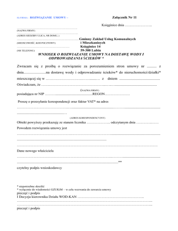 H) FIRMA – ROZWIĄZANIE Załącznik Nr 11 UMOWY – Księginice dnia ………………….. …………………………………………………………………. (NAZWA FIRMY) ………………………………………………………………….. (ADRES SIEDZIBY ULICA, NR DOMU, ) …………….…………………………………………………….. Gminny (MIEJSCOWOŚĆ, KOD POCZTOWY) ………………………………………………………… (NR TELEFONU) Zakład Usług Komunalnych i Mieszkanioych Księginice 14 59-300 Lubin WNIOSEK O ROZWIAZANIE UMOWY NA DOSTAWĘ WODY I ODPROWADZANIA ŚCIEKÓW * Zwracam się z prośbą o rozwiązanie za porozumieniem stron umowy nr .......... z dnia.......................na dostawę wody i odprowadzanie ścieków* do nieruchomości/działki* mieszczącej się w ……………………….…….......… z dniem .......................................... Oświadczam, że …….………………………………………...…..…............................................... (NAZWA FIRMY) posiadająca nr NIP ……….........................................REGON………………… Proszę o przesyłanie korespondencji oraz faktur VAT* na adres …………………………………….…...............................................………........................................ ....................................................… (ADRES KORESPONDENCYJNY) Obiekt powyższy przekazuję ze stanem licznika ……………….. odczytanym dnia ………….…… Powodem rozwiązania umowy jest ……………………………………….……………………………....................................................... .................................................................................................... ……………………………………………………………………………………….……………… Dane nowego właściciela ……………………………………………………………………..……….......................................... .................................................................................................................** czytelny podpis wnioskodawcy * niepotrzebne skreślić * wyłącznie do wiadomości GZUKiM – w celu wezwania do zawarcia umowy pieczęć i podpis I Decyzja kierownika Działu WOD-KAN ……………………………………………….. …………………………………………………………………………………………………... …………………………………………………………………………………………………... pieczęć i podpis