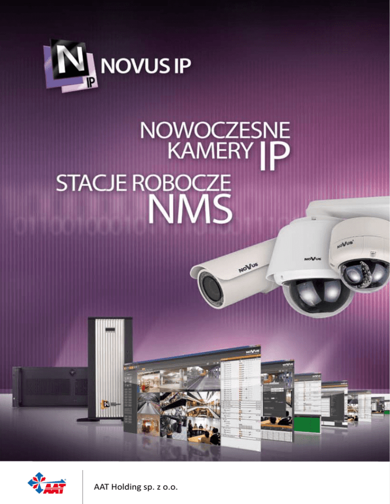AAT Holding sp. z o.o. NVIPTC2401D/MPX1.0 Przetwornik Rozdzielczość przetwornika Funkcja dzień/noc Czułość Kompresja wideo Prędkość przetwarzania NVIPNVIPTDN5401C/MPX2.0 TDN4401V/IR/MPX2.0 NVIPTDN3401H/IR/ MPX2.0 NVIP2DN5001C-1P NVIP2C2011D-P 1/4” CMOS 1/3” CMOS 1/2.7” CMOS 1 MPX (1280x800) 2 MPX (1600x1200) 2 MPX (1920x1080) 1 lx/F=1.2 Wydłużona migawka (DSS) NVIPTC5401C/MPX2.0 elektroniczna filtr IR filtr IR elektroniczna 0.5 lx/F=1.4 - kolor DSS 0.5 lx/F=1.4 - kolor DSS 0.37 lx/F=1.2 - kolor DSS 0.32 lx/F=1.2 - kolor DSS 0.2 lx/F=1.2 - kolor 0.1 lx/F=1.5 - kolor DSS 0.5 lx/F=1.4 - cz-b DSS 0.1 lx/F=1.4 - cz-b DSS 0 lx/F=1.2, IR wł. 0 lx/F=1.2, IR wł. 0.02 lx/F=1.2 - cz-b 0.1 lx/F=1.5 - cz-b DSS 0,03 ~ 0,2 s H.264, MPEG-4, M-JPEG do 30 kl/s dla 1280x800 i niższych 0,03 ~ 0,2 s 0,04 ~ 1 s H.264, MPEG-4, M-JPEG H.264, M-JPEG do 15 kl/s dla 1600x1200, do 22 kl/s dla 1280x1024, do 25 kl/s dla 1280x960, 1280x720 i niższych do 25 kl/s dla 1920x1080 i niższych Dostępne rozdzielczości 1280x800, 1280x720 (HD 720) 1600x1200 (UXGA), 1280x1024 (SXGA), 1280x960, 1280x720 (HD 720) 1920x1080 (HD 1080p) ,1280x1024 (SXGA), 1280x720 (HD 720), 1280x1024 (XGA) Tryb wielostrumieniowy maks. 3 strumienie maks. 3 strumienie maks. 2 strumienie maks. 10 maks. 10 Liczba jednoczesnych połączeń Wejścia/wyjścia audio Kompresja audio Dwukierunkowa transmisja audio Wbudowany obiektyw Wbudowany oświetlacz IR 1/1 wbudowany mikrofon/1 x RCA 1 x minijack/1 x minijack G.711/G.726 µ-LAW tak tak f=2.8 ~ 10 mm - - - Obsługa kart SD tak Wejścia/wyjścia alarmowe 1/1 maks. 10 1 x minijack/ 1 x minijack wbud. mikrofon/- G.711/G.726 f=2.7 ~ 9 mm f=3.6 ~ 16 mm tak - - f = 4.0 mm 18 LED, 15 m zasięgu 35 LED, 20 m zasięgu tak - 1/1 tak 1/1 -/- Przed-/po-alarm do 5 s/do 5 s do 5 s/do 10 s do 3 s (lub do 20 klatek)/do 9999 s (lub do 20 klatek) Detekcja ruchu tak tak tak Wysyłanie wiadomości e-mail tak tak tak Rejestr systemowy tak maks. 750 zdarzeń - Harmonogram tak tak tak Strefy prywatności 3 3 5 Wyjście wideo - CVBS (BNC) CVBS (BNC) - 12 VDC, PoE 12 VDC, PoE 12 VDC, PoE PoE Zasilanie Klasa szczelności Temperatura pracy Wbudowana grzałka i wentylator Wymiary (mm) PTZ - - IP 66 - -10°C ~ 45°C -10°C ~ 45°C -10°C ~ 50°C - - - 131,2 x 94,3 Ø wys. 65 x 58 x 145 szer. wys. dł. 65 x 58 x 145 szer. wys. dł. 141 x 132 Ø wys. 83 x 180 Ø wys. 75 x 52 x 125 szer. wys. dł. 111 x 48 Ø wys. Presety - - - Patrole - - - Trasy obserwacji - - - Prędkość obrotu - - - Zoom optyczny - - - NMS (w zestawie) NMS (w zestawie), NMS (w zestawie), NET Station NET Station Kompatybilne oprogramowanie www.aat.pl NVIP2DN2001D-2P NVIP2DN4001V/IRH-2P NVIP2DN3001H/IR-2P NVIP3DN3010H/IRH-1P NVIPDN6137SD NVIP1DN6118SD NVIP2DN6020SD 1/2.7” CMOS 1/2.8” CMOS 1/4” CCD 1/3” CCD 1/3” CMOS 2 MPX (1920x1080) 3 MPX (2048x1536) 0.4 MPX (720x576) 1.3 MPX (1280x960) 2 MPX (1920x1080) 0.3 lx/F=1.2 - kolor 0 lx/F=1.2, IR wł. 0.7 lx/F=1.6 - kolor 0.06 lx/F=1.6 - cz-b 0.5 lx/F=1.6 - kolor DSS 0.02 lx/F=1.6 - cz-b DSS 0.5 lx/F=1.6 - kolor DSS 0.005 lx/F=1.6 - cz-b DSS 0,04 ~ 1 s 0,13 ~ 1 s 0,04 ~ 5,12 s 0,07 ~ 0,25 s auto/wył. H.264, M-JPEG H.264, MPEG-4, M-JPEG do 25 kl/s dla 1920x1080 i niższych do 15 kl/s dla 2048x1536 i niższych do 25 kl/s dla 720x576 i niższych do 30 kl/s dla 1280x960 i niższych do 30 kl/s dla 1920x1080 i niższych 1920x1080 (HD 1080p) ,1280x1024 (SXGA), 1280x720 (HD 720), 1280x1024 (XGA) 2048x1536 (QXGA) 720x576 (D1), 720x288 (2CIF), 352x288 (CIF) 1280x960, 1280x720 (HD 720) 1920x1080 (HD 1080), 1280x720 (HD 720) maks. 2 strumienie maks. 3 strumienie maks. 2 strumienie maks. 10 maks. 10 maks. 10 1 x minijack/1 x minijack 1 x RCA/1 x RCA 1 x RCA/1 x RCA G.711/G.726 G.711 G.711/G.726 tak tak tak f = 3 ~ 9 mm f = 3 ~ 10 mm filtr IR 0.2 lx/F=1.2 - kolor 0.02 lx/F=1.2 - cz-b filtr IR 0.2 lx/F=1.2 - kolor 0 lx/F=1.2, IR wł. - 23 LED, 30 m zasięgu H.264, M-JPEG f=3.5 ~ 129 mm f=4.7 ~ 84.6 mm 40 LED, 40 m zasięgu - tak - - 1/1 1/1 do 3 s (lub do 20 klatek)/do 9999 s (lub do 20 klatek) do 10 s/do 30 s do 5 s/do 5 s tak tak tak tak tak tak - - - tak tak tak 5 6 8 CVBS (BNC) CVBS (BNC) - CVBS (BNC) 12 VDC, 24 VAC, PoE - IP 66 - tak - tak 88 x 270 Ø wys. 83 x 82 x 166 szer. wys. dł. 8 HD-SDI (BNC) 12 VDC 12 VDC, 3 A -30°C ~ 50°C -40°C ~ 50°C 2/2 4 IP 67 -10°C ~ 50°C tak 310 × 286 dł. wys. (z uchwytem) 310 × 286 dł. wys. (z uchwytem) - - 128 - - 8 - - 4 - - 0.05 - 360°/s - - NMS (w zestawie), NMS (w zestawie), NMS (w zestawie), NET Station NET Station NET Station www.aat.pl f=4.7 ~ 94 mm 2/1 IP 66 -30°C ~ 50°C 149 x 135 Ø wys. 3/1 12 VDC, PoE+ -10°C ~ 50°C 149 x 131 Ø wys. filtr IR 37x 18x 310 × 286 dł. wys. (z uchwytem) 20x Stacje robocze NMS Poniższe zestawienie przedstawia wydajność platform sprzętowych dla przykładowych wariantów pracy systemu. Porównanie ma ułatwić wybór odpowiedniej stacji roboczej. W ofercie dostępne są trzy stacje serwerowe – NMS NVR oraz jedna stacja kliencka – NMS CLIENT. W zależności od struktury i wielkości systemu (głównie liczby i wielkości strumieni) należy zastosować odpowiednią stację roboczą. Wszystkie stacje robocze posiadają zainstalowane oprogramowanie NMS. Maksymalna liczba obsługiwanych strumieni wideo lokalnie Platforma Serwer NMS NVR 3 Serwer NMS NVR 5 Serwer NMS NVR 7 NMS CLIENT 7 odbieranych ze stacji NMS NVR wysyłanych do stacji NMS CLIENT nagrywanych (kl/s) wyświetlanych (kl/s) lub odtwarzanych (kl/s) na żywo z nagraniami (prędkość x1) lub z nagraniami (prędkość x4) na żywo lub z nagraniami 50 (1250) * 4 (100) lub 4 (100) 0 0 lub 0 0 50 (1250) * 1 (25) lub 1 (25) 50 16 lub 2 0 64 (1600) * 16 (400) lub 16 (400) 0 0 lub 0 0 64 (1600) * 4 (100) lub 4 (100) 64 1 lub 1 0 50 (1250) * 4 (100) lub 4 (100) 50 16 lub 2 0 25 (625) 4 (100) lub 4 (100) 75 16 lub 4 0 16 (400) 4 (100) lub 4 (100) 64 16 lub 4 0 64 (1600) 25 (625) lub 16 (400) 0 0 lub 0 0 50 (1250) 4 (100) lub 4 64 16 lub 4 0 50 (1250) 4 (100) lu