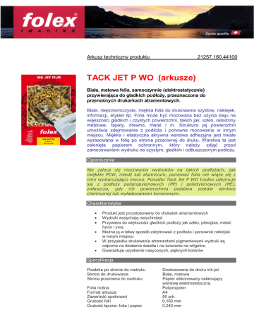Arkusz techniczny produktu 21257.160.44100 TACK JET P WO (arkusze) Bia a, matowa folia, samoczynnie (elektrostatycznie) przywieraj ca do g adkich pod y, przeznaczona do przeno nych drukarkach atramentowych. Bia a, nieprzezroczysta, mi kka folia do drukowania szyldów, naklejek, informacji, etykiet itp. Folia mo e by mocowana bez u ycia kleju na wi kszo ci g adkich i czystych powierzchni, takich jak: szk o, ok adziny meblowe, tapety, drewno, metal i in. Struktura jej powierzchni umo liwia zdejmowanie z pod a i ponowne mocowanie w innym miejscu. Mi kka i elastyczna aktywna warstwa adhezyjna jest trwale wprasowana w foli po stronie przeciwnej do druku. Warstwa ta jest os oni ta papierem ochronnym, który nale y zdj przed zamocowaniem wydruku na czystym, g adkim i odt uszczonym pod u. Ograniczenia Nie zaleca si mocowania wydruków na takich pod ach, jak mi kkie PCW, mied lub aluminium, poniewa folia nie wi e si z nimi wystarczaj co mocno. Ponadto Tack Jet P WO trudno zdejmuje si z pod y polipropylenowych (PP) i polietylenowych (PE), zw aszcza, gdy ich powierzchnia poddana zosta a obróbce chemicznej lub wy adowaniom koronowym. Charakterystyka Produkt jest przystosowany do drukarek atramentowych Wydruki wysychaj natychmiast Przywiera do wi kszo ci g adkich pod y jak szk o, plexiglas, metal, fornir i inne Mo na j w atwy sposób zdejmowa z pod a i ponownie nakleja w innym miejscu W przypadku drukowania atramentami pigmentowymi wydruki s odporne na dzia anie wiat a i na cieranie na wilgotno Gwarantuje uzyskanie nasyconych, pi knych kolorów Specyfikacja Pow oka po stronie do nadruku Strona do drukowania Strona przeciwna do nadruku Folia no na Format arkusza Zawarto opakowa Grubo folii Grubo czna: folia i papier Dostosowana do druku ink-jet Bia a, matowa Papier silikonowany os aniaj cy warstw elektrostatyczn Polipropylen A4 50 ark. 0,160 mm 0,240 mm Arkusz techniczny produktu d.c. 21257.160.44100 Kompatybilno Produkt jest odpowiedni do wi kszo ci przeno nych ma oformatowych drukarek atramentowych Nie stosuje si w przypadkach omówionych w dziale <Ograniczenia> Drukowanie Warunki rodowiska roboczego powinny mie ci si w zakresie temperatur od 15 do 300C wilgotno ci wzgl dnej od 30 do 70%. Zaleca si 24-godzinne klimatyzowanie folii w pomieszczeniu roboczym. W celu w ciwego stosowania Tack Jet P WO nale y przestrzega instrukcji urz dzenia drukuj cego oraz zalece znajduj cych si w opakowaniu folii. Tryb drukowania: zaleca si jako fotograficzn , papier powlekany lub podobne. Ilo nadrukowanego atramentu: normalna lub lekko zmniejszona. Produkt nale y chroni przed wilgoci i pozostawianiem odcisków palców. Sk adowanie Otworzone opakowania nale y przechowywa w temperaturze 15-250C i wilgotno ci wzgl dnej 30-60%. Sk adowanie w pomieszczeniach ch odnych i suchych. W zamkni tych opakowaniach nie nale y przechowywa wyrobu ej, ni przez 1 rok, po tym terminie mo e wyst pi pogorszenie jego w ciwo ci. Opakowania Formaty Art.-Nr 21257.160.44100 Format Ark./opak. A4 50 10.2011