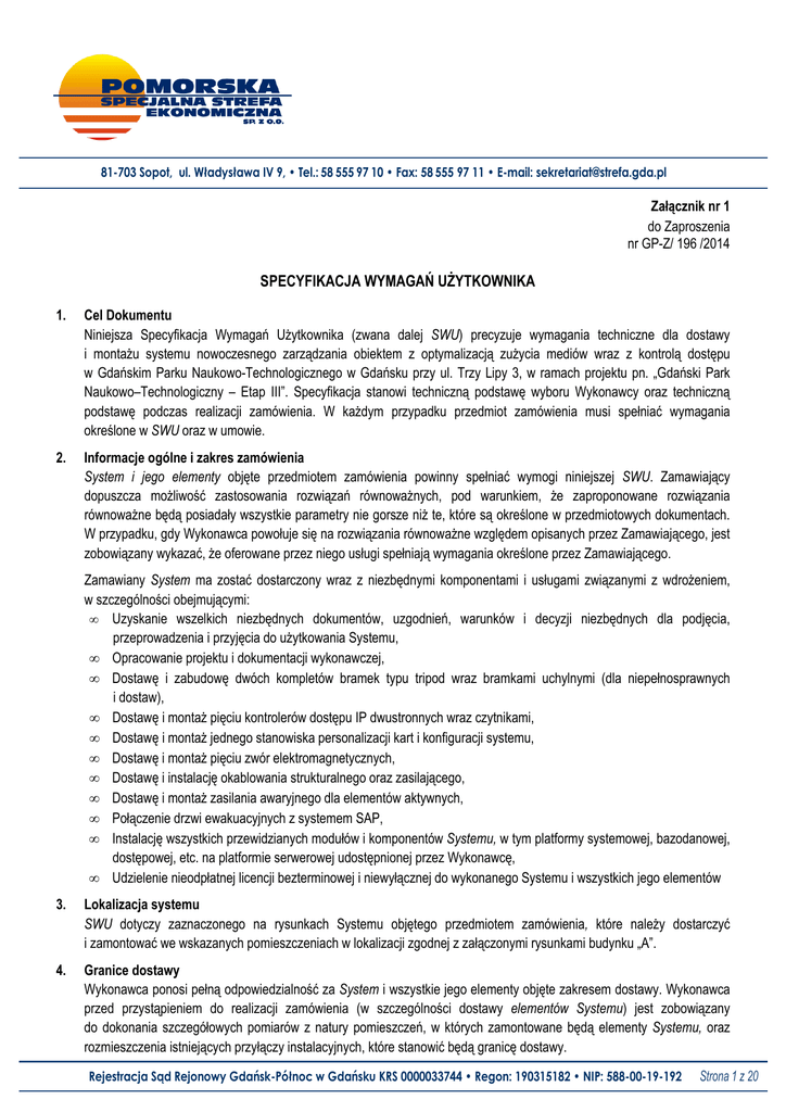 81-703 Sopot, ul. Władysława IV 9, • Tel.: 58 555 97 10 • Fax: 58 555 97 11 • E-mail: [email protected] Załącznik nr 1 do Zaproszenia nr GP-Z/ 196 /2014 SPECYFIKACJA WYMAGAŃ UŻYTKOWNIKA 1. Cel Dokumentu Niniejsza Specyfikacja Wymagań Użytkownika (zwana dalej SWU) precyzuje wymagania techniczne dla dostawy i montażu systemu nowoczesnego zarządzania obiektem z optymalizacją zużycia mediów wraz z kontrolą dostępu w Gdańskim Parku Naukowo-Technologicznego w Gdańsku przy ul. Trzy Lipy 3, w ramach projektu pn. „Gdański Park Naukowo–Technologiczny – Etap III”. Specyfikacja stanowi techniczną podstawę wyboru Wykonawcy oraz techniczną podstawę podczas realizacji zamówienia. W każdym przypadku przedmiot zamówienia musi spełniać wymagania określone w SWU oraz w umowie. 2. Informacje ogólne i zakres zamówienia System i jego elementy objęte przedmiotem zamówienia powinny spełniać wymogi niniejszej SWU. Zamawiający dopuszcza możliwość zastosowania rozwiązań równoważnych, pod warunkiem, że zaproponowane rozwiązania równoważne będą posiadały wszystkie parametry nie gorsze niż te, które są określone w przedmiotowych dokumentach. W przypadku, gdy Wykonawca powołuje się na rozwiązania równoważne względem opisanych przez Zamawiającego, jest zobowiązany wykazać, że oferowane przez niego usługi spełniają wymagania określone przez Zamawiającego. Zamawiany System ma zostać dostarczony wraz z niezbędnymi komponentami i usługami związanymi z wdrożeniem, w szczególności obejmującymi: • Uzyskanie wszelkich niezbędnych dokumentów, uzgodnień, warunków i decyzji niezbędnych dla podjęcia, przeprowadzenia i przyjęcia do użytkowania Systemu, • Opracowanie projektu i dokumentacji wykonawczej, • Dostawę i zabudowę dwóch kompletów bramek typu tripod wraz bramkami uchylnymi (dla niepełnosprawnych i dostaw), • Dostawę i montaż pięciu kontrolerów dostępu IP dwustronnych wraz czytnikami, • Dostawę i montaż jednego stanowiska personalizacji kart i konfiguracji systemu, • Dostawę i montaż pięciu zwór elektromagnetycznych, • Dostawę i instalację okablowania strukturalnego oraz zasilającego, • Dostawę i montaż zasilania awaryjnego dla elementów aktywnych, • Połączenie drzwi ewakuacyjnych z systemem SAP, • Instalację wszystkich przewidzianych modułów i komponentów Systemu, w tym platformy systemowej, bazodanowej, dostępowej, etc. na platformie serwerowej udostępnionej przez Wykonawcę, • Udzielenie nieodpłatnej licencji bezterminowej i niewyłącznej do wykonanego Systemu i wszystkich jego elementów 3. Lokalizacja systemu SWU dotyczy zaznaczonego na rysunkach Systemu objętego przedmiotem zamówienia, które należy dostarczyć i zamontować we wskazanych pomieszczeniach w lokalizacji zgodnej z załączonymi rysunkami budynku „A”. 4. Granice dostawy Wykonawca ponosi pełną odpowiedzialność za System i wszystkie jego elementy objęte zakresem dostawy. Wykonawca przed przystąpieniem do realizacji zamówienia (w szczególności dostawy elementów Systemu) jest zobowiązany do dokonania szczegółowych pomiarów z natury pomieszczeń, w których zamontowane będą elementy Systemu, oraz rozmieszczenia istniejących przyłączy instalacyjnych, które stanowić będą granicę dostawy. Rejestracja Sąd Rejonowy Gdańsk-Północ w Gdańsku KRS 0000033744 • Regon: 190315182 • NIP: 588-00-19-192 Strona 1 z 20 81-703 Sopot, ul. Władysława IV 9, • Tel.: 58 555 97 10 • Fax: 58 555 97 11 • E-mail: [email protected] 5. Transport i dostawa Dostawa Systemu nastąpi transportem Wykonawcy oraz na jego koszt i ryzyko. Wszystkie elementy zostaną zapakowane w sposób uniemożliwiający ich uszkodzenie podczas transportu. Za jakiekolwiek uszkodzenia Systemu podczas transportu odpowiedzialność ponosi Wykonawca. Wykonawca ponosi pełną odpowiedzialność za spełnienie wszelkich wymagań importowych oraz za zgodność z polskimi przepisami celnymi. W przypadku, gdy władze polskie wymagać będą dodatkowych informacji i zaświadczeń w celu wyrażenia zgody na import wyposażenia do Polski, Wykonawca spełni te wymagania bez konieczności ponoszenia dodatkowych kosztów przez Zamawiającego. 6. Montaż/Instalacja • Wykonawca dostarczy poszczególne elementy Systemu do odpowiednich pomieszczeń udostępnionych przez Zamawiającego. Montaż, podłączenie do istniejących przyłączy instalacyjnych w pomieszczeniach i uruchomienie Systemu nastąpi staraniem, na koszt i ryzyko Wykonawcy. Wykonawca przekaże System Zamawiającemu w stanie kompletnym, wyregulowanym, wyczyszczonym i gotowym do pracy bez konieczności dodatkowego doposażenia (za wyjątkiem materiałów eksploatacyjnych), • Wykonawca usunie własnym staraniem i na własny koszt opakowania, elementy po montażu, elementy wadliwe, etc. Wykonawca pozostawi po montażu pomieszczenia objęte dostawą w stanie nie gorszym niż zastany, w tym uprzątnie na swój koszt i ryzyko wszelkie odpady, resztki, śmieci etc., • Przed przystąpieniem do wdrożenia Wykonawca przedstawi projekt wykonawczy zgodnie z obowiązującymi normami i przepisami. Wdrożenie powinno obejmować montaż i instalację poszczególnych komponentów wraz ze szkoleniami użytkowników w wymiarze min. 5 x 4h, • W ramach wdrożenia Wykonawca wykona niezbędne okablowanie strukturalne oraz zasilające urządzenia. Wszystkie elementy aktywne mają zostać umieszczone w szafie teleinformatycznej o wysokości przynajmniej 15U wraz z zasilaniem awaryjnym (czas podtrzymania co najmniej 20 min). Dla drzwi (wskazanych na Planie) należy dostarczyć zwory elektromagnetyczne (180 kg). W przypadku wyjść ewakuacyjnych wykonać odpowiednie połączenie do systemu SAP. 7. Gwarancja Wykonawca udziela minimum 5-letniej gwarancji na każdy element Systemu. Szczegółowe warunki gwarancji określone są w projekcie umowy. 8. Wymagania dotyczące szkolenia Wykonawca będ