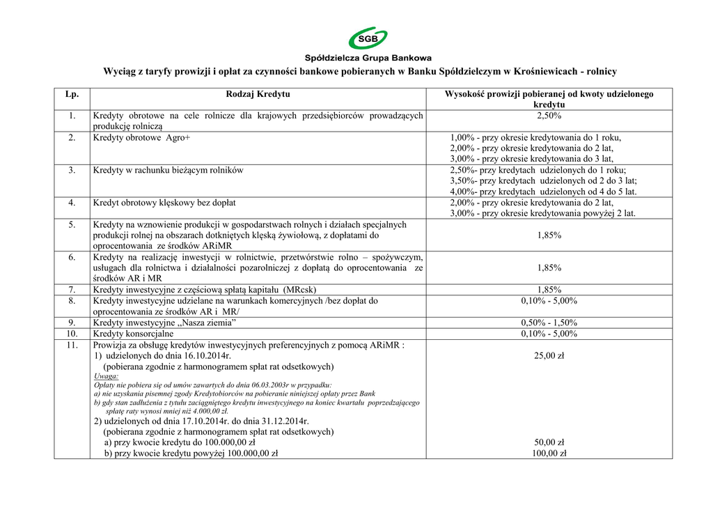 Wyciąg z taryfy prowizji i opłat za czynności bankowe pobieranych w Banku Spółdzielczym w Krośniewicach - rolnicy Lp. Rodzaj Kredytu 1. 2. Kredyty obrotowe na cele rolnicze dla krajowych przedsiębiorców prowadzących produkcję rolniczą Kredyty obrotowe Agro+ 3. Kredyty w rachunku bieżącym rolników 4. Kredyt obrotowy klęskowy bez dopłat 5. Kredyty na wznowienie produkcji w gospodarstwach rolnych i działach specjalnych produkcji rolnej na obszarach dotkniętych klęską żywiołową, z dopłatami do oprocentowania ze środków ARiMR Kredyty na realizację inwestycji w rolnictwie, przetwórstwie rolno – spożywczym, usługach dla rolnictwa i działalności pozarolniczej z dopłatą do oprocentowania ze środków AR i MR Kredyty inwestycyjne z częściową spłatą kapitału (MRcsk) Kredyty inwestycyjne udzielane na warunkach komercyjnych /bez dopłat do oprocentowania ze środków AR i MR/ Kredyty inwestycyjne ,,Nasza ziemia” Kredyty konsorcjalne Prowizja za obsługę kredytów inwestycyjnych preferencyjnych z pomocą ARiMR : 1) udzielonych do dnia 16.10.2014r. (pobierana zgodnie z harmonogramem spłat rat odsetkowych) 6. 7. 8. 9. 10. 11. Wysokość prowizji pobieranej od kwoty udzielonego kredytu 2,50% 1,00% - przy okresie kredytowania do 1 roku, 2,00% - przy okresie kredytowania do 2 lat, 3,00% - przy okresie kredytowania do 3 lat, 2,50%- przy kredytach udzielonych do 1 roku; 3,50%- przy kredytach udzielonych od 2 do 3 lat; 4,00%- przy kredytach udzielonych od 4 do 5 lat. 2,00% - przy okresie kredytowania do 2 lat, 3,00% - przy okresie kredytowania powyżej 2 lat. 1,85% 1,85% 1,85% 0,10% - 5,00% 0,50% - 1,50% 0,10% - 5,00% 25,00 zł Uwaga: Opłaty nie pobiera się od umów zawartych do dnia 06.03.2003r w przypadku: a) nie uzyskania pisemnej zgody Kredytobiorców na pobieranie niniejszej opłaty przez Bank b) gdy stan zadłużenia z tytułu zaciągniętego kredytu inwestycyjnego na koniec kwartału poprzedzającego spłatę raty wynosi mniej niż 4.000,00 zł. 2) udzielonych od dnia 17.10.2014r. do dnia 31.12.2014r. (pobierana zgodnie z harmonogramem spłat rat odsetkowych) a) przy kwocie kredytu do 100.000,00 zł b) przy kwocie kredytu powyżej 100.000,00 zł 50,00 zł 100,00 zł 12. 13. Prowizja rekompensacyjna od przedterminowej spłaty całości lub części kredytów inwestycyjnych z dopłatami do oprocentowania ze środków ARiMR udzielonych do dnia 31.12.2014r. Uwaga 1) prowizji nie pobiera się w przypadku spłaty dokonywanej do 30 dni kalendarzowych przed ustalonym w umowie terminem 2) przy spłacie bezgotówkowej liczy się data wpływu środków do Banku Prowizja za obsługę kredytu obrotowego Agro+ (opłata pobierana jest zgodnie z harmonogramem spłat rat odsetkowych i dotyczy umów zawartych od dnia 17.10.2014r.) 2 1,00% kapitału lub jego części spłaconej przed terminem 3,00 zł za każdy miesiąc trwania kredytu