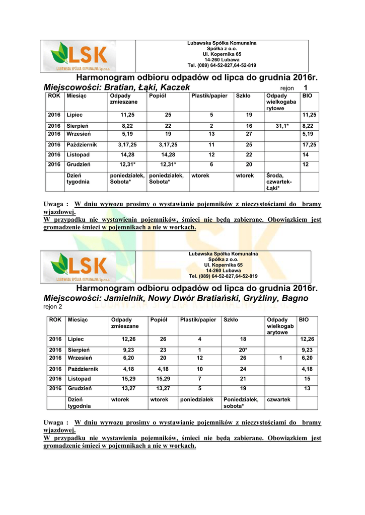 Lubawska Spółka Komunalna Spółka z o.o. Ul. Kopernika 65 14-260 Lubawa Tel. (089) 64-52-827,64-52-819 Harmonogram odbioru odpadów od lipca do grudnia 2016r. Miejscowości: Bratian, Łąki, Kaczek rejon 1 ROK Miesiąc 2016 Lipiec 11,25 25 5 19 2016 2016 Sierpień Wrzesień 8,22 5,19 22 19 2 13 16 27 2016 Październik 3,17,25 3,17,25 11 25 17,25 2016 Listopad 14,28 14,28 12 22 14 2016 Grudzień 12,31* 12,31* 6 20 12 Dzień tygodnia Odpady zmieszane Popiół Plastik/papier poniedziałek, poniedziałek, Sobota* Sobota* wtorek Szkło wtorek Odpady wielkogaba rytowe BIO 11,25 31,1* 8,22 5,19 Środa, czwartekŁąki* Uwaga : W dniu wywozu prosimy o wystawianie pojemników z nieczystościami do bramy wjazdowej. W przypadku nie wystawienia pojemników, śmieci nie będą zabierane. Obowiązkiem jest gromadzenie śmieci w pojemnikach a nie w workach. Lubawska Spółka Komunalna Spółka z o.o. Ul. Kopernika 65 14-260 Lubawa Tel. (089) 64-52-827,64-52-819 Harmonogram odbioru odpadów od lipca do grudnia 2016r. Miejscowości: Jamielnik, Nowy Dwór Bratiański, Gryźliny, Bagno rejon 2 ROK Miesiąc 2016 Lipiec 12,26 26 4 18 Odpady BIO wielkogab arytowe 12,26 2016 2016 Sierpień Wrzesień 9,23 6,20 23 20 1 12 20* 26 9,23 6,20 2016 Październik 4,18 4,18 10 24 4,18 2016 Listopad 15,29 15,29 7 21 15 2016 Grudzień 13,27 13,27 5 19 13 Dzień tygodnia Odpady zmieszane wtorek Popiół wtorek Plastik/papier poniedziałek Szkło Poniedziałek, sobota* 1 czwartek Uwaga : W dniu wywozu prosimy o wystawianie pojemników z nieczystościami do bramy wjazdowej. W przypadku nie wystawienia pojemników, śmieci nie będą zabierane. Obowiązkiem jest gromadzenie śmieci w pojemnikach a nie w workach. Lubawska Spółka Komunalna Spółka z o.o. Ul. Kopernika 65 14-260 Lubawa Tel. (089) 64-52-827,64-52-819 Harmonogram odbioru odpadów od lipca do grudnia 2016r. Miejscowości: Chrośle, Lekarty, Skarlin, Radomno, Pustki rejon 3 ROK Miesiąc 2016 Lipiec 13,27 27 4 18 2016 2016 Sierpień Wrzesień 10,24 7,21 24 21 1 12 20* 26 2016 Październik 5,19 5,19 10 24 5,19 2016 Listopad 2,16,30 2,16,30 7 21 16 2016 Grudzień 14,28 14,28 5 19 14 Dzień tygodnia Odpady zmieszane środa Popiół środa Plastik/papier poniedziałek Szkło Odpady wielkogab arytowe Poniedziałek, sobota* BIO 13,27 1 10,24 7,21 czwartek Uwaga : W dniu wywozu prosimy o wystawianie pojemników z nieczystościami do bramy wjazdowej. W przypadku nie wystawienia pojemników, śmieci nie będą zabierane. Obowiązkiem jest gromadzenie śmieci w pojemnikach a nie w workach. Lubawska Spółka Komunalna Spółka z o.o. Ul. Kopernika 65 14-260 Lubawa Tel. (089) 64-52-827,64-52-819 Harmonogram odbioru odpadów od lipca do grudnia 2016r. Miejscowości: Pacółtowo, Nawra, Mszanowo rejon 4 ROK Miesiąc 2016 Lipiec 14,28 28 4*,5 18*,19 2016 2016 Sierpień Wrzesień 11,25 8,22 25 22 1*,2 12*,13 20*,16 26*,27 2016 Październik 6,20 6,20 10*,11 24*,25 6,20 2016 Listopad 3,17 3,17 7*,12 21*,22 17 2016 Grudzień 1,15,29 1,15,29 5*,6 19*,20 15 Dzień tygodnia Odpady zmieszane Piątek Popiół Piątek Plastik/papier PoniedziałekNawra*, wtorek Szkło PoniedziałekNawra*, wtorek Odpady wielkog abaryto we BIO 14,28 31 11,25 8,22 środa Uwaga : W dniu wywozu prosimy o wystawianie pojemników z nieczystościami do bramy wjazdowej. W przypadku nie wystawienia pojemników, śmieci nie będą zabierane. Obowiązkiem jest gromadzenie śmieci w pojemnikach a nie w workach Lubawska Spółka Komunalna Spółka z o.o. Ul. Kopernika 65 14-260 Lubawa Tel. (089) 64-52-827,64-52-819 Harmonogram odbioru odpadów od lipca do grudnia 2016r. Miejscowości: Tylice, Gwiździny rejon 5 ROK Miesiąc 2016 Lipiec 2016 2016 Odpady zmieszane Popiół Plastik/papier Szkło Odpad BIO y wielko gabary towe 15,29 1,15,29 29 5 19 Sierpień Wrzesień 12,26 9,23 26 23 2 13 16 27 2016 Październik 7,21 7,21 11 25 7,21 2016 Listopad 4,18 4,18 12 22 18 2016 Grudzień 2,16,30 2,16,30 6 20 16 Dzień tygodnia piątek piątek poniedziałek Poniedziałek 31 12,26 9,23 środa Uwaga : W dniu wywozu prosimy o wystawianie pojemników z nieczystościami do bramy wjazdowej. W przypadku nie wystawienia pojemników, śmieci nie będą zabierane. Obowiązkiem jest gromadzenie śmieci w pojemnikach a nie w workach.