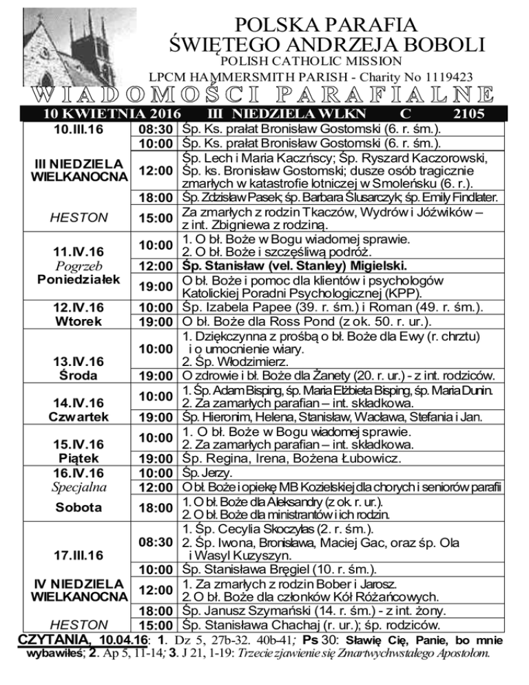 POLSKA PARAFIA ŚWIĘTEGO ANDRZEJA BOBOLI POLISH CATHOLIC MISSION LPCM HAMMERSMITH PARISH - Charity No 1119423 10 KWIETNIA 2016 III NIEDZIELA WLKN C 2105 10.III.16 08:30 Śp. Ks. prałat Bronisław Gostomski (6. r. śm.). 10:00 Śp. Ks. prałat Bronisław Gostomski (6. r. śm.). Lech i Maria Kaczńscy; Śp. Ryszard Kaczorowski, III NIEDZIELA 12:00 Śp. Śp. ks. Bronisław Gostomski; dusze osób tragicznie WIELKANOCNA zmarłych w katastrofie lotniczej w Smoleńsku (6. r.). 18:00 Śp. Zdzisław Pasek; śp. Barbara Ślusarczyk; śp. Emily Findlater. zmarłych z rodzin Tkaczów, Wydrów i Jóźwików – HESTON 15:00 Za z int. Zbigniewa z rodziną. O bł. Boże w Bogu wiadomej sprawie. 10:00 1. 11.IV.16 2. O bł. Boże i szczęśliwą podróż. Pogrzeb 12:00 Śp. Stanisław (vel. Stanley) Migielski. Poniedziałek bł. Boże i pomoc dla klientów i psychologów 19:00 O Katolickiej Poradni Psychologicznej (KPP). 12.IV.16 10:00 Śp. Izabela Papee (39. r. śm.) i Roman (49. r. śm.). Wtorek 19:00 O bł. Boże dla Ross Pond (z ok. 50. r. ur.). 1. Dziękczynna z prośbą o bł. Boże dla Ewy (r. chrztu) 10:00 i o umocnienie wiary. 13.IV.16 2. Śp. Włodzimierz. Środa 19:00 O zdrowie i bł. Boże dla Żanety (20. r. ur.) - z int. rodziców. Śp. Adam Bisping, śp. Maria Elżbieta Bisping, śp. Maria Dunin. 10:00 1. 14.IV.16 2. Za zamarłych parafian – int. składkowa. Czwartek 19:00 Śp. Hieronim, Helena, Stanisław, Wacława, Stefania i Jan. O bł. Boże w Bogu wiadomej sprawie. 10:00 1. 15.IV.16 2. Za zamarłych parafian – int. składkowa. Piątek 19:00 Śp. Regina, Irena, Bożena Łubowicz. 16.IV.16 10:00 Śp. Jerzy. Specjalna 12:00 O bł. Boże i opiekę MB Kozielskiej dla chorych i seniorów parafii O bł. Boże dla Aleksandry (z ok. r. ur.). Sobota 18:00 1. 2. O bł. Boże dla ministrantów i ich rodzin. 1. Śp. Cecylia Skoczylas (2. r. śm.). 08:30 2. Śp. Iwona, Bronisława, Maciej Gac, oraz śp. Ola 17.III.16 i Wasyl Kuzyszyn. 10:00 Śp. Stanisława Bręgiel (10. r. śm.). IV NIEDZIELA 1. Za zmarłych z rodzin Bober i Jarosz. WIELKANOCNA 12:00 2. O bł. Boże dla członków Kół Różańcowych. 18:00 Śp. Janusz Szymański (14. r. śm.) - z int. żony. HESTON 15:00 Śp. Stanisława Chachaj (r. ur.); śp. rodziców. CZYTANIA, 10.04.16: 1. Dz 5, 27b-32. 40b-41; Ps 30: Sławię Cię, Panie, bo mnie wybawiłeś; 2. Ap 5, 11-14; 3. J 21, 1-19: Trzecie zjawienie się Zmartwychwstałego Apostołom. NIEDZIELA 10 KWIETNIA 2016 - ROCZNICA SMOLEŃSKA 09:00-13:30, kawiarnia WARSZTATY MODLITWY O UWOLNIENIE – cz II. KAWIARNIA i SKLEP IK w dniu dzis iejszy m NIEC ZYN NE 12:00, kościół: Msza św. za ofiary katastrofy smoleńskiej (6 r.). 17.30, kościół: Wystawienie i prywatna adoracja Najświętszego Sakramentu. PONIEDZIALEK 11 KWIATNIA 2016 20:00, sala św. Józefa: Kurs przedmałżeński (kat.1) - zapisy. 20:00, kawiarnia: Spotkanie lektorów (film: Czy wierzysz? i dyskusja o wierze). WTOREK 12 KWIETNIA 2016 12:00, sala św. Józefa: „Złote Rybki” czyli spotkanie mam/opiekunów i małych dzieci. 20:00, sala św. Józefa: Kurs przedmałżeński (kat.2). 20:00, kościół: Re-katechezy Drogi Neokatechumenalnej. 20:00, salka: Spotkanie polskiej grupy AA (Basement, 18 Greenside Road, W12). ŚRODA 13 KWIETNIA 2016 11:00, kawiarnia: Spotkanie Klubu Brydżowego. 18:30, sala św. Józefa i kawiarnia: próba Scholi. 19:00, kaplica MB: Msza i nabożeństwo do MB Kozielskiej. 20:00, sala św. Józefa: Kurs przedmałżeński (kat.3). CZWARTEK 14 KWIETNIA 2016 12:00, sala św. Józefa: „Złote Rybki” czyli spotkanie mam/opiekunów i małych dzieci. 18:30, kościół, Różaniec misyjny (zaprasza Gr. Misyjna). 19:30-21:00, kaplica MB: adoracja Najśw. Sakramentu. 20:00, sala św. Józefa: Kurs przedmałżeński (kat.4). 20:00, kawiarnia: Spotkania GALILEI. 20:00, salka: Spotkania WŻCh. PIĄTEK 15 KWIETNIA 2016 10:30, kaplica B.Mił.: Koronka do Miłosierdzia Bożego. 20:00: Spotkanie RCŚ dla młodzieży (salka) i dorosłych (konferencyjna). 20:00, kościół: Re-katechezy Drogi Neokatechumenalnej. 20:00, sala św. Józefa: Spotkanie członków Jezu Ufam Tobie. 20:00, kawiarnia: Grupa Wielbienia. SOBOTA 16 KWIETNIA 2016 12:00-15:00, kościół i kawiarnia: Parafialny Dzień Chorych i Seniorów. 17:00, kaplica MB: Katecheza chrzcielna na czerwiec 2016. 19:00, kawiarnia: Spotkanie ministrantów „jajeczko” wielkanocne. NIEDZIELA 17 KWIETNIA 2016 09:00-13:30 : Zapraszamy do kaw iarni i sk lepiku. 12:00 – 17:00, kościół i kawiarnia: Spotkanie dla członków Róż Różańcowych. PLAN: 12:00 Msza św. w intencji członków Kół Różańcowych; 13:00 Modlitwa różańcowa i omówienie spraw organizacyjnych; 14:00 spotkanie integracyjne przy herbatce (kawiarnia). 17:30, kościół: Wystawienie i prywatna adoracja Najświętszego Sakramentu. 18-21.04.16, 20:00, sala św. Józefa: kurs przedmałżeński (cz.II). 19, 22, 26 i 29.04.16, 20:00, kościół: Re-katechezy Drogi Neokatechumenalnej. 19, 19, 26 i 28.04.16, 10:00 – 12:00, sala św. Józefa: „Złote Rybki” czyli spotkanie mam/opiekunów i małych dzieci. 19 i 26.04.16, 20:00, salka (Basement,18GreensideRoad,W12): Spotkanie polskiej grupy AA. 20 i 27.04.16, 11:00, kawiarnia: Spotkanie Klubu Brydżowego. 20 i 27.04.16, 18:30, sala św. Józefa i kawiarnia: próba Scholi. 20.04.16, 20:00, konferencyjna: Spotkanie PO-IPAK’u. 21 i 28.04.16, 19:30-21:00, kaplica MB: adoracja Najśw. Sakramentu. 21 i 28.04.16, 20:00, salka: Spotkania WŻCh. 21 i 28.04.16, 20:00, kawiarnia: Spotkania GALILEI. 22 i 29.04.16, 20:00, kawiarnia: Grupa Wielbienia. 23 i 30.04.16, 16:00, kościół: katecheza Komunijna dla dzieci. 23.04.16, 19:00, kawiarnia: Spotkanie dla „Singli”. 24.04.16, kościół i Cmentarz Gunnersbury: MODLITWY KATYNSKIE. 24.04.16, kościół: II miesięczna taca na fundusz remontowy kościoła. 24.04.16, 19:00, kościół: Wieczór Wielbieniowy. 26.04.16, 11:00-16:00, Little Brompton Oratory: Spotkanie kapłanów dek. Londyn Płn. 2