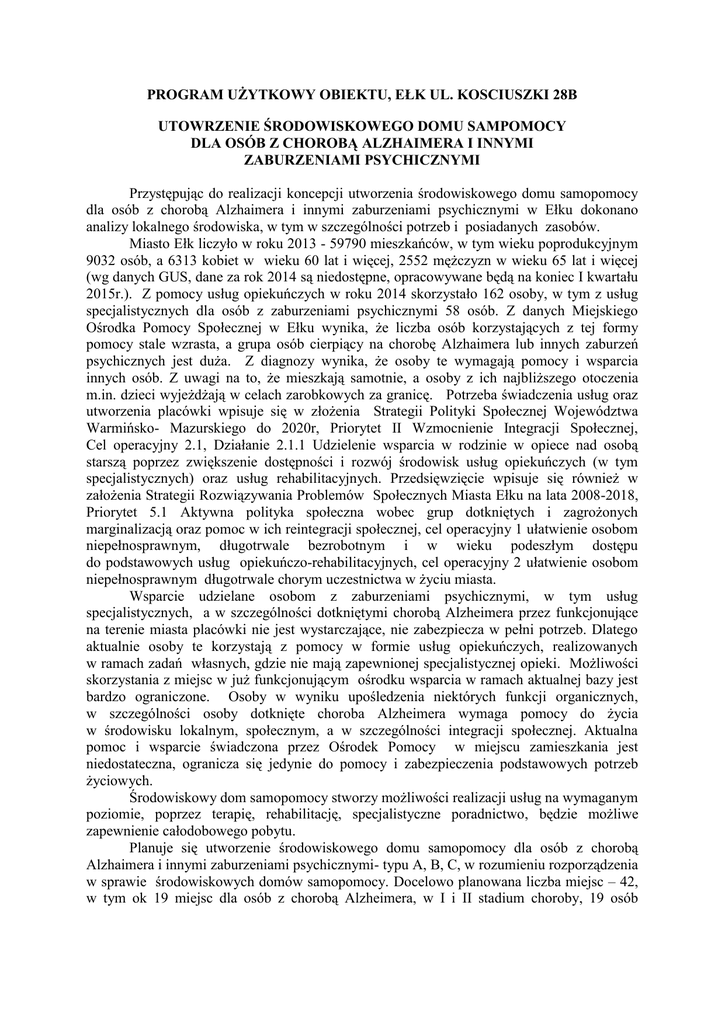 PROGRAM UŻYTKOWY OBIEKTU, EŁK UL. KOSCIUSZKI 28B UTOWRZENIE ŚRODOWISKOWEGO DOMU SAMPOMOCY DLA OSÓB Z CHOROBĄ ALZHAIMERA I INNYMI ZABURZENIAMI PSYCHICZNYMI Przystępując do realizacji koncepcji utworzenia środowiskowego domu samopomocy dla osób z chorobą Alzhaimera i innymi zaburzeniami psychicznymi w Ełku dokonano analizy lokalnego środowiska, w tym w szczególności potrzeb i posiadanych zasobów. Miasto Ełk liczyło w roku 2013 - 59790 mieszkańców, w tym wieku poprodukcyjnym 9032 osób, a 6313 kobiet w wieku 60 lat i więcej, 2552 mężczyzn w wieku 65 lat i więcej (wg danych GUS, dane za rok 2014 są niedostępne, opracowywane będą na koniec I kwartału 2015r.). Z pomocy usług opiekuńczych w roku 2014 skorzystało 162 osoby, w tym z usług specjalistycznych dla osób z zaburzeniami psychicznymi 58 osób. Z danych Miejskiego Ośrodka Pomocy Społecznej w Ełku wynika, że liczba osób korzystających z tej formy pomocy stale wzrasta, a grupa osób cierpiący na chorobę Alzhaimera lub innych zaburzeń psychicznych jest duża. Z diagnozy wynika, że osoby te wymagają pomocy i wsparcia innych osób. Z uwagi na to, że mieszkają samotnie, a osoby z ich najbliższego otoczenia m.in. dzieci wyjeżdżają w celach zarobkowych za granicę. Potrzeba świadczenia usług oraz utworzenia placówki wpisuje się w złożenia Strategii Polityki Społecznej Województwa Warmińsko- Mazurskiego do 2020r, Priorytet II Wzmocnienie Integracji Społecznej, Cel operacyjny 2.1, Działanie 2.1.1 Udzielenie wsparcia w rodzinie w opiece nad osobą starszą poprzez zwiększenie dostępności i rozwój środowisk usług opiekuńczych (w tym specjalistycznych) oraz usług rehabilitacyjnych. Przedsięwzięcie wpisuje się również w założenia Strategii Rozwiązywania Problemów Społecznych Miasta Ełku na lata 2008-2018, Priorytet 5.1 Aktywna polityka społeczna wobec grup dotkniętych i zagrożonych marginalizacją oraz pomoc w ich reintegracji społecznej, cel operacyjny 1 ułatwienie osobom niepełnosprawnym, długotrwale bezrobotnym i w wieku podeszłym dostępu do podstawowych usług opiekuńczo-rehabilitacyjnych, cel operacyjny 2 ułatwienie osobom niepełnosprawnym długotrwale chorym uczestnictwa w życiu miasta. Wsparcie udzielane osobom z zaburzeniami psychicznymi, w tym usług specjalistycznych, a w szczególności dotkniętymi chorobą Alzheimera przez funkcjonujące na terenie miasta placówki nie jest wystarczające, nie zabezpiecza w pełni potrzeb. Dlatego aktualnie osoby te korzystają z pomocy w formie usług opiekuńczych, realizowanych w ramach zadań własnych, gdzie nie mają zapewnionej specjalistycznej opieki. Możliwości skorzystania z miejsc w już funkcjonującym ośrodku wsparcia w ramach aktualnej bazy jest bardzo ograniczone. Osoby w wyniku upośledzenia niektórych funkcji organicznych, w szczególności osoby dotknięte choroba Alzheimera wymaga pomocy do życia w środowisku lokalnym, społecznym, a w szczególności integracji społecznej. Aktualna pomoc i wsparcie świadczona przez Ośrodek Pomocy w miejscu zamieszkania jest niedostateczna, ogranicza się jedynie do pomocy i zabezpieczenia podstawowych potrzeb życiowych. Środowiskowy dom samopomocy stworzy możliwości realizacji usług na wymaganym poziomie, poprzez terapię, rehabilitację, specjalistyczne poradnictwo, będzie możliwe zapewnienie całodobowego pobytu. Planuje się utworzenie środowiskowego domu samopomocy dla osób z chorobą Alzhaimera i innymi zaburzeniami psychicznymi- typu A, B, C, w rozumieniu rozporządzenia w sprawie środowiskowych domów samopomocy. Docelowo planowana liczba miejsc – 42, w tym ok 19 miejsc dla osób z chorobą Alzheimera, w I i II stadium choroby, 19 osób z innymi zaburzeniami psychicznymi, w tym dotkniętych autyzmem, z możliwością zapewnienia opieki całodobowej dla 4 osób. Obiekt przeznaczony pod potrzeby ŚDS to budynek dwukondygnacyjny o powierzchni 335,7m2 użytkowej spełnia warunki ogólne przewidziane rozporządzeniem w sprawie środowiskowych domów samopomocy tj. otoczenie, powierzchnia, rozkład i liczba pomieszczeń. Powierzchnia użytkowa przypadająca na jednego uczestnika wynosi nie mniej niż 8 m2. Pokoje przeznaczone na opiekę całodobową, będą dwuosobowe o powierzchni nie mniejszej niż 6 m2. Budynek nie spełnia wymagań szczegółowych w zakresie standardów lokalowych i barier architektonicznych, w związku z tym wymaga nakładów finansowych na dostosowanie obiektu do możliwości świadczenia usług. Budynek znajduje się w strefie ochrony konserwatorskiej w związku z tym nie ma możliwości zastosowania w budynku schodołazów. Gmina Miasto Ełk w roku 2008-2009 tworzyła placówkę w budynku ochrony konserwatorskiej, to pozwoliło na realne oszacowanie całkowitego kosztu adaptacji obiektu. W budynku przewidujemy wykonanie prac niezbędnych do uruchomienia zakładanej placówki. Budynek wymaga wykonania prac remontowych i adaptacyjnych o wartości: 1 693 384,00 zł. . Zakres robót koszt 1. Roboty budowlane (remont dachu, remont elewacji, , 795 029,00 zł wymiana stolarki drewnianej na PCV, ocieplenie dachu, likwidacja progów, podłogi antypoślizgowe itp.) 2. Roboty sanitarne (wykonanie instalacji wodno395 689,00 zł kanalizacyjnej, wykonanie łazienek z wyposażeniem, przyłącze do deszczówki) 3. Roboty elektryczne (wykonanie instalacji elektrycznej, 157 666,00 zł wykonanie nowej instalacji oświetleniowej i ewakuacyjnej) 4. Wykonanie szybu windy i montaż windy 300 000,00 zł 5. Prace przygotowawcze 45 000,00 zł Razem: 1 693 384,00 zł W ramach prac remontowych i adaptacyjnych powstaną pracownie i pomieszczenia tj. Parter: miejsce dla całodobowej miejsce dla całodobowej opieki (dwa pokoje 2os), opieki punkt pomocy doraźnej, aneks kuchenny, jadalnia, sanitariaty, natryski, pomieszczenie gospodarcze/magazynek. I piętro: 19 miejsc dla osób z pracownie ogólna/artystyczna, komputerowoinnymi zaburzeniami fotog