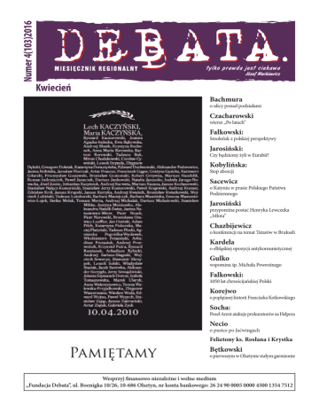 Bachmura o ulicy ponad podziałami Czacharowski wiersz „Po latach” Falkowski: Smoleńsk z polskiej perspektywy Jarosiński: Czy będziemy żyli w Eurabii? Kobylińska: Stop aborcji Sacewicz o Katyniu w prasie Polskiego Państwa Podziemnego Jarosiński przypomina postać Henryka Lewczuka „Młota” Chazbijewicz o konferencji na temat Tatarów w Brukseli Kardela o elbląskiej opozycji antykomunistycznej Gulko wspomina śp. Michała Powroźnego Falkowski: 1050 lat chrześcijańskiej Polski Korejwo o poplątanej historii Franciszka Kotkowskiego Socha: Poseł Arent atakuje prokuratorów za Helpera Necio o pustce po Jaćwingach Felietony ks. Rosłana i Krystka Pamiętamy Bętkowski o pierwszym w Olsztynie stałym garnizonie Wesprzyj finansowo niezależne i wolne medium „Fundacja Debata”, ul. Boenigka 10/26, 10-686 Olsztyn, nr konta bankowego: 26 24 90 0005 0000 4500 1354 7512 DEBATA Numer 4 (103) 2016 1 Ulica ponad podziałami W marcu minął rok jak Stowarzyszenie „Święta Warmia” złożyło na ręce pani Haliny Ciunel, przewodniczącej Rady Miasta Olsztyna, wniosek o nadanie nazwy ulicy, dzisiaj potocznie nazywanej Obiegową, imienia prezydenta Lecha Kaczyńskiego. Nie konsultowaliśmy tej inicjatywy z lokalnymi władzami, ani radnymi Prawa i Sprawiedliwości, nie szukaliśmy także tam poparcia. Uznaliśmy, że powinna to być inicjatywa społeczna, bo to jedyna dziś szansa na rzeczową, godną pamięci prezydenta i ofiar katastrofy smoleńskiej rozmowę. bogdan bachmura P ostaci Lecha Kaczyńskiego i jego długiej, rozpoczętej w 1977 r. współpracą z Komitetem Obrony Robotników służby dla ojczyzny, nikomu nie trzeba szczególnie przedstawiać. Mamy bowiem do czynienia z rzadką sytuacją, kiedy to nie kandydat i jego zasługi muszą „dorosnąć” do kryteriów nobilitujących do patronatu nad ulicą, ale raczej ludzie o tym decydujący stają przed sprawdzianem wierności zasadom, dla których pełnią funkcje publiczne. Pierwszy krok został zresztą w tym kierunku zrobiony. Pięć lat temu, rok po katastrofie smoleńskiej, dwa największe kluby radnych naszego miasta porozumiały się co do pomysłu nadania imienia prezydenta Lecha Kaczyńskiego nowej, największej wtedy inwestycji drogowej w mieście. Ostatecznie nazwano ją ulicą Artyleryjską, ponieważ uchwałą Rady Miasta przyjęto, jako obowiązujący dla nazw nowych ulic, minimum pięcioletni okres od śmierci wnioskowanego patrona. Ta przeszkoda przestała istnieć rok temu. Nasz wniosek łączy się z nadzieją na powrót do wspólnej dla klubów radnych PO i PiS idei uhonorowania pamięci prezydenta RP i poparcia pozostałych radnych oraz prezydenta miasta. Dotyczy tzw. ulicy Obiegowej, ponieważ ta nowa, zlokalizowana w centrum miasta arteria, stanowi z jednej strony przedłużenie ulicy gen. Władysława Sikorskiego, również tragicznie zmarłego w katastrofie lotniczej premiera rządu RP, a z drugiej strony łączy się z aleją marszałka Józefa Piłsudskiego, co tworzy symboliczną ciągłość i nadaje temu miejscu właściwą rangę, pozostając w zgodzie z zapisem uchwały RM dotyczącej tematycznego porządku nazewnictwa ulic. Mamy świadomość, że nasz wniosek, wobec trwającego od lat, nasilającego się konfliktu politycznego i społecznego, może budzić wiele kontrowersji. Jednak śmierć prezydenta podczas pełnienia obowiązków głowy państwa to okoliczność, która powinna unieważnić wszelkie bieżące, choćby najgłębsze podziały. Bez tego bowiem mówienie o Polakach jako narodzie jest pustą, pozbawioną treści figurą. Nikt przecież dzisiaj nie kwestionuje sensu istnienia ulic oraz innych symbolicznych miejsc upamiętniających prezydenta Gabriela Narutowicza, chociaż nie jego krótka prezydentura, ani wcześniejsze zasługi publiczne, lecz okoliczności tragicznej śmierci stanowią główny powód naszej szczególnej pamięci. Nie ulega dla mnie wątpliwości, że na podobne potraktowanie, gdyby to on znalazł się na miejscu prezydenta Kaczyńskiego, zasługiwałby prezydent Bronisław Komorowski. Wierzę, że w tej sprawie dojdzie do porozumienia, zwłaszcza z autorami wcześniej złożonych wniosków dotyczących ul. Obiegowej. Jesteśmy przekonani, że Marian Bublewicz powinien mieć swoja ulicę w naszym mieście. Dlatego cieszymy się, że autorzy wniosku w tej sprawie zmienili go z ulicy Obiegowej na ulicę łączącą miasto z przyszłą obwodnicą, w pobliżu dawnego miejsca zamieszkania Mariana Bublewicza. Szczególnie zależy nam na poparciu rad osiedli Kościuszki i Kormoran, które wnioskowały o patronat prof. Zbigniewa Religi, i które w tym pomyśle wspieraliśmy. Jak wspomniałem na początku, nasz wniosek złożyliśmy ponad rok temu. Zaprosiliśmy też na zebranie stowarzyszenia panią Halinę Ciunel, przewodniczącą RM i Łukasza Łukaszewskiego, przewod- niczącego Komisji Gospodarki Komunalnej. Wydawało się, że nasza argumentacja dotycząca patronatu prezydenta Kaczyńskiego spotkała się ze zrozumieniem. Niestety, choć nowa ulica dawno została oddana do użytku, my nawet nie zostaliśmy zaproszeni na posiedzenie Komisji Gospodarki Komunalnej. Żadnego skutku, pomimo zapewnień i obietnic, nie przynoszą bezpośrednie interwencje u pani Ciunel, a od pana Łukaszewskiego dowiedziałem się, że podobno pojawiły się jakieś nowe wnioski i są one opiniowane przez jakąś tajemniczą komisję w Ośrodku Badań Naukowych. To nie pierwszy wniosek składany przez nas do Rady Miasta. Jednak z takim traktowaniem spotykamy się po raz pierwszy. Wielokrotnie też słyszałem od radnych, że „nie zajmują się polityką”. To doskonała okazja na wykazanie tego w praktyce. Zwłaszcza teraz, kiedy żywo dyskutowane są granice władzy demokratycznej większości, a na demonstracjach KOD-u, także z udziałem pani Haliny Ciunel, ich uczestnicy protestują przeciwko jej przekraczaniu. Wniosek dotyczący ulicy prezydenta Kaczyńskiego tylko pozor