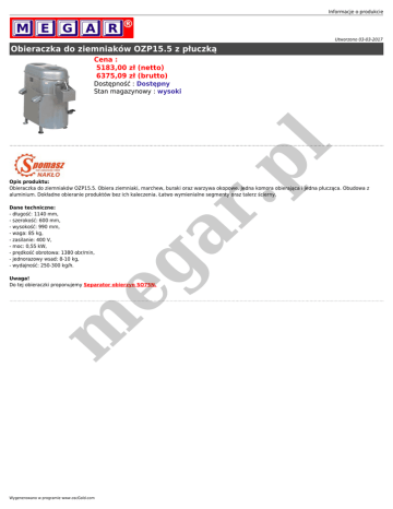 Informacje o produkcie Utworzono 03-03-2017 Obieraczka do ziemniaków OZP15.5 z płuczką Cena : 5183,00 zł (netto) 6375,09 zł (brutto) .p l Dostępność : Dostępny Stan magazynowy : wysoki eg Dane techniczne: - długość: 1140 mm, - szerokość: 600 mm, - wysokość: 990 mm, - waga: 85 kg, - zasilanie: 400 V, - moc: 0,55 kW, - prędkość obrotowa: 1380 obr/min, - jednorazowy wsad: 8-10 kg, - wydajność: 250-300 kg/h. ar Opis produktu: Obieraczka do ziemniaków OZP15.5. Obiera ziemniaki, marchew, buraki oraz warzywa okopowe. Jedna komora obierająca i jedna płucząca. Obudowa z aluminium. Dokładne obieranie produktów bez ich kaleczenia. Łatwo wymienialne segmenty oraz talerz ścierny. m Uwaga! Do tej obieraczki proponujemy Separator obierzyn SO75N. Wygenerowano w programie www.oscGold.com