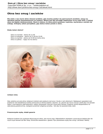Dom.pl | Okna bez smug i zacieków Copyright DOM.pl Sp. z o.o. - [email protected] http://www.dom.pl/okna-bez-smug-i-zaciekow.html Okna bez smug i zacieków Dla wielu z nas mycie okien stanowi problem, gdy musimy pozbyć się uporczywych zacieków, smug czy odcisków palców pozostawionych na szybach. Ważne jest aby porządki zaplanować na tę część dnia, w której okno nie będzie nasłonecznione. Mycie w słońcu, to istna praca syzyfowa, czyścimy, wycieramy a zacieki nie znikają. Unikajmy zatem porządków, gdy słońce świeci prosto w okno. Kiedy świeci słońce? - Okna - Okna - Okna - Okna na na na na wschód – słońce do 11.00 południe – słońce od 11.00 do 15.00 zachód – słońce od 15.00 do końca dnia północ – nigdy nie ma słońca Lśniące ramy Gdy ustalimy już porę dnia, kolejnym krokiem jest pozbycie się kurzu i brudu z ram okiennych. Najlepszym sposobem jest przetarcie ram bawełnianą ścierką zamoczoną w letniej wodzie z płynem, np. płynem do mycia naczyń. Jeżeli płyn nie poradzi sobie z mocniejszymi zabrudzeniami, należy zastosować mleczko czyszczące Sansed. Preparat nanieś bezpośrednio na zabrudzoną powierzchnię, następnie przetrzeć wilgotną szmatką – tak aby nie pozostał biały nalot. Przezroczyste szyby, dzięki gazecie Kolejnym krokiem do uzyskania błyszczących okien, jest mycie szyb. Odpowiednim zestawem czyszczącym będzie płyn do mycia szyb Sansed lub Non Stop, ściereczka bawełniana i gazeta. Płyn pozostawia szyby bez smug i zacieków. Należy page 1 / 2 Dom.pl | Okna bez smug i zacieków Copyright DOM.pl Sp. z o.o. - [email protected] http://www.dom.pl/okna-bez-smug-i-zaciekow.html spryskać szybę płynem, następnie rozprowadzić go bawełnianą ściereczką. Na koniec zostaje polerowanie. W sklepach możemy kupić specjalne ściereczki do polerowania szyb. Niestety, to drogie produkty, dlatego świetnym zamiennikiem będą stare gazety. Pewnymi ruchami wycieramy szybę, aż do uzyskania oczekiwanego efektu. Rodzina w komplecie Pamiętaj, że przy porządkach domowych zaangażowana może być cała rodzina. Dziecko poczuje się w obowiązku jak najlepiej wywiązać z powierzonego zadania, jakim będzie umycie dolnej części okna balkonowego. Natomiast każdy mężczyzna będzie zadowolony jeżeli poprosisz go o pomoc, gdy umycie okna będzie wymagało wejścia na drabinę. Krok po kroku, bez zacieków - usuń zabrudzenia z ram okiennych (jeżeli będą bardzo uciążliwe, użyj mleczka czyszczącego Sansed) - umyj szybę płynem do mycia szyb Non Stop lub Sansed - użyj ściągaczki lub bawełnianej szmatki do zebrania płynu - wykorzystując gazetę wypoleruj szybę Akcesoria czyszczące Sprzęty i środki czyszczące: - miska z ciepłą wodą - płyn do mycia szyb Sansed - mleczko do szorowania Sansed - szmatka bawełniana - gazeta - ściągaczka page 2 / 2