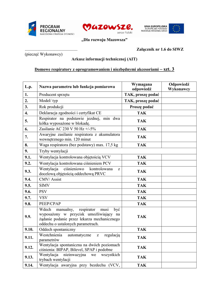 „Dla rozwoju Mazowsza” .................................................. Załącznik nr 1.6 do SIWZ (pieczęć Wykonawcy) Arkusz informacji technicznej (AIT) Domowe respiratory z oprogramowaniem i niezbędnymi akcesoriami – szt. 3 L.p. Nazwa parametru lub funkcja pomiarowa 1. 2. 3. 4. Producent sprzętu Model/ typ Rok produkcji Deklaracja zgodności i certyfikat CE Respirator na podstawie jezdnej, min dwa kółka wyposażone w blokadę. Zasilanie AC 230 V 50 Hz +/-5% Awaryjne zasilanie respiratora z akumulatora wewnętrznego min. 120 minut Waga respiratora (bez podstawy) max. 17,5 kg Tryby wentylacji Wentylacja kontrolowana objętością VCV Wentylacja kontrolowana ciśnieniem PCV Wentylacja ciśnieniowo kontrolowana z docelową objętością oddechową PRVC CMV/ Assist SIMV PSV VSV PEEP/CPAP Wdech manualny, respirator musi być wyposażony w przycisk umożliwiający na żądanie podanie przez lekarza mechanicznego oddechu o ustalonych parametrach. Oddech spontaniczny Westchnienia automatyczne z regulacją parametrów Wentylacja spontaniczna na dwóch poziomach ciśnienia: BIPAP, Bilevel, SPAP i podobne Wentylacja nieinwazyjna we wszystkich trybach wentylacji Wentylacja awaryjna przy bezdechu (VCV, 5. 6. 7. 8. 9. 9.1. 9.2. 9.3. 9.4. 9.5. 9.6. 9.7. 9.8. 9.9. 9.10. 9.11. 9.12. 9.13. 9.14. Wymagana odpowiedź TAK, proszę podać TAK, proszę podać Proszę podać TAK TAK TAK TAK TAK TAK TAK TAK TAK TAK TAK TAK TAK TAK TAK TAK TAK TAK TAK Odpowiedź Wykonawcy 9.15. 10. 11. 12. 13. 14. 15. 16. 17. 18. 19. 20. 21. 21.1. 21.2. 21.3. 21.4. 21.5. 21.6. 21.7. 21.8. 21.9. 21.10. 21.11. 21.12. 21.13. PCV, PRVC) Tryb automatycznie przełączanej wentylacji wymuszonej/spontanicznej typu Auto Mode lub Auto Control Częstość oddechów minimalny zakres 1–120 odd./min Objętość pojedynczego oddechu minimalny zakres 40– 1800 ml Czas wdechu minimalny zakres 0,2 – 9 s Stężenie tlenu w mieszaninie oddechowej regulowane płynnie w zakresie 21 – 100% Ciśnienie wdechowe PCV minimalny zakres 2 – 80 cmH2O Ciśnienie wspomagania PSV minimalny zakres 0 – 60 cmH2O PEEP/CPAP minimalny zakres 0 – 40 cmH2O Przepływowy tryb rozpoznawania oddechu własnego pacjenta minimalny zakres 0,5 – 20 l/min Ciśnieniowy tryb rozpoznawania oddechu własnego pacjenta minimalny zakres 1 – 20 cmH2O Możliwość regulacji wspomagania oddechu spontanicznego ciśnienia na obu poziomach ciśnienia przy BiPAP, BiLevel, SPAP, APRV Regulowane procentowe kryterium zakończenia fazy wdechowej w trybie PSV minimalny zakres 10 – 70 [%] Obrazowanie mierzonych parametrów wentylacji Wbudowany kolorowy, dotykowy monitor obrazowania parametrów wentylacji, przekątna minimum 12 cali Integralny pomiar stężenia tlenu Całkowita częstość oddychania Częstość oddechów spontanicznych Procentowa ilość oddechów spontanicznych w ciągu 1 godz. Wydechowa objętość pojedynczego oddechu Wydechowa objętość całkowitej wentylacji minutowej Wydechowa objętość minutowa wentylacji spontanicznej Ciśnienie szczytowe Średnie ciśnienie w układzie oddechowym Stosunek wdech/wydech I:E Czas wdechu Czas wydechu TAK TAK TAK TAK TAK TAK TAK TAK TAK TAK TAK TAK TAK TAK TAK TAK TAK TAK TAK TAK TAK TAK TAK TAK TAK 21.14. 21.15. 21.16. 21.17. 21.18. 21.19. 21.20. 21.21. 21.22. 21.23. 21.24. 22. 22.1. 22.2. 22.3. 22.4. 22.5. 22.6. 22.7. 22.8. 23. 23.1. 23.2. 23.3. 23.4. 23.5. 23.6. 23.7. 23.8. Stosunek czasu wdechu do czasu całkowitego oddechu Ti/Ttot Ciśnienie PEEP/CPAP Ciśnienie plateau Pomiar oporności wdechowej i wydechowej Pomiar podatności statycznej Pomiar ciśnienia AutoPEEP Pomiar P0.1 Pomiar pracy oddechowej WOBimp Pomiar wydechowej stałej czasowej RCe Możliwość równoczesnego obrazowania trzech przebiegów krzywych w czasie rzeczywistym dla ciśnienia, przepływu i objętości w funkcji czasu i jednej pętli zamkniętej do wyboru: ciśnienie/objętość lub przepływ/objętość Wykresy trendów parametrów mierzonych (minimum 72 godzinne) Alarmy Braku zasilania w energię elektryczną Całkowitej objętości minutowej (wysokiej i niskiej) Niskiej objętości oddechowej pojedynczego oddechu Wysokiego ciśnienia w układzie pacjenta Niskiego ciśnienia w układzie pacjenta Wysokiej i niskiej częstości oddechowej Bezdechu Pamięć alarmów z ich opisem, minimum 800 zdarzeń Inne pożądane funkcje i wyposażenie Zabezpieczenie przed przypadkową zmianą parametrów wentylacji Wstępne ustawienia parametrów wentylacji i alarmów na podstawie wagi pacjenta IBW Autotest aparatu sprawdzający poprawność działania elementów pomiarowych, szczelność i podatność układu oddechowego Kompletny układ oddechowy wielorazowy dla dorosłych z pułapką wodną w ramieniu wydechowym Wewnętrzny nebulizator Ramię przegubowe, uchylne do układu oddechowego pacjenta Szyny boczne do mocowania akcesoriów Obsługa poprzez ekran dotykowy, przyciski i TAK TAK TAK TAK TAK TAK TAK TAK TAK TAK TAK TAK TAK TAK TAK TAK TAK TAK TAK TAK TAK TAK TAK TAK TAK TAK TAK pokrętło 24. 24.1. 24.2. 24.3. 25. 26. 27. 28. 29. 30. 31. 32. 33. Okres gwarancji: co najmniej 24 miesiące. Przeglądy w okresie zaoferowanej gwarancji nie mniej niż 1 na 12 miesięcy, zgodnie z instrukcją obsługi producenta. Czas podjęcia czynności naprawczych: maksymalnie do 48 godzin od daty dostawy do serwisu. Aparat zastępczy na czas naprawy gwarancyjnej przy naprawach trwających powyżej 5 dni roboczych. Oprogramowanie w języku polskim Urządzenia kompatybilne z systemem opisanym w załączniku 1.1 do SIWZ Autoryzowany przez producenta serwis na terenie Polski lub serwis bezpośrednio u producenta na terenie Polski Zagwarantowanie dostępności serwisu, oprogramowania i części zamiennych przez co najmniej 5 lat od daty dostawy. Szkolenie personelu jednostki medycznoopiekuńczej – co najmniej 10 osób nie krócej niż 5 godzin wraz z materiałami szkoleniowym. Terminy szkoleń uzgadniane pisemnie z jednostką objętą pilotażowym wdrożeniem z