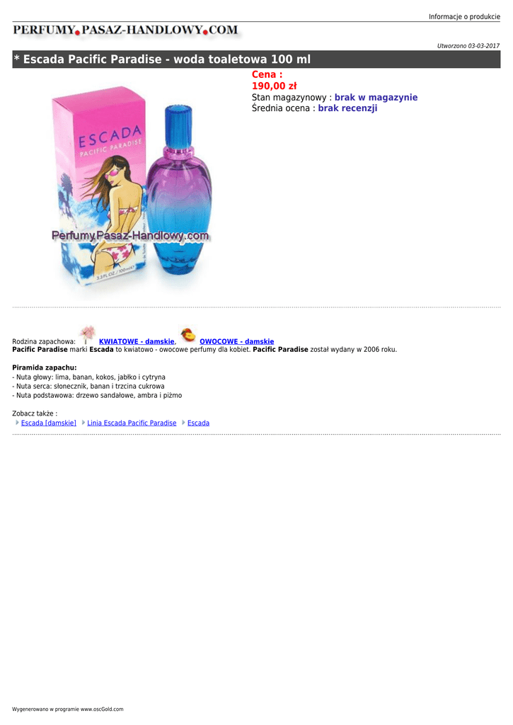 Informacje o produkcie Utworzono 03-03-2017 * Escada Pacific Paradise - woda toaletowa 100 ml Cena : 190,00 zł Stan magazynowy : brak w magazynie Średnia ocena : brak recenzji Rodzina zapachowa: KWIATOWE - damskie, OWOCOWE - damskie Pacific Paradise marki Escada to kwiatowo - owocowe perfumy dla kobiet. Pacific Paradise został wydany w 2006 roku. Piramida zapachu: - Nuta głowy: lima, banan, kokos, jabłko i cytryna - Nuta serca: słonecznik, banan i trzcina cukrowa - Nuta podstawowa: drzewo sandałowe, ambra i piżmo Zobacz także : Escada [damskie] Linia Escada Pacific Paradise Wygenerowano w programie www.oscGold.com Escada