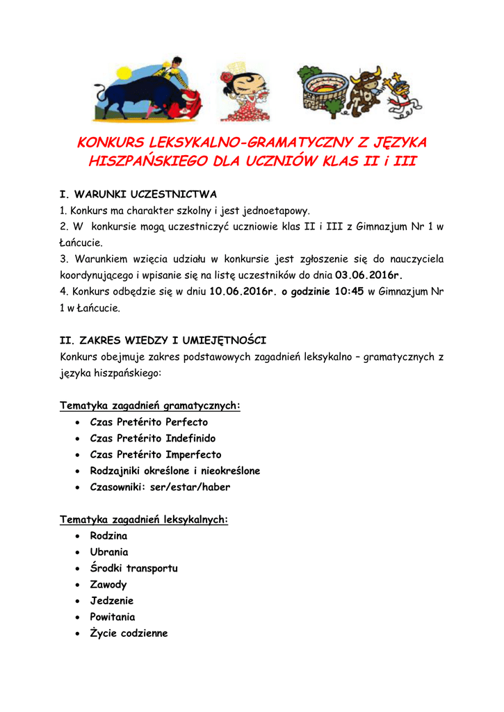 KONKURS LEKSYKALNO-GRAMATYCZNY Z J ZYKA HISZPA SKIEGO DLA UCZNIÓW KLAS II i III I. WARUNKI UCZESTNICTWA 1. Konkurs ma charakter szkolny i jest jednoetapowy. 2. W konkursie mog uczestniczy uczniowie klas II i III z Gimnazjum Nr 1 w cucie. 3. Warunkiem wzi cia udzia u w konkursie jest zg oszenie si do nauczyciela koordynuj cego i wpisanie si na list uczestników do dnia 03.06.2016r. 4. Konkurs odb dzie si w dniu 10.06.2016r. o godzinie 10:45 w Gimnazjum Nr 1w cucie. II. ZAKRES WIEDZY I UMIEJ TNO CI Konkurs obejmuje zakres podstawowych zagadnie leksykalno – gramatycznych z zyka hiszpa skiego: Tematyka zagadnie gramatycznych: Czas Pretérito Perfecto Czas Pretérito Indefinido Czas Pretérito Imperfecto Rodzajniki okre lone i nieokre lone Czasowniki: ser/estar/haber Tematyka zagadnie leksykalnych: Rodzina Ubrania rodki transportu Zawody Jedzenie Powitania ycie codzienne