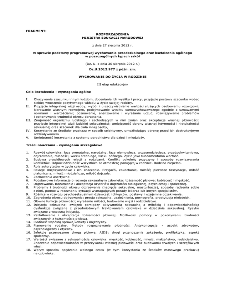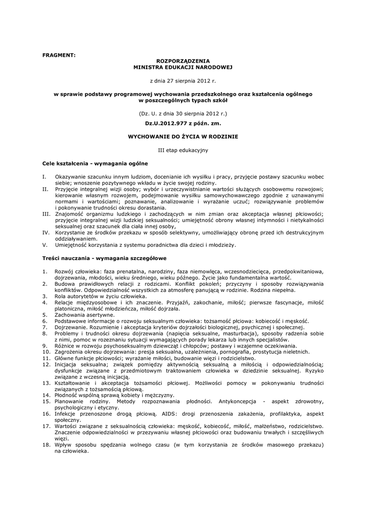 FRAGMENT: ROZPORZĄDZENIA MINISTRA EDUKACJI NARODOWEJ z dnia 27 sierpnia 2012 r. w sprawie podstawy programowej wychowania przedszkolnego oraz kształcenia ogólnego w poszczególnych typach szkół (Dz. U. z dnia 30 sierpnia 2012 r.) Dz.U.2012.977 z późn. zm. WYCHOWANIE DO ŻYCIA W RODZINIE III etap edukacyjny Cele kształcenia - wymagania ogólne I. Okazywanie szacunku innym ludziom, docenianie ich wysiłku i pracy, przyjęcie postawy szacunku wobec siebie; wnoszenie pozytywnego wkładu w życie swojej rodziny. II. Przyjęcie integralnej wizji osoby; wybór i urzeczywistnianie wartości służących osobowemu rozwojowi; kierowanie własnym rozwojem, podejmowanie wysiłku samowychowawczego zgodnie z uznawanymi normami i wartościami; poznawanie, analizowanie i wyrażanie uczuć; rozwiązywanie problemów i pokonywanie trudności okresu dorastania. III. Znajomość organizmu ludzkiego i zachodzących w nim zmian oraz akceptacja własnej płciowości; przyjęcie integralnej wizji ludzkiej seksualności; umiejętność obrony własnej intymności i nietykalności seksualnej oraz szacunek dla ciała innej osoby, IV. Korzystanie ze środków przekazu w sposób selektywny, umożliwiający obronę przed ich destrukcyjnym oddziaływaniem. V. Umiejętność korzystania z systemu poradnictwa dla dzieci i młodzieży. Treści nauczania - wymagania szczegółowe 1. 2. 3. 4. 5. 6. 7. 8. 9. 10. 11. 12. 13. 14. 15. 16. 17. 18. Rozwój człowieka: faza prenatalna, narodziny, faza niemowlęca, wczesnodziecięca, przedpokwitaniowa, dojrzewania, młodości, wieku średniego, wieku późnego. Życie jako fundamentalna wartość. Budowa prawidłowych relacji z rodzicami. Konflikt pokoleń; przyczyny i sposoby rozwiązywania konfliktów. Odpowiedzialność wszystkich za atmosferę panującą w rodzinie. Rodzina niepełna. Rola autorytetów w życiu człowieka. Relacje międzyosobowe i ich znaczenie. Przyjaźń, zakochanie, miłość; pierwsze fascynacje, miłość platoniczna, miłość młodzieńcza, miłość dojrzała. Zachowania asertywne. Podstawowe informacje o rozwoju seksualnym człowieka: tożsamość płciowa: kobiecość i męskość. Dojrzewanie. Rozumienie i akceptacja kryteriów dojrzałości biologicznej, psychicznej i społecznej. Problemy i trudności okresu dojrzewania (napięcia seksualne, masturbacja), sposoby radzenia sobie z nimi, pomoc w rozeznaniu sytuacji wymagających porady lekarza lub innych specjalistów. Różnice w rozwoju psychoseksualnym dziewcząt i chłopców; postawy i wzajemne oczekiwania. Zagrożenia okresu dojrzewania: presja seksualna, uzależnienia, pornografia, prostytucja nieletnich. Główne funkcje płciowości; wyrażanie miłości, budowanie więzi i rodzicielstwo. Inicjacja seksualna; związek pomiędzy aktywnością seksualną a miłością i odpowiedzialnością; dysfunkcje związane z przedmiotowym traktowaniem człowieka w dziedzinie seksualnej. Ryzyko związane z wczesną inicjacją. Kształtowanie i akceptacja tożsamości płciowej. Możliwości pomocy w pokonywaniu trudności związanych z tożsamością płciową. Płodność wspólną sprawą kobiety i mężczyzny. Planowanie rodziny. Metody rozpoznawania płodności. Antykoncepcja - aspekt zdrowotny, psychologiczny i etyczny. Infekcje przenoszone drogą płciową. AIDS: drogi przenoszenia zakażenia, profilaktyka, aspekt społeczny. Wartości związane z seksualnością człowieka: męskość, kobiecość, miłość, małżeństwo, rodzicielstwo. Znaczenie odpowiedzialności w przezywaniu własnej płciowości oraz budowaniu trwałych i szczęśliwych więzi. Wpływ sposobu spędzania wolnego czasu (w tym korzystania ze środków masowego przekazu) na człowieka.