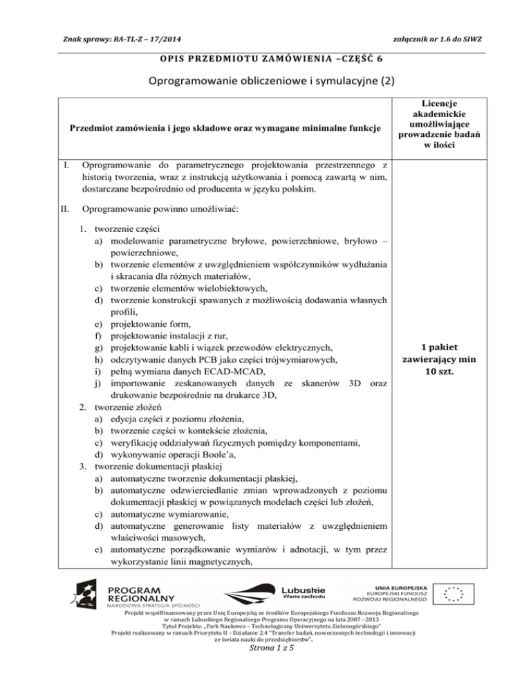 Znak sprawy: RA-TL-Z – 17/2014 załącznik nr 1.6 do SIWZ OPIS PRZEDMIOT U ZAMÓWIENIA –CZĘŚĆ 6 Oprogramowanie obliczeniowe i symulacyjne (2) Przedmiot zamówienia i jego składowe oraz wymagane minimalne funkcje I. II. Licencje akademickie umożliwiające prowadzenie badań w ilości Oprogramowanie do parametrycznego projektowania przestrzennego z historią tworzenia, wraz z instrukcją użytkowania i pomocą zawartą w nim, dostarczane bezpośrednio od producenta w języku polskim. Oprogramowanie powinno umożliwiać: 1. tworzenie części a) modelowanie parametryczne bryłowe, powierzchniowe, bryłowo – powierzchniowe, b) tworzenie elementów z uwzględnieniem współczynników wydłużania i skracania dla różnych materiałów, c) tworzenie elementów wielobiektowych, d) tworzenie konstrukcji spawanych z możliwością dodawania własnych profili, e) projektowanie form, f) projektowanie instalacji z rur, g) projektowanie kabli i wiązek przewodów elektrycznych, h) odczytywanie danych PCB jako części trójwymiarowych, i) pełną wymiana danych ECAD-MCAD, j) importowanie zeskanowanych danych ze skanerów 3D oraz drukowanie bezpośrednie na drukarce 3D, 2. tworzenie złożeń a) edycja części z poziomu złożenia, b) tworzenie części w kontekście złożenia, c) weryfikację oddziaływań fizycznych pomiędzy komponentami, d) wykonywanie operacji Boole’a, 3. tworzenie dokumentacji płaskiej a) automatyczne tworzenie dokumentacji płaskiej, b) automatyczne odzwierciedlanie zmian wprowadzonych z poziomu dokumentacji płaskiej w powiązanych modelach części lub złożeń, c) automatyczne wymiarowanie, d) automatyczne generowanie listy materiałów z uwzględnieniem właściwości masowych, e) automatyczne porządkowanie wymiarów i adnotacji, w tym przez wykorzystanie linii magnetycznych, 1 pakiet zawierający min 10 szt. Projekt współfinansowany przez Unię Europejską ze środków Europejskiego Funduszu Rozwoju Regionalnego w ramach Lubuskiego Regionalnego Programu Operacyjnego na lata 2007 –2013 Tytuł Projektu: „Park Naukowo – Technologiczny Uniwersytetu Zielonogórskiego” Projekt realizowany w ramach Priorytetu II – Działanie 2.4 ”Transfer badań, nowoczesnych technologii i innowacji ze świata nauki do przedsiębiorstw”. Strona 1 z 5 Znak sprawy: RA-TL-Z – 17/2014 załącznik nr 1.6 do SIWZ OPIS PRZEDMIOT U ZAMÓWIENIA –CZĘŚĆ 6 4. 5. 6. 7. 8. f) automatyczne tabele otworów, spawów, g) kontrola rysunków (porównywanie), h) obsługa standardów międzynarodowych, weryfikacja projektów a) wykrywanie kolizji i przenikania, b) sprawdzanie wyrównania otworów, c) sprawdzanie technologiczności projektu, d) analiza pochyleń i podcięć, e) narzędzie kosztorysowania projektów, f) narzędzie analizy stosu tolerancji, ponowne wykorzystanie projektów i automatyzacja a) wyszukiwanie plików, b) konfiguracje c) inteligentne komponenty i łączniki, d) harmonogram zadań, e) standardowa bibliotek komponentów, możliwość odczytu i zapisu wielu formatów elektronicznych plików, między innymi ACIS (SAT), CADKEY, CGR, HCG, DXF/DWG, HOOPS, IDF, IGES, JPEG, Parasolid, STEP, STL, TIFF, VDA-FS, ASM, SLDASM, DRW, SLDDRW, PRT, SLDPRT. Oprogramowanie powinno umożliwiać operacje na importowanym obiekcie bryłowym, tak aby edytować definicję rozpoznanych operacji, aby zmienić ich parametry. Dla operacji opartych na szkicach, po rozpoznaniu operacji powinna być możliwość edycji szkiców z drzewa operacji, aby zmienić geometrię operacji. program powinien pozwalać: a) tworzyć wysokiej jakości fotograficznie realistyczne obrazy modeli (narzędzie bezpośrednio zintegrowane z oknem projektowym), b) zarządzać dokumentacją projektową i okołoprojektową do użycia w środowisku projektowym, używając procedur wyewidencjonowania, zaewidencjonowania, kontroli poprawek i innych zadań administracyjnych, c) zamianę plików 2D (dxf, dwg) na parametryczne modele bryłowe 3D, d) uproszczone analizy strukturalne wytrzymałościowe w zakresie liniowym (MES) dla pojedynczych części zintegrowane bezpośrednio ze środowiskiem projektowym, e) uproszczone analizy przepływu (CFD) dla części, f) tworzenie animacji (widoki eksplodowane, ukrywanie komponentów) i zapisywania jako filmy g) animacje typu „przejście” i „przelot” program powinien posiadać moduły: a) do zapisu modeli do pliku PDF 3D, Projekt współfinansowany przez Unię Europejską ze środków Europejskiego Funduszu Rozwoju Regionalnego w ramach Lubuskiego Regionalnego Programu Operacyjnego na lata 2007 –2013 Tytuł Projektu: „Park Naukowo – Technologiczny Uniwersytetu Zielonogórskiego” Projekt realizowany w ramach Priorytetu II – Działanie 2.4 ”Transfer badań, nowoczesnych technologii i innowacji ze świata nauki do przedsiębiorstw”. Strona 2 z 5 Znak sprawy: RA-TL-Z – 17/2014 załącznik nr 1.6 do SIWZ OPIS PRZEDMIOT U ZAMÓWIENIA –CZĘŚĆ 6 b) do publikowania modeli i dokumentacji do plików .exe z możliwością pomiarów, przekroi nanoszenia adnotacji, c) do tworzenia form wraz z analizą pochylenia, d) do tworzenia zawansowanych konfiguracji na podstawie Excel, e) do badania technologiczności projektowanych części, f) do porównywania modeli pomiędzy sobą, g) do kosztorysowania wytwarzanych części, h) do publikowania modeli 3D w sieci Web, umożliwiający prezentowanie modeli trójwymiarowych z funkcjonalnością dzięki której można przeglądać modele, obracać je, powiększać, przesuwać, i) biblioteki standardowych części, które są całkowicie zintegrowane ze środowiskiem projektowym. Obsługiwane normy międzynarodowe to między innymi ANSI, BSI, CISC, DIN, ISO i JIS. Pliki dostarczane w ramach biblioteki to: łożyska, śruby, krzywki, koła zębate, nakrętki, wkładki PEM®, kołki, pierścienie ustalające, wkręty, koła łańcuchowe, kształtowniki konstrukcyjne, koła pasowe, podkładki. 9. ponadto zawiera narzędzia in