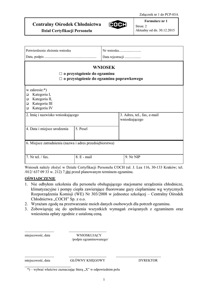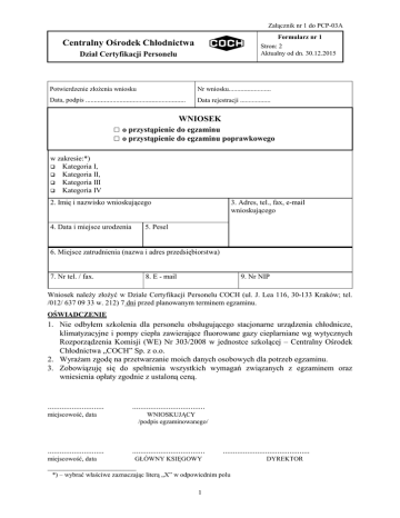 Załącznik nr 1 do PCP-03A Formularz nr 1 Stron: 2 Aktualny od dn. 30.12.2015 Centralny Ośrodek Chłodnictwa Dział Certyfikacji Personelu Potwierdzenie złoŜenia wniosku Nr wniosku......................... Data, podpis ........................................................... Data rejestracji .................. WNIOSEK □ o przystąpienie do egzaminu □ o przystąpienie do egzaminu poprawkowego w zakresie:*) Kategoria I, Kategoria II, Kategoria III Kategoria IV 2. Imię i nazwisko wnioskującego 4. Data i miejsce urodzenia 3. Adres, tel., fax, e-mail wnioskującego 5. Pesel 6. Miejsce zatrudnienia (nazwa i adres przedsiębiorstwa) 7. Nr tel. / fax. 8. E - mail 9. Nr NIP Wniosek naleŜy złoŜyć w Dziale Certyfikacji Personelu COCH (ul. J. Lea 116, 30-133 Kraków; tel. /012/ 637 09 33 w. 212) 7 dni przed planowanym terminem egzaminu. OŚWIADCZENIE 1. Nie odbyłem szkolenia dla personelu obsługującego stacjonarne urządzenia chłodnicze, klimatyzacyjne i pompy ciepła zawierające fluorowane gazy cieplarniane wg wytycznych Rozporządzenia Komisji (WE) Nr 303/2008 w jednostce szkolącej – Centralny Ośrodek Chłodnictwa „COCH” Sp. z o.o. 2. WyraŜam zgodę na przetwarzanie moich danych osobowych dla potrzeb egzaminu. 3. Zobowiązuję się do spełnienia wszystkich wymagań związanych z egzaminem oraz wniesienia opłaty zgodnie z ustaloną ceną. ............................ .................................... miejscowość, data ............................ miejscowość, data WNIOSKUJĄCY /podpis egzaminowanego/ .................................... ........................................... GŁÓWNY KSIĘGOWY ______________________ *) – wybrać właściwe zaznaczając literą „X” w odpowiednim polu 1 DYREKTOR Załącznik nr 1 do PCP-03A Formularz nr 1 Stron: 2 Aktualny od dn. 30.12.2015 Centralny Ośrodek Chłodnictwa Dział Certyfikacji Personelu WYKAZ ZAŁĄCZNIKÓW DO WNIOSKU Rodzaj dokumentu Liczba załączonych dokumentów 1. Zaświadczenie potwierdzające ukończenie po 01.01.2016 szkolenia na określoną kategorię (jeŜeli posiada). 2. Kopię dowodu wniesienia opłaty za egzamin. Kategorie: 1) kategoria I: a) sprawdzanie pod względem wycieków stacjonarnych urządzeń chłodniczych, klimatyzacyjnych i pomp ciepła zawierających 3 kg lub więcej fluorowanych gazów cieplarnianych lub substancji kontrolowanych oraz zawierających 6 kg lub więcej fluorowanych gazów cieplarnianych lub substancji kontrolowanych w odpowiednio oznakowanych hermetycznie zamkniętych systemach oraz b) instalacja, konserwacja lub serwisowanie wszystkich stacjonarnych urządzeń chłodniczych, klimatyzacyjnych i pomp ciepła zawierających fluorowane gazy cieplarniane lub substancje kontrolowane oraz odzysk fluorowanych gazów cieplarnianych lub substancji kontrolowanych ze stacjonarnych i ruchomych urządzeń chłodniczych, klimatyzacyjnych i pomp ciepła 2) kategoria II: a) sprawdzanie pod względem wycieków stacjonarnych urządzeń chłodniczych, klimatyzacyjnych i pomp ciepła zawierających 3 kg lub więcej fluorowanych gazów cieplarnianych lub substancji kontrolowanych oraz zawierających 6 kg lub więcej fluorowanych gazów cieplarnianych lub substancji kontrolowanych w odpowiednio oznakowanych hermetycznie zamkniętych systemach, pod warunkiem, Ŝe nie jest ono związane z otwarciem obiegu chłodniczego oraz b) instalacja, konserwacja lub serwisowanie stacjonarnych urządzeń chłodniczych, klimatyzacyjnych i pomp ciepła zawierających poniŜej 3 kg fluorowanych gazów cieplarnianych lub substancji kontrolowanych lub poniŜej 6 kg fluorowanych gazów cieplarnianych lub substancji kontrolowanych w odpowiednio oznakowanych hermetycznie zamkniętych systemach oraz odzysk fluorowanych gazów cieplarnianych lub substancji kontrolowanych z takich stacjonarnych i ruchomych urządzeń chłodniczych, klimatyzacyjnych i pomp ciepła 3) kategoria III - odzysk fluorowanych gazów cieplarnianych lub substancji kontrolowanych w odniesieniu do stacjonarnych i ruchomych urządzeń chłodniczych, klimatyzacyjnych i pomp ciepła zawierających poniŜej 3 kg fluorowanych gazów cieplarnianych lub substancji kontrolowanych lub poniŜej 6 kg fluorowanych gazów cieplarnianych lub substancji kontrolowanych w odpowiednio oznakowanych hermetycznie zamkniętych systemach 4) kategoria IV - sprawdzanie pod względem wycieków stacjonarnych urządzeń chłodniczych, klimatyzacyjnych i pomp ciepła zawierających 3 kg lub więcej fluorowanych gazów cieplarnianych lub substancji kontrolowanych oraz zawierających 6 kg lub więcej fluorowanych gazów cieplarnianych lub substancji kontrolowanych w odpowiednio oznakowanych hermetycznie zamkniętych systemach, pod warunkiem, Ŝe nie jest ono związane z otwarciem obiegu chłodniczego 2