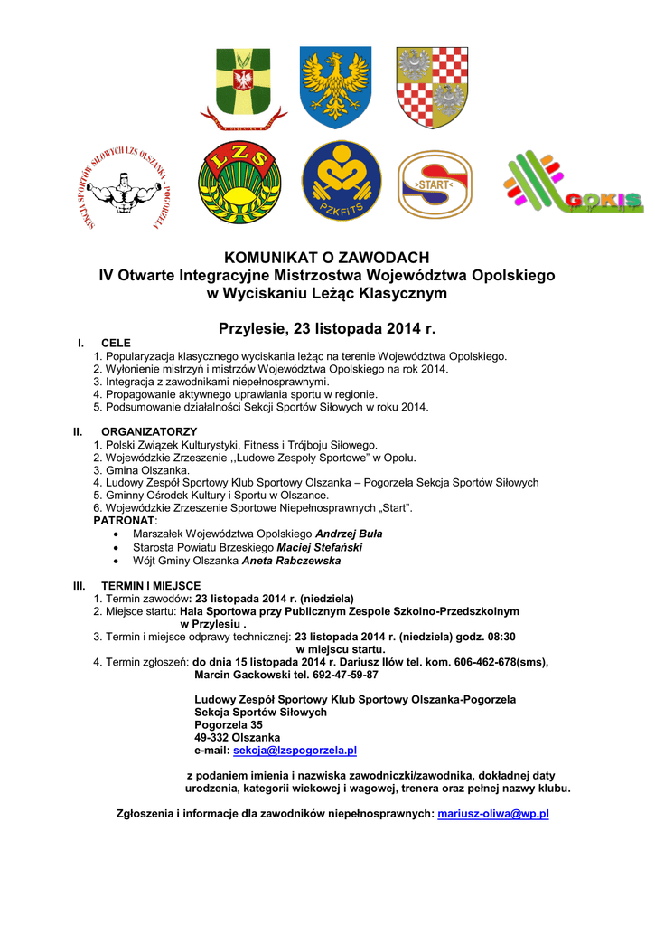 KOMUNIKAT O ZAWODACH IV Otwarte Integracyjne Mistrzostwa Województwa Opolskiego w Wyciskaniu Leżąc Klasycznym Przylesie, 23 listopada 2014 r. I. CELE 1. Popularyzacja klasycznego wyciskania leżąc na terenie Województwa Opolskiego. 2. Wyłonienie mistrzyń i mistrzów Województwa Opolskiego na rok 2014. 3. Integracja z zawodnikami niepełnosprawnymi. 4. Propagowanie aktywnego uprawiania sportu w regionie. 5. Podsumowanie działalności Sekcji Sportów Siłowych w roku 2014. II. ORGANIZATORZY 1. Polski Związek Kulturystyki, Fitness i Trójboju Siłowego. 2. Wojewódzkie Zrzeszenie ,,Ludowe Zespoły Sportowe” w Opolu. 3. Gmina Olszanka. 4. Ludowy Zespół Sportowy Klub Sportowy Olszanka – Pogorzela Sekcja Sportów Siłowych 5. Gminny Ośrodek Kultury i Sportu w Olszance. 6. Wojewódzkie Zrzeszenie Sportowe Niepełnosprawnych „Start”. PATRONAT: Marszałek Województwa Opolskiego Andrzej Buła Starosta Powiatu Brzeskiego Maciej Stefański Wójt Gminy Olszanka Aneta Rabczewska III. TERMIN I MIEJSCE 1. Termin zawodów: 23 listopada 2014 r. (niedziela) 2. Miejsce startu: Hala Sportowa przy Publicznym Zespole Szkolno-Przedszkolnym w Przylesiu . 3. Termin i miejsce odprawy technicznej: 23 listopada 2014 r. (niedziela) godz. 08:30 w miejscu startu. 4. Termin zgłoszeń: do dnia 15 listopada 2014 r. Dariusz Ilów tel. kom. 606-462-678(sms), Marcin Gackowski tel. 692-47-59-87 Ludowy Zespół Sportowy Klub Sportowy Olszanka-Pogorzela Sekcja Sportów Siłowych Pogorzela 35 49-332 Olszanka e-mail: [email protected] z podaniem imienia i nazwiska zawodniczki/zawodnika, dokładnej daty urodzenia, kategorii wiekowej i wagowej, trenera oraz pełnej nazwy klubu. Zgłoszenia i informacje dla zawodników niepełnosprawnych: [email protected] IV. WARUNKI UCZESTNICTWA 1. W zawodach uczestniczyć mogą zawodnicy, reprezentanci klubów sportowych – członków PZKFiTS, po okazaniu podczas weryfikacji, ważnej licencji zawodnika PZKFiTS lub przedłożeniu kompletnego wniosku o wydanie licencji potwierdzonego przez klub. Wniosek o przyznanie licencji zawodnika jest do pobrania na witrynie PZKFiTS pod adresem: http://www.pzkfits.pl/komunikaty_dok.htm 2. Zawodnicy i członkowie Ludowego Zespołu Sportowego Klubu Sportowego Olszanka – Pogorzela Sekcja Sportów Siłowych oraz kandydaci do klubu LZS KS Olszanka – Pogorzela. 3. Zawodnicy niepełnosprawni zrzeszeni w PZSN „Start”. 4. Opłacone wpisowe w przypadku: - startu w pojedynczej klasyfikacji - 40,00zł. - startu w każdej następnej klasyfikacji - 30,00 zł - zawodników niepełnosprawnych – 30,00 zł 5. Okazanie podczas weryfikacji ważnych, indywidualnych badań lekarskich. V. SPOSOBY RYWALIZACJI, KLASYFIKACJE 1. Rywalizacja zostanie przeprowadzona w następujących kategoriach wagowych: a. Kobiety: - juniorki do lat 23 - I gr. do 57 kg - open według formuły Wilks’a; - II gr. powyżej 57 kg - open według formuły Wilks’a; - seniorki - I gr. do 57 kg - open według formuły Wilks’a; - II gr. powyżej 57 kg - open według formuły Wilks’a; b. Mężczyźni - juniorzy do lat 16: I gr. do 74 kg, II grupa powyżej 74 kg – open według formuły Wilks`a, - juniorzy do lat 18: I gr. do 74 kg; II grupa powyżej 74 kg – open według formuły Wilks’a; - juniorzy do lat 23: I gr. do 74 kg; II grupa powyżej 74 kg – open według formuły Wilks’a; - seniorzy w kategoriach wagowych: 59, 66, 74, 83, 93, 105, 120, +120 według uzyskanego wyniku w kilogramach; - weterani I gr. 40 – 49 lat open według formuły Wilks’a; - weterani II gr. 50 – 59 lat open według formuły Wilks’a; - weterani III gr. 60 lat i powyżej open według formuły Wilks’a; - zawodniczki niepełnosprawne: I gr. do 57 kg, II grupa powyżej 57 kg - open według formuły Wilks’a. - zawodnicy niepełnosprawni: I gr. do 74 kg, II grupa powyżej 74 kg - open według formuły Wilks’a. UWAGA : Wszystkie zawodniczki i zawodnicy startują bez koszulek wspomagających. Zawodnicy niepełnosprawni startują na ławie szerokiej dostosowanej zgodnie z przepisami IPC dla zawodników niepełnosprawnych. VI. INFORMACJE 1. Wszelkich informacji dotyczących w/w zawodów udzielają: Dariusz Ilów, tel. kom. 606 462 678, e-mail: [email protected] Marcin Gackowski tel. kom. 692 47 59 87 VII. NAGRODY 1. Trzy pierwsze miejsca w każdej grupie kategorii wagowych kobiet, juniorów do lat 16,18,23, weteranów oraz zawodników niepełnosprawnych zostaną nagrodzone medalami. 2. Trzy pierwsze miejsca w każdej kategorii wagowej seniorów zostaną nagrodzone medalami. 3. Każdy zwycięzca w grupach kategorii wagowych kobiet - juniorek do lat 23 i seniorek, juniorów do lat 16,18 i 23, weteranów, zawodników niepełnosprawnych oraz w kategoriach wagowych seniorów zostanie nagrodzony pucharem lub statuetką. 4. Najlepsza Zawodniczka wśród wszystkich startujących zawodniczek i Najlepszy Zawodnik wśród wszystkich startujących zawodników z największą ilością punktów Wilks’a otrzymają puchary. 5. Wszyscy sklasyfikowani uczestnicy zawodów otrzymają dyplomy potwierdzające uzyskane miejsce a osoby niesklasyfikowane dyplomy uczestnictwa. 6. Ponadto pamiątkowe statuetki otrzymają : Najlepsza Juniorka do lat 16 i 18 , spośród wszystkich startujących zawodniczek z największą ilością punktów Wilks’a (dotyczy również zawodniczek niepełnosprawnych) w danej grupie wiekowej. 7. Organizator przewiduje również nagrody rzeczowe w postaci sprzętu sportowego i odżywek dla sportowców (ilość nagród rzeczowych uzależniona od pozyskanych sponsorów). VIII. ZAKWATEROWANIE I WYŻYWIENIE 1. Możliwość rezerwacji noclegów we własnym zakresie w miejscowościach: Brzeg – odległość ok. 10 km: - Szkolne Schronisko Młodzieżowe przy Zespole Szkół Ekonomicznych w Brzegu http://www.schroniskobrzeg.pl/ telefon 77-416-30-79 - Hotel Villa Romeo http://hotel-romeo.pl/ - Hotel Piast http://www.piast.strefa.pl/index.php/pl - Hotel Arte http://www.hotelarte.pl/ Skarbimi