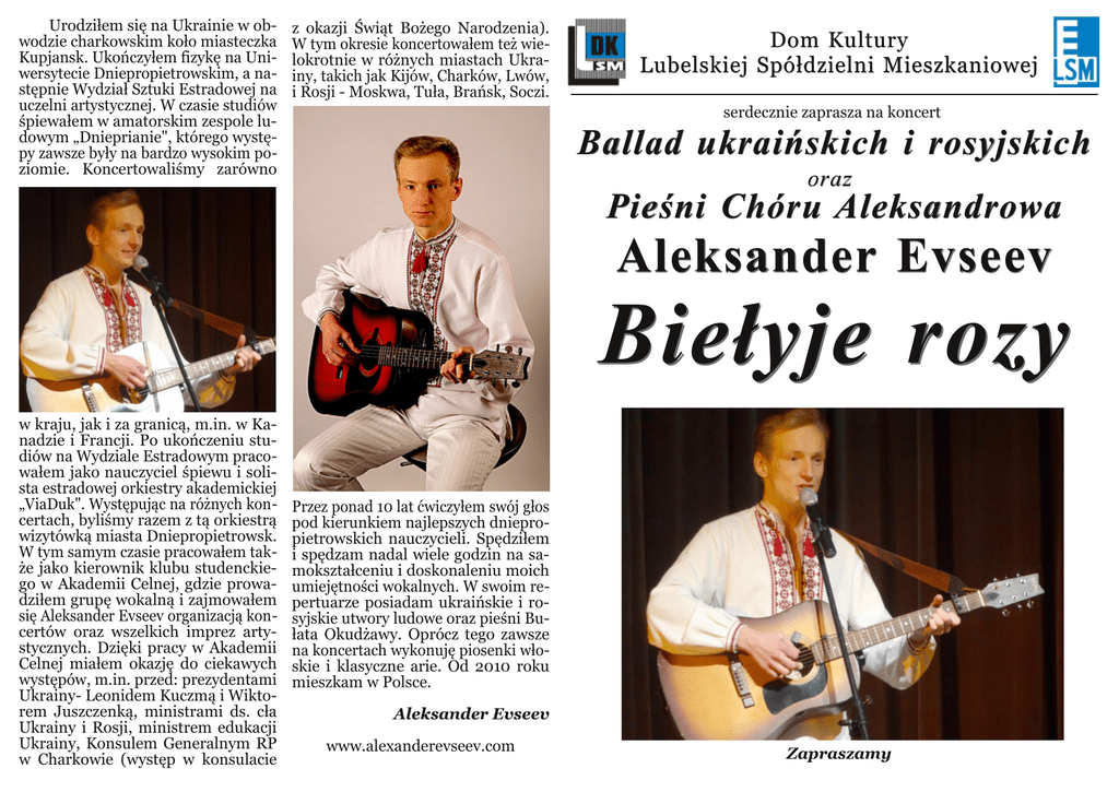 Urodziłem się na Ukrainie w ob wodzie charkowskim koło miasteczka Kupjansk. Ukończyłem fizykę na Uni wersytecie Dniepropietrowskim, a na stępnie Wydział Sztuki Estradowej na uczelni artystycznej. W czasie studiów śpiewałem w amatorskim zespole lu dowym „Dnieprianie", którego wystę py zawsze były na bardzo wysokim po ziomie. Koncertowaliśmy zarówno z okazji Świąt Bożego Narodzenia). W tym okresie koncertowałem też wie lokrotnie w różnych miastach Ukra iny, takich jak Kijów, Charków, Lwów, i Rosji Moskwa, Tuła, Brańsk, Soczi. Dom Kultury Lubelskiej Spółdzielni Mieszkaniowej serdecznie zaprasza na koncert Ballad ukraińskich i rosyjskich oraz Pieśni Chóru Aleksandrowa Aleksander Evseev Biełyje rozy w kraju, jak i za granicą, m.in. w Ka nadzie i Francji. Po ukończeniu stu diów na Wydziale Estradowym praco wałem jako nauczyciel śpiewu i soli sta estradowej orkiestry akademickiej „ViaDuk". Występując na różnych kon certach, byliśmy razem z tą orkiestrą wizytówką miasta Dniepropietrowsk. W tym samym czasie pracowałem tak że jako kierownik klubu studenckie go w Akademii Celnej, gdzie prowa dziłem grupę wokalną i zajmowałem się Aleksander Evseev organizacją kon certów oraz wszelkich imprez arty stycznych. Dzięki pracy w Akademii Celnej miałem okazję do ciekawych występów, m.in. przed: prezydentami Ukrainy Leonidem Kuczmą i Wikto rem Juszczenką, ministrami ds. cła Ukrainy i Rosji, ministrem edukacji Ukrainy, Konsulem Generalnym RP w Charkowie (występ w konsulacie Przez ponad 10 lat ćwiczyłem swój głos pod kierunkiem najlepszych dniepro pietrowskich nauczycieli. Spędziłem i spędzam nadal wiele godzin na sa mokształceniu i doskonaleniu moich umiejętności wokalnych. W swoim re pertuarze posiadam ukraińskie i ro syjskie utwory ludowe oraz pieśni Bu łata Okudżawy. Oprócz tego zawsze na koncertach wykonuję piosenki wło skie i klasyczne arie. Od 2010 roku mieszkam w Polsce. Aleksander Evseev www.alexanderevseev.com Zapraszamy Płyta Aleksandra Evseeva Bal lady ukraińskie i rosyjskie to zestaw powszechnie znanych oraz bardzo lubianych w Polsce ukraińskich i rosyjskich piose nek, których popularność zosta ła sprawdzona czasem. Dzięki potężnemu wokalowi oraz ory ginalnej interpretacji Aleksan der Evseev swoim wykonaniem tych pięknych utworów wywo łuje w słuchaczach pozytywne emocje i nostalgiczne wspo mnienia. Dom Kultury Lubelskiej Spółdzielni Mieszkaniowej Koncert Ballad ukraińskich i rosyjskich oraz Pieśni Chóru Aleksandrowa Aleksander Evseev Biełyje rozy Czerwona ruta słowa i muzyka Wołodymyr Iwasiuk Modlitwa słowa i muzyka Bułat Okudżawa Czornobrywci – słowa M. Syngaiwskij, muzykę M. Wyrmenycz Ciemna dziś noc – słowa W. Agatow, muzykę N. Bogosłowski Bradiaga słowa I. Kondratiew, muzukę ludowa Biełyje rozy słowa i muzyka S. Kuzniecow A ja idę, chodzę po Moskwie – słowa G. Szpalikow , muzyka A. Petrow Ech raz muzyka ludowa Serce słowa E. Chołmatow, muzyka I. Dunajewski Katiusza słowa M. Isakowski, muzyka M. Błanter Smuglanka – słowa J. Swiedow, muzyka A. Nowikow Kalinka muzyka ludowa Jarzębina czerwona – rosyjska piosenka ludowa To były piękne dni – cygański romans Oczy czarne – słowa Grebionka, muzyka F. German Zawsze niech będzie słońce – słowa L. Oszanin, muzyka A. Ostrowski Koncert odbędzie się w piątek 29 listopada 2013 r. o godz. 18.00 w sali widowiskowej Domu Kultury LSM w Lublinie, ul. K. Wallenroda 4a, tel. 81 743 48 29 www.domkulturylsm.pl B i le t 1 0 z ł