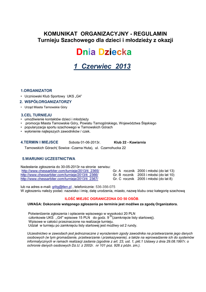KOMUNIKAT ORGANIZACYJNY - REGULAMIN Turnieju Szachowego dla dzieci i młodzieży z okazji Dnia Dziecka 1 Czerwiec 2013 1.ORGANIZATOR • Uczniowski Klub Sportowy UKS „G4” 2. WSPÓŁORGANIZATORZY • Urząd Miasta Tarnowskie Góry 3.CEL TURNIEJU • umożliwienie kontaktów dzieci i młodzieży • promocja Miasta Tarnowskie Góry, Powiatu Tarnogórskiego, Województwa Śląskiego • popularyzacja sportu szachowego w Tarnowskich Górach • wyłonienie najlepszych zawodników / czek. 4.TERMIN I MIEJSCE Sobota 01-06-2013r. Klub 22 - Kawiarnia Tarnowskich Górach( Sowice -Czarna Huta), ul. Czarnohucka 22 5.WARUNKI UCZESTNICTWA Nadesłanie zgłoszenia do 30-05-2013r na stronie serwisu: http://www.chessarbiter.com/turnieje/2013/ti_2365/ Gr. A rocznik 2000 i młodsi (do lat 13) http://www.chessarbiter.com/turnieje/2013/ti_2366/ Gr. B rocznik 2003 i młodsi (do lat 10) http://www.chessarbiter.com/turnieje/2013/ti_2367/ Gr. C rocznik 2005 i młodsi (do lat 8) lub na adres e-mail: [email protected] , telefonicznie: 536-356-075 W zgłoszeniu należy podać: nazwisko i imię, datę urodzenia, miasto, nazwę klubu oraz kategorię szachową ILOŚĆ MIEJSC OGRANICZONA DO 50 OSÓB. UWAGA: Dokonanie wstępnego zgłoszenia po terminie jest możliwe za zgodą Organizatora. Potwierdzenie zgłoszenia i opłacenie wpisowego w wysokości 20 PLN .30 członkowie UKS ,,G4'' wpisowe 15 PLN do godz. 9 (zamknięcie listy startowej). Wpisowe w całości przeznaczone na realizacje turnieju. Udział w turnieju po zamknięciu listy startowej jest możliwy od 2 rundy. Uczestnictwo w zawodach jest jednoznaczne z wyrażeniem zgody zawodnika na przetwarzanie jego danych osobowych (w tym gromadzenie, przetwarzanie i przekazywanie), a także na wprowadzenie ich do systemów informatycznych w ramach realizacji zadania (zgodnie z art. 23, ust. 1, pkt.1 Ustawy z dnia 29.08.1997r. o ochronie danych osobowych Dz.U. z 2002r. nr 101 poz. 926 z późn. zm.). 6. SYSTEM ROZGRYWEK I TEMPO GRY Turniej indywidualny - system szwajcarski – 7 rund Tempo gry - 15 minut na partię Rozgrywki przeprowadzone zostaną systemem szwajcarskim na dystansie 7 rund w ciągu 1 dnia w 3 grupach wiekowych: Grupa A (dziewczęta i chłopcy) -rocznik 2000 i młodsi (do lat 13) Grupa B (dziewczęta i chłopcy) - rocznik 2003 i młodsi (do lat 10) (dziewczęta i chłopcy) – rocznik 2005 i młodsi (do lat 8) 7. Grupa C Program zawodów: przyjmowanie zgłoszeń godz. 9.00 – 9.30 odprawa techniczna godz. 9.40 otwarcie turnieju godz. 9.50 rundy I-VII godz. 10.00 ÷13.30 możliwa 15 min. przerwa po IV-tej rundzie zakończenie zawodów, wręczenie nagród około godz. W razie małej ilości zgłoszeń dopuszcza się rozegranie turnieju systemem kołowym. W przypadku niskiej frekwencji w grupie możliwe jest połączenie grup wiekowych lub rozegranie 14.00 systemem kołowym 8. NAGRODY 9. miejsca I w grupie wiekowej: puchar, medal, dyplom, nagroda rzeczowa miejsca II - III w grupie wiekowej: medal, dyplom, nagroda rzeczowa dla najmłodszego / szej uczestnika / czki : nagroda rzeczowa wszyscy uczestnicy otrzymają dyplom uczestnictwa SĘDZIOWANIE 9.1 Zawody prowadzi sędzia główny i sędziowie rundowi . 9.2 Od decyzji sędziego rundowego przysługuje zawodnikowi / czce prawo odwołania się do Sędziego Głównego w terminie przed kolejną rundą. 9.3 Decyzje sędziego głównego w czasie zawodów są ostateczne. 10. SPRAWY WYCHOWAWCZ 10.1 Opiekę wychowawczą podczas zawodów sprawują opiekunowie, rodzice 10.2 W trakcie partii zawodnicy nie mogą kontaktować się z trenerami, opiekunami, rodzicami. 10.3 W przypadku naruszenia dyscypliny, Organizator , Sędzia Główny może ukarać zawodnika orzekając jego przegraną i wykluczyć zawodnika z turnieju. 11. POSTANOWIENIA KOŃCOWE * W turnieju obowiązują przepisy Kodeksu Szachowego PZSzach. * Kojarzenie komputerowe. * Za zdolność zawodników do startu w zawodach oraz ich ubezpieczenie odpowiedzialny jest klub delegujący i rodzice. * Organizatorzy zastrzegają sobie prawo ostatecznej interpretacji i zmian powyższych ustaleń niniejszego komunikatu. Zapraszamy wszystkich miłośników gry szachowej !!! ORGANIZATOR UKS G4 Tarnowskie Góry