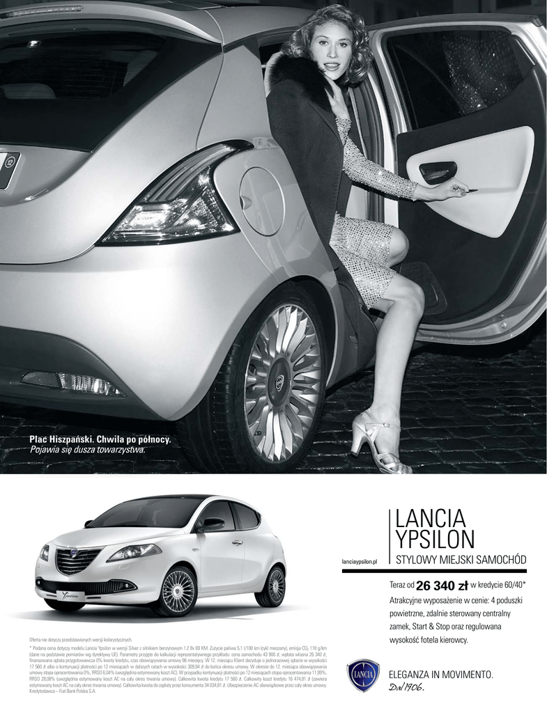 Plac Hiszpański. Chwila po północy. Pojawia się dusza towarzystwa. LANCIA YPSILON lanciaypsilon.pl STYLOWY MIEJSKI SAMOCHÓD Teraz od 26 340 zł w kredycie 60/40* Oferta nie dotyczy przedstawionych wersji kolorystycznych. Atrakcyjne wyposażenie w cenie: 4 poduszki powietrzne, zdalnie sterowany centralny zamek, Start & Stop oraz regulowana wysokość fotela kierowcy. * Podana cena dotyczy modelu Lancia Ypsilon w wersji Silver z silnikiem benzynowym 1.2 8v 69 KM. Zużycie paliwa 5,1 l/100 km (cykl mieszany), emisja CO2 118 g/km (dane na podstawie pomiarów wg dyrektywy UE). Parametry przyjęte do kalkulacji reprezentatywnego przykładu: cena samochodu 43 900 zł, wpłata własna 26 340 zł, finansowana opłata przygotowawcza 0% kwoty kredytu, czas obowiązywania umowy 96 miesięcy. W 12. miesiącu Klient decyduje o jednorazowej spłacie w wysokości 17 560 zł albo o kontynuacji płatności po 12 miesiącach w dalszych ratach w wysokości 309,94 zł do końca okresu umowy. W okresie do 12. miesiąca obowiązywania umowy stopa oprocentowania 0%, RRSO 6,04% (uwzględnia estymowany koszt AC). W przypadku kontynuacji płatności po 12 miesiącach stopa oprocentowania 11,99%, RRSO 28,08% (uwzględnia estymowany koszt AC na cały okres trwania umowy). Całkowita kwota kredytu 17 560 zł. Całkowity koszt kredytu 16 474,81 zł (zawiera estymowany koszt AC na cały okres trwania umowy). Całkowita kwota do zapłaty przez konsumenta 34 034,81 zł. Ubezpieczenie AC obowiązkowe przez cały okres umowy. Kredytodawca – Fiat Bank Polska S.A. ELEGANZA IN MOVIMENTO. Dal 1906. Plac Hiszpański. Chwila po północy. Pojawia się dusza towarzystwa. LANCIA YPSILON lanciaypsilon.pl STYLOWY MIEJSKI SAMOCHÓD Teraz już od 383 zł miesięcznie* Atrakcyjne wyposażenie w cenie: 4 poduszki powietrzne, zdalnie sterowany centralny zamek, Start & Stop oraz regulowana wysokość fotela kierowcy. Oferta nie dotyczy przedstawionych wersji kolorystycznych. * Podana cena dotyczy modelu Lancia Ypsilon w wersji Silver z silnikiem benzynowym 1.2 8v 69 KM. Zużycie paliwa 5,1 l/100 km (cykl mieszany), emisja CO2 118 g/km (dane na podstawie pomiarów wg dyrektywy UE). Parametry przyjęte do kalkulacji reprezentatywnego przykładu: cena samochodu 43 900 zł, wpłata własna 17 999 zł, finansowana opłata przygotowawcza 4% kwoty kredytu, czas obowiązywania umowy 96 miesięcy, miesięczne raty równe w wysokości 383 zł, stała stopa oprocentowania 8,15%, RRSO 16,47% (uwzględnia estymowane koszty polisy AC przez cały okres kredytu), całkowita kwota kredytu 26 937,04 zł, całkowity koszt kredytu 15 656,01 zł, całkowita kwota do zapłaty przez konsumenta 42 593,05 zł. ELEGANZA IN MOVIMENTO. Dal 1906.
