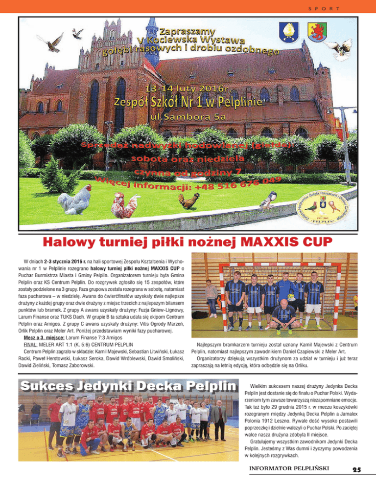S P O R T Halowy turniej piłki nożnej MAXXIS CUP W dniach 2-3 stycznia 2016 r. na hali sportowej Zespołu Kształcenia i Wychowania nr 1 w Pelplinie rozegrano halowy turniej piłki nożnej MAXXIS CUP o Puchar Burmistrza Miasta i Gminy Pelplin. Organizatorem turnieju była Gmina Pelplin oraz KS Centrum Pelplin. Do rozgrywek zgłosiło się 15 zespołów, które zostały podzielone na 3 grupy. Faza grupowa została rozegrana w sobotę, natomiast faza pucharowa – w niedzielę. Awans do ćwierćfinałów uzyskały dwie najlepsze drużyny z każdej grupy oraz dwie drużyny z miejsc trzecich z najlepszym bilansem punktów lub bramek. Z grupy A awans uzyskały drużyny: Fuzja Gniew-Lignowy, Larum Finanse oraz TUKS Dach. W grupie B ta sztuka udała się ekipom Centrum Pelplin oraz Amigos. Z grupy C awans uzyskały drużyny: Vitis Ogrody Marzeń, Orlik Pelplin oraz Meler Art. Poniżej przedstawiam wyniki fazy pucharowej. Mecz o 3. miejsce: Larum Finanse 7:3 Amigos FINAŁ: MELER ART 1:1 (K. 5:6) CENTRUM PELPLIN Centrum Pelplin zagrało w składzie: Kamil Majewski, Sebastian Litwiński, Łukasz Racki, Paweł Herstowski, Łukasz Seroka, Dawid Wróblewski, Dawid Smoliński, Dawid Zieliński, Tomasz Zaborowski. Najlepszym bramkarzem turnieju został uznany Kamil Majewski z Centrum Pelplin, natomiast najlepszym zawodnikiem Daniel Czapiewski z Meler Art. Organizatorzy dziękują wszystkim drużynom za udział w turnieju i już teraz zapraszają na letnią edycję, która odbędzie się na Orliku. Sukces Jedynki Decka Pelplin Wielkim sukcesem naszej drużyny Jedynka Decka Pelplin jest dostanie się do finału o Puchar Polski. Wydarzeniom tym zawsze towarzyszą niezapomniane emocje. Tak też było 29 grudnia 2015 r. w meczu koszykówki rozegranym między Jedynką Decka Pelplin a Jamalex Polonia 1912 Leszno. Rywale dość wysoko postawili poprzeczkę i dzielnie walczyli o Puchar Polski. Po zaciętej walce nasza drużyna zdobyła II miejsce. Gratulujemy wszystkim zawodnikom Jedynki Decka Pelplin. Jesteśmy z Was dumni i życzymy powodzenia w kolejnych rozgrywkach. INFORMATOR PELPLIŃSKI 25