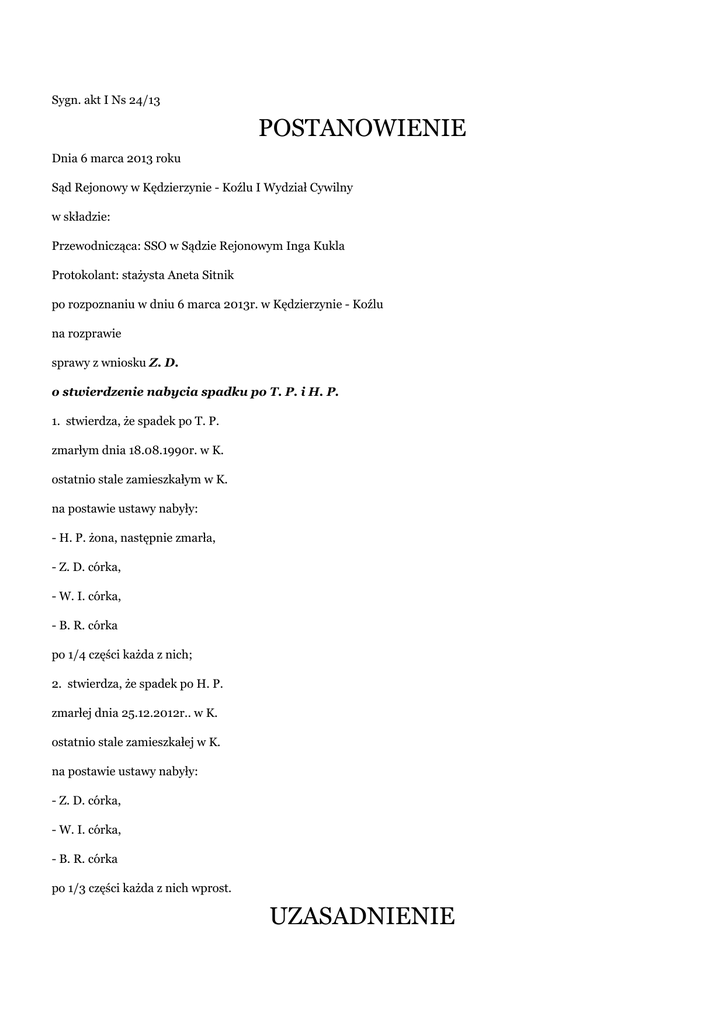 Sygn. akt I Ns 24/13 POSTANOWIENIE Dnia 6 marca 2013 roku Sąd Rejonowy w Kędzierzynie - Koźlu I Wydział Cywilny w składzie: Przewodnicząca: SSO w Sądzie Rejonowym Inga Kukla Protokolant: stażysta Aneta Sitnik po rozpoznaniu w dniu 6 marca 2013r. w Kędzierzynie - Koźlu na rozprawie sprawy z wniosku Z. D. o stwierdzenie nabycia spadku po T. P. i H. P. 1. stwierdza, że spadek po T. P. zmarłym dnia 18.08.1990r. w K. ostatnio stale zamieszkałym w K. na postawie ustawy nabyły: - H. P. żona, następnie zmarła, - Z. D. córka, - W. I. córka, - B. R. córka po 1/4 części każda z nich; 2. stwierdza, że spadek po H. P. zmarłej dnia 25.12.2012r.. w K. ostatnio stale zamieszkałej w K. na postawie ustawy nabyły: - Z. D. córka, - W. I. córka, - B. R. córka po 1/3 części każda z nich wprost. UZASADNIENIE Z. D. wniosła o stwierdzenie, iż spadek po T. P. oraz H. P. z mocy ustawy nabyli: córka Z. D., W. I. i B. R. po 1/3 części każda. W uzasadnieniu powyższego Z. D. podniosła, iż T. P., ostatnio zamieszkały w K., zmarł dnia 18.08.1990r., zaś H. P., ostatnio zamieszkała w K., zmarła dnia 25.12.2012r. Inicjująca postępowanie wskazała nadto, iż ww. nie pozostawili testamentów, zaś w skład spadku nie wchodzi gospodarstwo rolne. Sąd ustalił następujący stan faktyczny: W małżeństwie T. P. i H. P. urodziło się pięcioro dzieci, w tym dwoje zmarło w okresie następującym bezpośrednio po porodzie. T. P., ostatnio stale zamieszkały w K., zmarł dnia 18.08.1990r., pozostawiając żonę H. P. i trzy córki: Z. D., B. R. i W. I.. H. P., ostatnio stale zamieszkała w K., zmarła dnia 25.12.2012r. T. P. i H. P. nie pozostawili testamentów. W skład spadku po ww. nie wchodzi gospodarstwo rolne. Na rozprawie w dniu 06.03.2013r. Z. D., działając także w imieniu B. R. jako jej pełnomocnik oraz W. I. złożyły oświadczenie o przyjęciu wprost spadku po H. P.. (dowody: skrócony odpis aktu zgonu H. P. – k3, skrócony odpis aktu zgonu T. P. – k4, skrócony odpis aktu małżeństwa Z. D. – k5, skrócony odpis aktu małżeństwa W. I. – k6, kserokopia skróconego odpisu aktu małżeństwa B. R. wraz z tłumaczeniem – k7-8, zapewnienie spadkowe złożone przez Z. D. – k14-15, oświadczenie o przyjęciu spadku wprost złożone przez Z. D. – k15, oświadczenie o przyjęciu spadku wprost złożone przez W. I. – k15) Sąd zważył, co następuje: Wniosek należało uwzględnić. Zgodnie z treścią art. 926 § 1 k.c. powołanie do spadku wynika z ustawy albo z testamentu. W myśl więc prawa spadkowego o tym, kto dziedziczy majątek spadkowy decyduje w pierwszej kolejności sporządzony przez spadkodawcę testament, a w przypadku jego braku — ustawa. T. P. i H. P. nie dokonali rozrządzenia swoim majątkiem drogą testamentu, w związku z czym, podstawą ustalenia grona spadkobierców, jak i przypadających im części w masie spadkowej są przepisy Tytułu II, Księgi IV Kodeksu cywilnego. W myśl art. 924 k.c., spadek otwiera się z chwilą śmierci spadkodawcy, zaś wedle treści art. 925 k.c., spadkobierca nabywa spadek z chwilą otwarcia spadku. Powyższe oznacza, iż z mocy samego prawa (ex lege) spadkobierca wstępuje w ogół praw i obowiązków zmarłego. Od chwili nabycia spadku może zaś objąć spadek we władanie, zarządzać nim i pobierać z niego pożytki. Jego prawo podlega ochronie, może więc żądać wydania spadku lub poszczególnych przedmiotów wchodzących w skład spadku od osoby, która włada spadkiem, ale spadkobiercą nie jest (art. 1029 k.c.). Wedle treści art. 931 § 1 k.c., w pierwszej kolejności powołane są z ustawy do spadku dzieci spadkodawcy oraz jego małżonek. Dziedziczą oni w częściach równych, jednakże część przypadająca małżonkowi nie może być mniejsza niż jedna czwarta całości spadku. Zgodnie zaś z treścią art. 927 § 1 k.c., nie może być spadkobiercą osoba fizyczna, która nie żyje w chwili otwarcia spadku, ani osoba prawna, która w tym czasie nie istnieje. Wedle zaś art. 671 § 1k.p.c., za dowód, że nie ma innych spadkobierców, może być przyjęte zapewnienie złożone przez zgłaszającego się spadkobiercę. Składając zapewnienie spadkowe na rozprawie w dniu 06.03.2013r. Z. D. oświadczyła, iż w małżeństwie T. P. i H. P. urodziło się pięcioro dzieci, z których dwoje zmarło w okresie następującym bezpośrednio po porodzie, dalsze troje zaś to stawająca wnioskodawczyni i dwie uczestniczki postępowania. Mając to na uwadze, uznać należało, iż ww. zstępni spadkodawców (dzieci zmarłe przed T. P. i H. P.) nie wchodzą w krąg spadkobierców po zmarłych rodzicach. Wedle regulacji wynikającej z art. 640 § 1 k.p.c., oświadczenie o prostym przyjęciu spadku lub z dobrodziejstwem inwentarza albo o odrzuceniu spadku może być złożone przed notariuszem lub w sądzie rejonowym, w którego okręgu znajduje się miejsce zamieszkania lub pobytu składającego oświadczenie. Notariusz lub sąd prześle niezwłocznie oświadczenie, wraz z załącznikami, do sądu spadku. Oświadczenia, o których mowa w paragrafie pierwszym, mogą być również składane w sądzie spadku w toku postępowania o stwierdzenie praw do spadku (§2). Oświadczenie o przyjęciu lub odrzuceniu spadku może być złożone w ciągu sześciu miesięcy od dnia, w którym spadkobierca dowiedział się o tytule swego powołania (art. 1015 § 1 k.c.). Na rozprawie w dniu 06.03.2013r. Z. D., występująca w niniejszym postępowaniu także w imieniu uczestniczki postępowania B. R. jako jej pełnomocnik oraz W. I. złożyły oświadczenie o przyjęciu wprost spadku po zmarłej H. P.. Przyjęcie spadku wprost (przyjęcie proste) – oznacza, że spadkobierca przyjmuje spadek bez żadnych ograniczeń- w szczególności bez ograniczenia odpowiedzialności za długi spadkowe. Opierając się zatem na treści art. 931 § 1 k.c., sąd uznał, iż spadek po T. P. na podstawie ustawy nabyły: ż