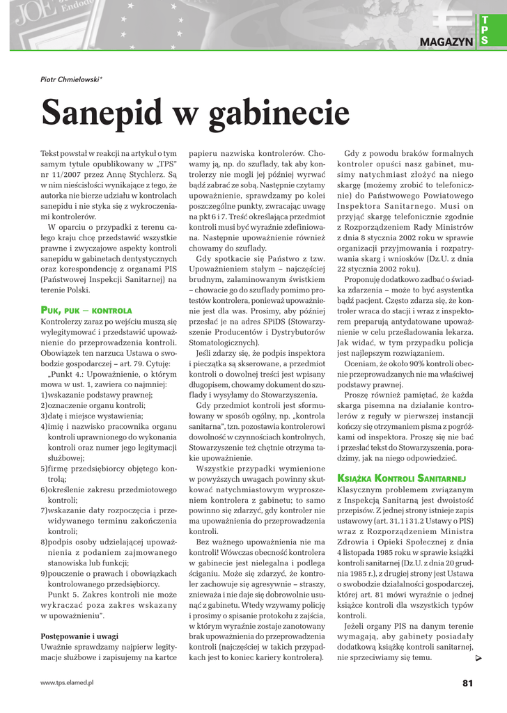 T P MAGAZYN S Piotr Chmielowski* Sanepid w gabinecie Tekst powstał w reakcji na artykuł o tym samym tytule opublikowany w „TPS” nr 11/2007 przez Annę Stychlerz. Są w nim nieścisłości wynikające z tego, że autorka nie bierze udziału w kontrolach sanepidu i nie styka się z wykroczeniami kontrolerów. W oparciu o przypadki z terenu całego kraju chcę przedstawić wszystkie prawne i zwyczajowe aspekty kontroli sanepidu w gabinetach dentystycznych oraz korespondencję z organami PIS (Państwowej Inspekcji Sanitarnej) na terenie Polski. PUK, PUK – KONTROLA Kontrolerzy zaraz po wejściu muszą się wylegitymować i przedstawić upoważnienie do przeprowadzenia kontroli. Obowiązek ten narzuca Ustawa o swobodzie gospodarczej – art. 79. Cytuję: „Punkt 4.: Upoważnienie, o którym mowa w ust. 1, zawiera co najmniej: 1) wskazanie podstawy prawnej; 2) oznaczenie organu kontroli; 3) datę i miejsce wystawienia; 4) imię i nazwisko pracownika organu kontroli uprawnionego do wykonania kontroli oraz numer jego legitymacji służbowej; 5) firmę przedsiębiorcy objętego kontrolą; 6) określenie zakresu przedmiotowego kontroli; 7) wskazanie daty rozpoczęcia i przewidywanego terminu zakończenia kontroli; 8) podpis osoby udzielającej upoważnienia z podaniem zajmowanego stanowiska lub funkcji; 9) pouczenie o prawach i obowiązkach kontrolowanego przedsiębiorcy. Punkt 5. Zakres kontroli nie może wykraczać poza zakres wskazany w upoważnieniu”. Postępowanie i uwagi Uważnie sprawdzamy najpierw legitymacje służbowe i zapisujemy na kartce www.tps.elamed.pl papieru nazwiska kontrolerów. Chowamy ją, np. do szuflady, tak aby kontrolerzy nie mogli jej później wyrwać bądź zabrać ze sobą. Następnie czytamy upoważnienie, sprawdzamy po kolei poszczególne punkty, zwracając uwagę na pkt 6 i 7. Treść określająca przedmiot kontroli musi być wyraźnie zdefiniowana. Następnie upoważnienie również chowamy do szuflady. Gdy spotkacie się Państwo z tzw. Upoważnieniem stałym – najczęściej brudnym, zalaminowanym świstkiem – chowacie go do szuflady pomimo protestów kontrolera, ponieważ upoważnienie jest dla was. Prosimy, aby później przesłać je na adres SPiDS (Stowarzyszenie Producentów i Dystrybutorów Stomatologicznych). Jeśli zdarzy się, że podpis inspektora i pieczątka są skserowane, a przedmiot kontroli o dowolnej treści jest wpisany długopisem, chowamy dokument do szuflady i wysyłamy do Stowarzyszenia. Gdy przedmiot kontroli jest sformułowany w sposób ogólny, np. „kontrola sanitarna”, tzn. pozostawia kontrolerowi dowolność w czynnościach kontrolnych, Stowarzyszenie też chętnie otrzyma takie upoważnienie. Wszystkie przypadki wymienione w powyższych uwagach powinny skutkować natychmiastowym wyproszeniem kontrolera z gabinetu; to samo powinno się zdarzyć, gdy kontroler nie ma upoważnienia do przeprowadzenia kontroli. Bez ważnego upoważnienia nie ma kontroli! Wówczas obecność kontrolera w gabinecie jest nielegalna i podlega ściganiu. Może się zdarzyć, że kontroler zachowuje się agresywnie – straszy, znieważa i nie daje się dobrowolnie usunąć z gabinetu. Wtedy wzywamy policję i prosimy o spisanie protokołu z zajścia, w którym wyraźnie zostaje zanotowany brak upoważnienia do przeprowadzenia kontroli (najczęściej w takich przypadkach jest to koniec kariery kontrolera). Gdy z powodu braków formalnych kontroler opuści nasz gabinet, musimy natychmiast złożyć na niego skargę (możemy zrobić to telefonicznie) do Państwowego Powiatowego Inspektora Sanitarnego. Musi on przyjąć skargę telefonicznie zgodnie z Rozporządzeniem Rady Ministrów z dnia 8 stycznia 2002 roku w sprawie organizacji przyjmowania i rozpatrywania skarg i wniosków (Dz.U. z dnia 22 stycznia 2002 roku). Proponuję dodatkowo zadbać o świadka zdarzenia – może to być asystentka bądź pacjent. Często zdarza się, że kontroler wraca do stacji i wraz z inspektorem preparują antydatowane upoważnienie w celu prześladowania lekarza. Jak widać, w tym przypadku policja jest najlepszym rozwiązaniem. Oceniam, że około 90% kontroli obecnie przeprowadzanych nie ma właściwej podstawy prawnej. Proszę również pamiętać, że każda skarga pisemna na działanie kontrolerów z reguły w pierwszej instancji kończy się otrzymaniem pisma z pogróżkami od inspektora. Proszę się nie bać i przesłać tekst do Stowarzyszenia, poradzimy, jak na niego odpowiedzieć. KSIĄŻKA KONTROLI SANITARNEJ Klasycznym problemem związanym z Inspekcją Sanitarną jest dwoistość przepisów. Z jednej strony istnieje zapis ustawowy (art. 31.1 i 31.2 Ustawy o PIS) wraz z Rozporządzeniem Ministra Zdrowia i Opieki Społecznej z dnia 4 listopada 1985 roku w sprawie książki kontroli sanitarnej (Dz.U. z dnia 20 grudnia 1985 r.), z drugiej strony jest Ustawa o swobodzie działalności gospodarczej, której art. 81 mówi wyraźnie o jednej książce kontroli dla wszystkich typów kontroli. Jeżeli organy PIS na danym terenie wymagają, aby gabinety posiadały dodatkową książkę kontroli sanitarnej, nie sprzeciwiamy się temu. 81 T P S MAGAZYN ZAKRES KONTROLI PIS Według art. 25 Ustawy o Państwowej Inspekcji Sanitarnej w związku z wykonywaną kontrolą inspektor ma prawo: 1) wstępu o każdej porze dnia i nocy, na terenie miast i wsi do: a) zakładów pracy oraz wszystkich pomieszczeń i urządzeń wchodzących w ich skład, b) obiektów użyteczności publicznej, obiektów handlowych, ogrodów działkowych i nieruchomości oraz wszystkich pomieszczeń wchodzących w ich skład, c) środków transportu i obiektów z nimi związanych, w tym również na statki morskie, żeglugi śródlądowej i powietrzne, d)obiektów będących w trakcie budowy, 2) żądania pisemnych lub ustnych informacji oraz wzywania i przesłuchiwania osób, 3) żądania okazania dokumentów i udostępniania wszelkich danych, 4) pobierania próbek do badań laboratoryjnych. Jak 