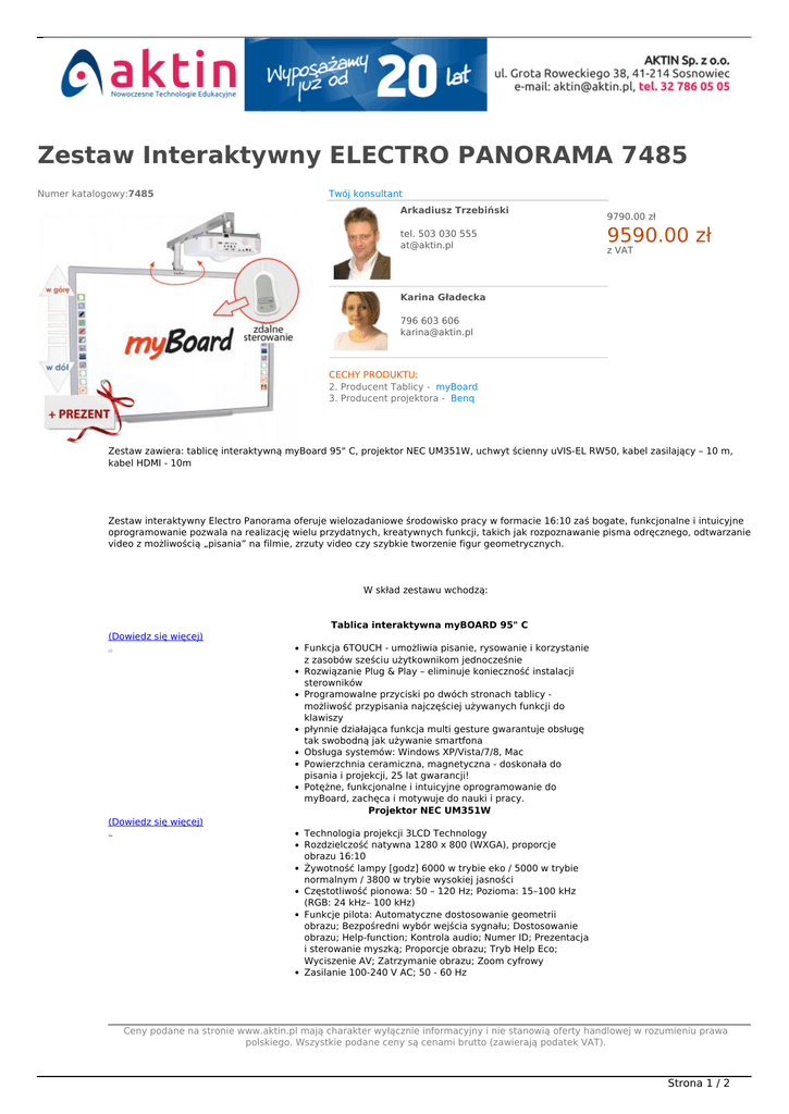 Zestaw Interaktywny ELECTRO PANORAMA 7485 Numer katalogowy:7485 Twój konsultant Arkadiusz Trzebiński tel. 503 030 555 [email protected] NOWOŚĆ W OFERCIE 9790.00 zł 9590.00 zł z VAT Karina Gładecka 796 603 606 [email protected] CECHY PRODUKTU: 2. Producent Tablicy - myBoard 3. Producent projektora - Benq Zestaw zawiera: tablicę interaktywną myBoard 95" C, projektor NEC UM351W, uchwyt ścienny uVIS-EL RW50, kabel zasilający – 10 m, kabel HDMI - 10m Zestaw interaktywny Electro Panorama oferuje wielozadaniowe środowisko pracy w formacie 16:10 zaś bogate, funkcjonalne i intuicyjne oprogramowanie pozwala na realizację wielu przydatnych, kreatywnych funkcji, takich jak rozpoznawanie pisma odręcznego, odtwarzanie video z możliwością „pisania” na filmie, zrzuty video czy szybkie tworzenie figur geometrycznych. W skład zestawu wchodzą: Tablica interaktywna myBOARD 95" C (Dowiedz się więcej) Funkcja 6TOUCH - umożliwia pisanie, rysowanie i korzystanie z zasobów sześciu użytkownikom jednocześnie Rozwiązanie Plug & Play – eliminuje konieczność instalacji sterowników Programowalne przyciski po dwóch stronach tablicy możliwość przypisania najczęściej używanych funkcji do klawiszy płynnie działająca funkcja multi gesture gwarantuje obsługę tak swobodną jak używanie smartfona Obsługa systemów: Windows XP/Vista/7/8, Mac Powierzchnia ceramiczna, magnetyczna - doskonała do pisania i projekcji, 25 lat gwarancji! Potężne, funkcjonalne i intuicyjne oprogramowanie do myBoard, zachęca i motywuje do nauki i pracy. Projektor NEC UM351W (Dowiedz się więcej) Technologia projekcji 3LCD Technology Rozdzielczość natywna 1280 x 800 (WXGA), proporcje obrazu 16:10 Żywotność lampy [godz] 6000 w trybie eko / 5000 w trybie normalnym / 3800 w trybie wysokiej jasności Częstotliwość pionowa: 50 – 120 Hz; Pozioma: 15–100 kHz (RGB: 24 kHz– 100 kHz) Funkcje pilota: Automatyczne dostosowanie geometrii obrazu; Bezpośredni wybór wejścia sygnału; Dostosowanie obrazu; Help-function; Kontrola audio; Numer ID; Prezentacja i sterowanie myszką; Proporcje obrazu; Tryb Help Eco; Wyciszenie AV; Zatrzymanie obrazu; Zoom cyfrowy Zasilanie 100-240 V AC; 50 - 60 Hz Ceny podane na stronie www.aktin.pl mają charakter wyłącznie informacyjny i nie stanowią oferty handlowej w rozumieniu prawa polskiego. Wszystkie podane ceny są cenami brutto (zawierają podatek VAT). Strona 1 / 2 Mimo dołożenia wszelkich starań nie gwarantujemy, że publikowane dane techniczne nie zawierają braków lub błędów. Rzeczywisty wygląd urządzeń może odbiegać od tych przedstawionych na zdjęciach. Ponieważ ewentualne błędne opisy nie mogą jednak być podstawą do roszczeń w przypadku wątpliwości prosimy o kontakt z handlowcem przed podjęciem decyzji o zakupie. Strona 2 / 2 Powered by TCPDF (www.tcpdf.org)