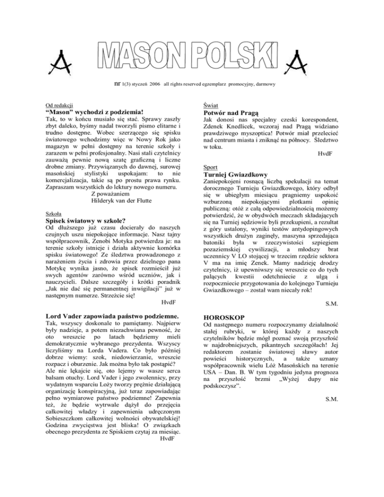 nr 1(3) styczeń 2006 all rights reserved egzemplarz promocyjny, darmowy Od redakcji Świat “Mason” wychodzi z podziemia! Potwór nad Pragą Tak, to w końcu musiało się stać. Sprawy zaszły zbyt daleko, byśmy nadal tworzyli pismo elitarne i trudno dostępne. Wobec szerzącego się spisku światowego wchodzimy więc w Nowy Rok jako magazyn w pełni dostępny na terenie szkoły i zarazem w pełni profesjonalny. Nasi stali czytelnicy zauważą pewnie nową szatę graficzną i liczne drobne zmiany. Przywiązanych do dawnej, surowej masońskiej stylistyki uspokajam: to nie komercjalizacja, takie są po prostu prawa rynku. Zapraszam wszystkich do lektury nowego numeru. Z poważaniem Hilderyk van der Flutte Jak donosi nas specjalny czeski korespondent, Zdenek Knedlicek, wczoraj nad Pragą widziano prawdziwego myszoptica! Potwór miał przelecieć nad centrum miasta i zniknąć na północy. Śledztwo w toku. HvdF Szkoła Spisek światowy w szkole? Od dłuższego już czasu docierały do naszych czujnych uszu niepokojące informacje. Nasz tajny współpracownik, Zenobi Motyka potwierdza je: na terenie szkoły istnieje i działa aktywnie komórka spisku światowego! Ze śledztwa prowadzonego z narażeniem życia i zdrowia przez dzielnego pana Motykę wynika jasno, że spisek rozmieścił już swych agentów zarówno wśród uczniów, jak i nauczycieli. Dalsze szczegóły i krótki poradnik „Jak nie dać się permanentnej inwigilacji” już w następnym numerze. Strzeżcie się! HvdF Lord Vader zapowiada państwo podziemne. Tak, wszyscy doskonale to pamiętamy. Najpierw były nadzieje, a potem niezachwiana pewność, że oto wreszcie po latach będziemy mieli demokratycznie wybranego prezydenta. Wszyscy liczyliśmy na Lorda Vadera. Co było później dobrze wiemy: szok, niedowierzanie, wreszcie rozpacz i oburzenie. Jak można było tak postąpić? Ale nie lękajcie się, oto lejemy w wasze serca balsam otuchy. Lord Vader i jego zwolennicy, przy wydatnym wsparciu Loży tworzy prężnie działającą organizację konspiracyjną, już teraz zapowiadając pełno wymiarowe państwo podziemne! Zapewnia też, że będzie wytrwale dążył do przejęcia całkowitej władzy i zapewnienia udręczonym Sobieszczkom całkowitej wolności obywatelskiej! Godzina zwycięstwa jest bliska! O związkach obecnego prezydenta ze Spiskiem czytaj za miesiąc. HvdF Sport Turniej Gwiazdkowy Zaniepokojeni rosnącą liczbą spekulacji na temat dorocznego Turnieju Gwiazdkowego, który odbył się w ubiegłym miesiącu pragniemy uspokoić wzburzoną niepokojącymi plotkami opinię publiczną: otóż z całą odpowiedzialnością możemy potwierdzić, że w obydwóch meczach składających się na Turniej sędziowie byli przekupieni, a rezultat z góry ustalony, wyniki testów antydopingowych wszystkich drużyn zaginęły, maszyna sprzedająca batoniki była w rzeczywistości szpiegiem pozaziemskiej cywilizacji, a młodszy brat uczennicy V LO stojącej w trzecim rzędzie sektora V ma na imię Zenek. Mamy nadzieję drodzy czytelnicy, iż upewniwszy się wreszcie co do tych palących kwestii odetchniecie z ulgą i rozpoczniecie przygotowania do kolejnego Turnieju Gwiazdkowego – został wam niecały rok! S.M. HOROSKOP Od następnego numeru rozpoczynamy działalność stałej rubryki, w której każdy z naszych czytelników będzie mógł poznać swoją przyszłość w najdrobniejszych, pikantnych szczegółach! Jej redaktorem zostanie światowej sławy autor powieści historycznych, a także uznany współpracownik wielu Lóż Masońskich na terenie USA – Dan. B. W tym tygodniu jedyna prognoza na przyszłość brzmi „Wyżej dupy nie podskoczysz”. S.M.