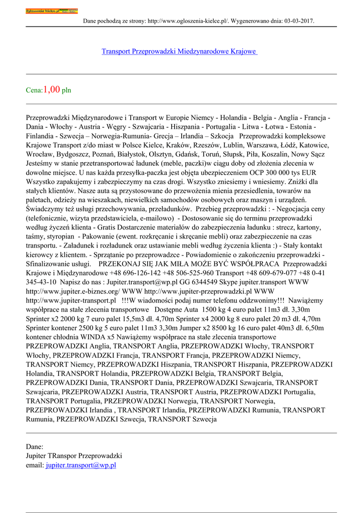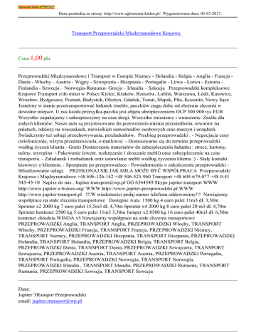 Dane pochodzą ze strony: http://www.ogloszenia-kielce.pl/. Wygenerowano dnia: 03-03-2017. Transport Przeprowadzki Miedzynarodowe Krajowe Cena:1,00 pln Przeprowadzki Międzynarodowe i Transport w Europie Niemcy - Holandia - Belgia - Anglia - Francja Dania - Włochy - Austria - Węgry - Szwajcaria - Hiszpania - Portugalia - Litwa - Łotwa - Estonia Finlandia - Szwecja – Norwegia-Rumunia- Grecja – Irlandia – Szkocja Przeprowadzki kompleksowe Krajowe Transport z/do miast w Polsce Kielce, Kraków, Rzeszów, Lublin, Warszawa, Łódź, Katowice, Wrocław, Bydgoszcz, Poznań, Białystok, Olsztyn, Gdańsk, Toruń, Słupsk, Piła, Koszalin, Nowy Sącz Jesteśmy w stanie przetransportować ładunek (meble, paczki)w ciągu doby od złożenia zlecenia w dowolne miejsce. U nas każda przesyłka-paczka jest objęta ubezpieczeniem OCP 300 000 tys EUR Wszystko zapakujemy i zabezpieczymy na czas drogi. Wszystko zniesiemy i wniesiemy. Zniżki dla stałych klientów. Nasze auta są przystosowane do przewożenia mienia przesiedlenia, towarów na paletach, odzieży na wieszakach, niewielkich samochodów osobowych oraz maszyn i urządzeń. Świadczymy też usługi przechowywania, przeładunków. Przebieg przeprowadzki : - Negocjacja ceny (telefonicznie, wizyta przedstawiciela, e-mailowo) - Dostosowanie się do terminu przeprowadzki według życzeń klienta - Gratis Dostarczenie materiałów do zabezpieczenia ładunku : strecz, kartony, taśmy, styropian - Pakowanie (ewent. rozkręcanie i skręcanie mebli) oraz zabezpieczenie na czas transportu. - Załadunek i rozładunek oraz ustawianie mebli według życzenia klienta :) - Stały kontakt kierowcy z klientem. - Sprzątanie po przeprowadzce - Powiadomienie o zakończeniu przeprowadzki Sfinalizowanie usługi. PRZEKONAJ SIĘ JAK MIŁA MOŻE BYĆ WSPÓŁPRACA Przeprowadzki Krajowe i Międzynarodowe +48 696-126-142 +48 506-525-960 Transport +48 609-679-077 +48 0-41 345-43-10 Napisz do nas : [email protected] GG 6344549 Skype jupiter.transport WWW http://www.jupiter.e-biznes.org/ WWW http://www.jupiter-przeprowadzki.pl WWW http://www.jupiter-transport.pl !!!W wiadomości podaj numer telefonu oddzwonimy!!! Nawiążemy współprace na stałe zlecenia transportowe Dostępne Auta 1500 kg 4 euro palet 11m3 dł. 3,30m Sprinter x2 2000 kg 7 euro palet 15,5m3 dł. 4,70m Sprinter x4 2000 kg 8 euro palet 20 m3 dł. 4,70m Sprinter kontener 2500 kg 5 euro palet 11m3 3,30m Jumper x2 8500 kg 16 euro palet 40m3 dł. 6,50m kontener chłodnia WINDA x5 Nawiążemy współprace na stałe zlecenia transportowe PRZEPROWADZKI Anglia, TRANSPORT Anglia, PRZEPROWADZKI Włochy, TRANSPORT Włochy, PRZEPROWADZKI Francja, TRANSPORT Francja, PRZEPROWADZKI Niemcy, TRANSPORT Niemcy, PRZEPROWADZKI Hiszpania, TRANSPORT Hiszpania, PRZEPROWADZKI Holandia, TRANSPORT Holandia, PRZEPROWADZKI Belgia, TRANSPORT Belgia, PRZEPROWADZKI Dania, TRANSPORT Dania, PRZEPROWADZKI Szwajcaria, TRANSPORT Szwajcaria, PRZEPROWADZKI Austria, TRANSPORT Austria, PRZEPROWADZKI Portugalia, TRANSPORT Portugalia, PRZEPROWADZKI Norwegia, TRANSPORT Norwegia, PRZEPROWADZKI Irlandia , TRANSPORT Irlandia, PRZEPROWADZKI Rumunia, TRANSPORT Rumunia, PRZEPROWADZKI Szwecja, TRANSPORT Szwecja Dane: Jupiter TRanspor Przeprowadzki email: [email protected] Dane pochodzą ze strony: http://www.ogloszenia-kielce.pl/. Wygenerowano dnia: 03-03-2017. telefon: 696-126-142 Miejscowość: Kielce ulica: WArszawska