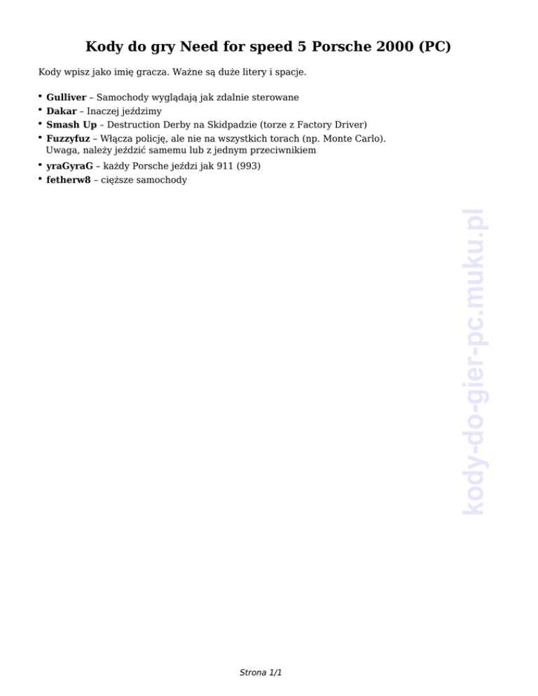 Kody do gry Need for speed 5 Porsche 2000 (PC) Kody wpisz jako imię gracza. Ważne są duże litery i spacje. ● Gulliver – Samochody wyglądają jak zdalnie sterowane ● Dakar – Inaczej jeździmy ● Smash Up – Destruction Derby na Skidpadzie (torze z Factory Driver) ● Fuzzyfuz – Włącza policję, ale nie na wszystkich torach (np. Monte Carlo). Uwaga, należy jeździć samemu lub z jednym przeciwnikiem yraGyraG – każdy Porsche jeździ jak 911 (993) ● fetherw8 – cięższe samochody kody-do-gier-pc.muku.pl ● Strona 1/1