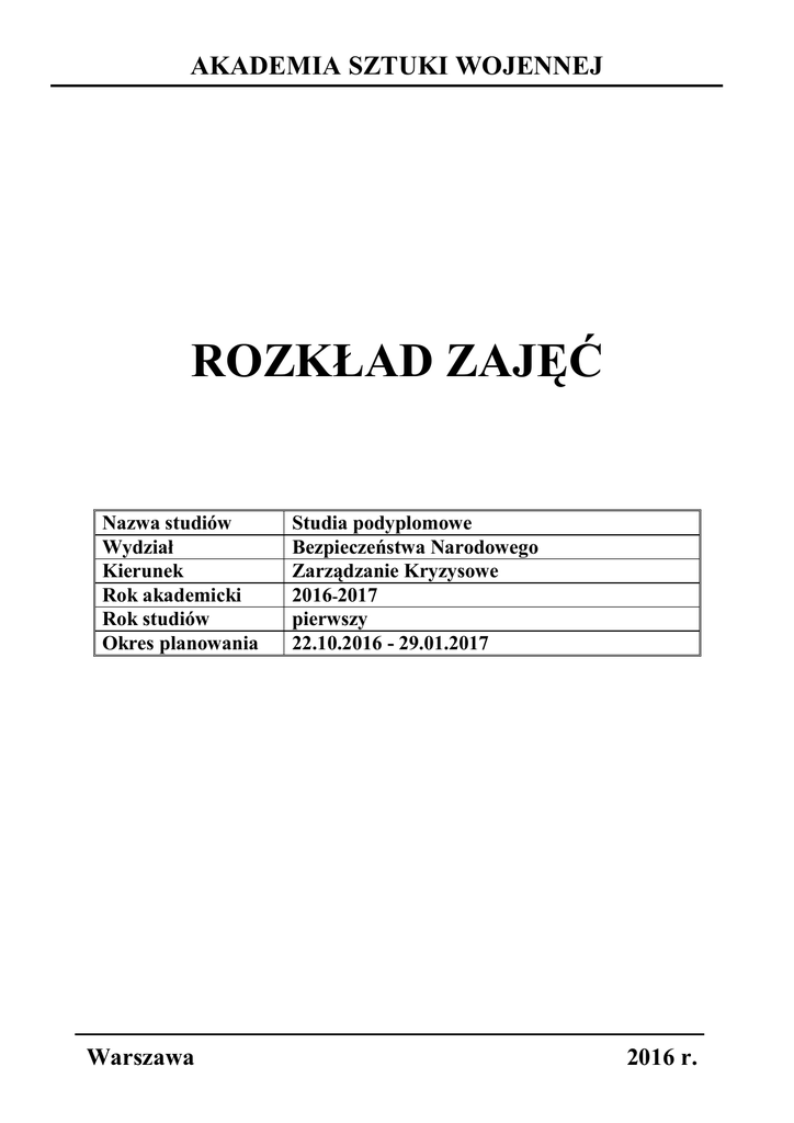 AKADEMIA SZTUKI WOJENNEJ ROZKŁAD ZAJĘĆ Nazwa studiów Wydział Kierunek Rok akademicki Rok studiów Okres planowania Warszawa Studia podyplomowe Bezpieczeństwa Narodowego Zarządzanie Kryzysowe 2016-2017 pierwszy 22.10.2016 - 29.01.2017 2016 r. Supergrupa P/ZK-16-1Z-a w dniach od 22-10-2016 do 29-01-2017 Daty zajęć Dzień Od Do Sala Przedmiot Wykładowca Status 22/10 22/10 22/10 22/10 23/10 23/10 26/11 26/11 26/11 27/11 27/11 27/11 27/11 17/12 17/12 17/12 17/12 18/12 18/12 18/12 14/01 14/01 14/01 14/01 15/01 15/01 15/01 15/01 15/01 28/01 28/01 28/01 28/01 29/01 29/01 29/01 So So So So Ni Ni So So So Ni Ni Ni Ni So So So So Ni Ni Ni So So So So Ni Ni Ni Ni Ni So So So So Ni Ni Ni 08:00 09:45 11:30 13:15 08:00 11:30 08:00 09:45 13:15 08:00 11:30 13:15 15:45 08:00 09:45 11:30 15:45 08:00 11:30 13:15 08:00 11:30 13:15 17:30 08:00 09:45 11:30 13:15 15:45 08:00 09:45 11:30 13:15 08:00 11:30 13:15 09:30 11:15 13:00 14:45 11:15 14:45 09:30 13:00 17:15 11:15 13:00 14:45 17:15 09:30 11:15 14:45 19:00 11:15 13:00 17:15 11:15 13:00 17:15 19:00 09:30 11:15 13:00 14:45 17:15 09:30 11:15 13:00 14:45 11:15 13:00 17:15 25/203 25/203 25/203 25/203 25/220 25/203 56/rycer 56/rycer 56/rycer 56/rycer 56/rycer 56/rycer 56/rycer 56/rycer 56/rycer 56/rycer 56/rycer 56/rycer 56/rycer 56/rycer 56/rycer 56/rycer 56/rycer 56/rycer 56/rycer 56/rycer 56/rycer 56/rycer 56/rycer 56/rycer 56/rycer 56/rycer 56/rycer 56/rycer 56/rycer 56/rycer Analiza systemowa sytuacji kryzysowych Analiza systemowa sytuacji kryzysowych Ochrona ludności i ratownictwo Ochrona ludności i ratownictwo Bezpieczeństwo narodowe Zarzadzanie kryzysowe Zarzadzanie kryzysowe Ochrona ludności i ratownictwo Bezpieczeństwo narodowe Zarzadzanie kryzysowe Analiza systemowa sytuacji kryzysowych Zarządzanie kryzysowe w NATO i UE Zarządzanie kryzysowe w NATO i UE Zarzadzanie kryzysowe Zarzadzanie kryzysowe Ochrona ludności i ratownictwo Analiza systemowa sytuacji kryzysowych Bezpieczeństwo narodowe Zarządzanie kryzysowe w NATO i UE Zarzadzanie kryzysowe Zarzadzanie kryzysowe Analiza systemowa sytuacji kryzysowych Bezpieczeństwo narodowe Ochrona ludności i ratownictwo Zarządzanie kryzysowe w NATO i UE Zarządzanie kryzysowe w NATO i UE Ochrona ludności i ratownictwo Ochrona ludności i ratownictwo Zarzadzanie kryzysowe Zarzadzanie kryzysowe Bezpieczeństwo narodowe Bezpieczeństwo narodowe Ochrona ludności i ratownictwo Zarządzanie kryzysowe w NATO i UE Analiza systemowa sytuacji kryzysowych Zarzadzanie kryzysowe dr ŚWIEBODA Halina dr ŚWIEBODA Halina dr hab. MICHAILIUK Bogdan dr hab. MICHAILIUK Bogdan prof. dr hab. PAWŁOWSKI Jacek prof. dr hab. LIDWA Witold prof. dr hab. LIDWA Witold dr hab. MICHAILIUK Bogdan prof. dr hab. PAWŁOWSKI Jacek prof. dr hab. LIDWA Witold dr ŚWIEBODA Halina prof. dr hab. MARSZAŁEK Maciej prof. dr hab. MARSZAŁEK Maciej prof. dr hab. LIDWA Witold prof. dr hab. LIDWA Witold dr hab. MICHAILIUK Bogdan dr ŚWIEBODA Halina prof. dr hab. PAWŁOWSKI Jacek prof. dr hab. MARSZAŁEK Maciej prof. dr hab. LIDWA Witold prof. dr hab. LIDWA Witold dr ŚWIEBODA Halina prof. dr hab. PAWŁOWSKI Jacek dr hab. MICHAILIUK Bogdan prof. dr hab. MARSZAŁEK Maciej prof. dr hab. MARSZAŁEK Maciej dr hab. MICHAILIUK Bogdan dr hab. MICHAILIUK Bogdan prof. dr hab. LIDWA Witold prof. dr hab. LIDWA Witold prof. dr hab. PAWŁOWSKI Jacek prof. dr hab. PAWŁOWSKI Jacek dr hab. MICHAILIUK Bogdan prof. dr hab. MARSZAŁEK Maciej dr ŚWIEBODA Halina prof. dr hab. LIDWA Witold Wykład Wykład Wykład Ćwiczenia Wykład Wykład Wykład Wykład Seminarium Wykład Wykład Wykład Seminarium Seminarium Ćwiczenia Ćwiczenia Ćwiczenia Wykład Seminarium Ćwiczenia Ćwiczenia Ćwiczenia Seminarium Wykład Seminarium Wykład Ćwiczenia Wykład Ćwiczenia Ćwiczenia Wykład Seminarium Ćwiczenia Ćwiczenia Ćwiczenia Seminarium Ilość Godz. 2 2 2 2 4 4 2 4 4 4 2 2 2 2 2 4 4 4 2 4 4 2 4 2 2 2 2 2 2 2 2 2 2 4 2 4